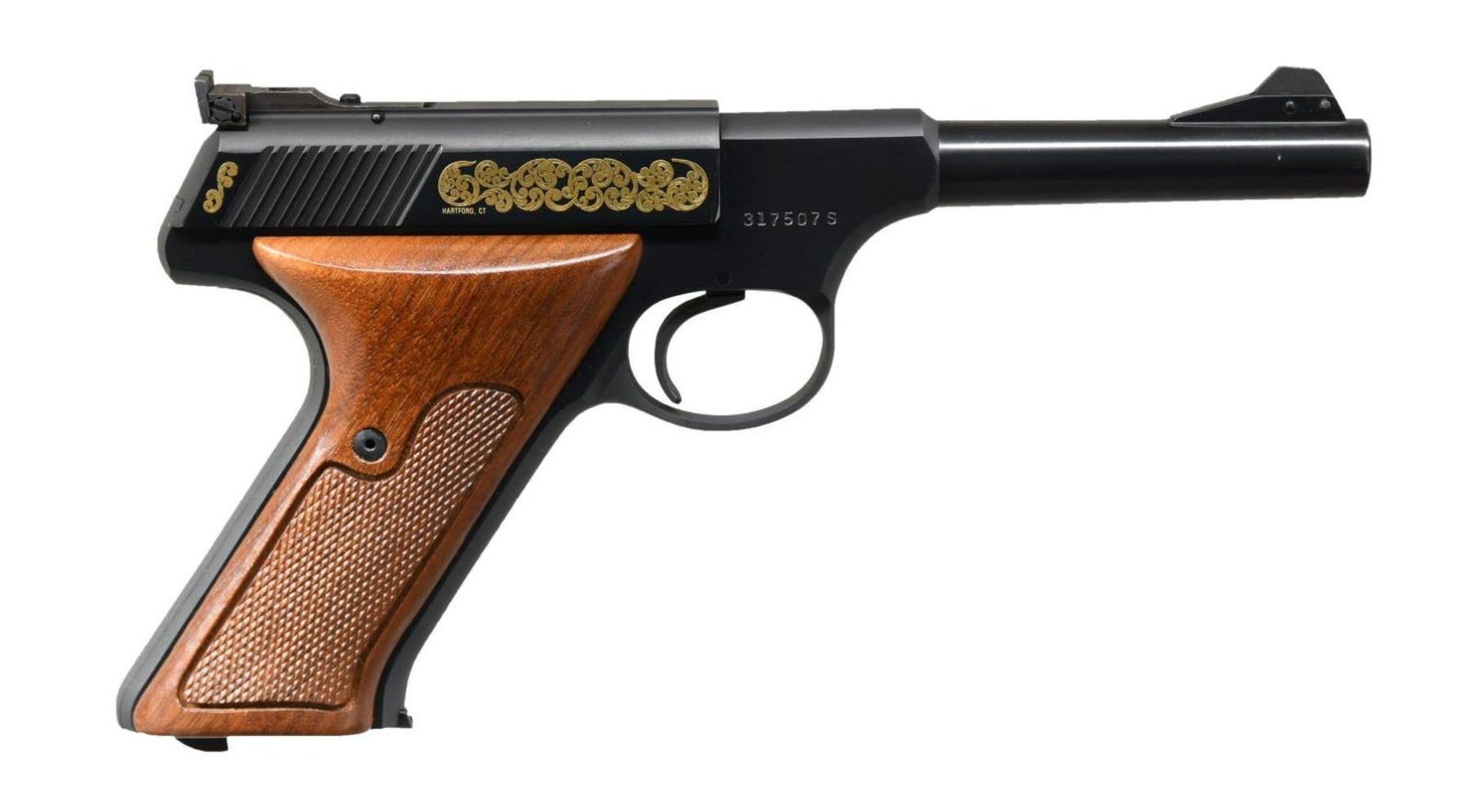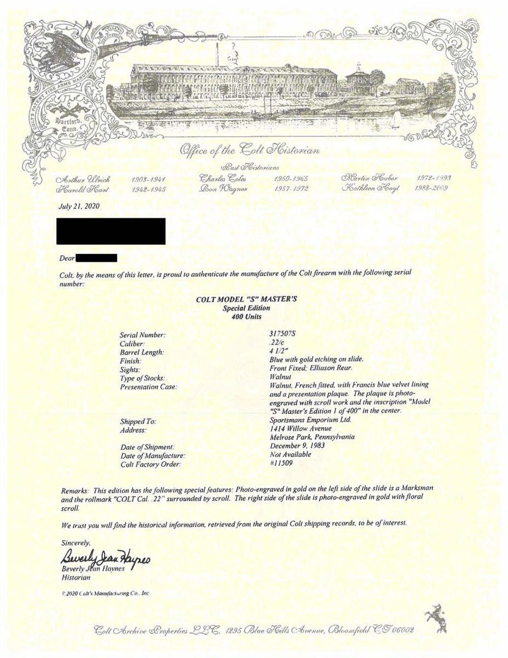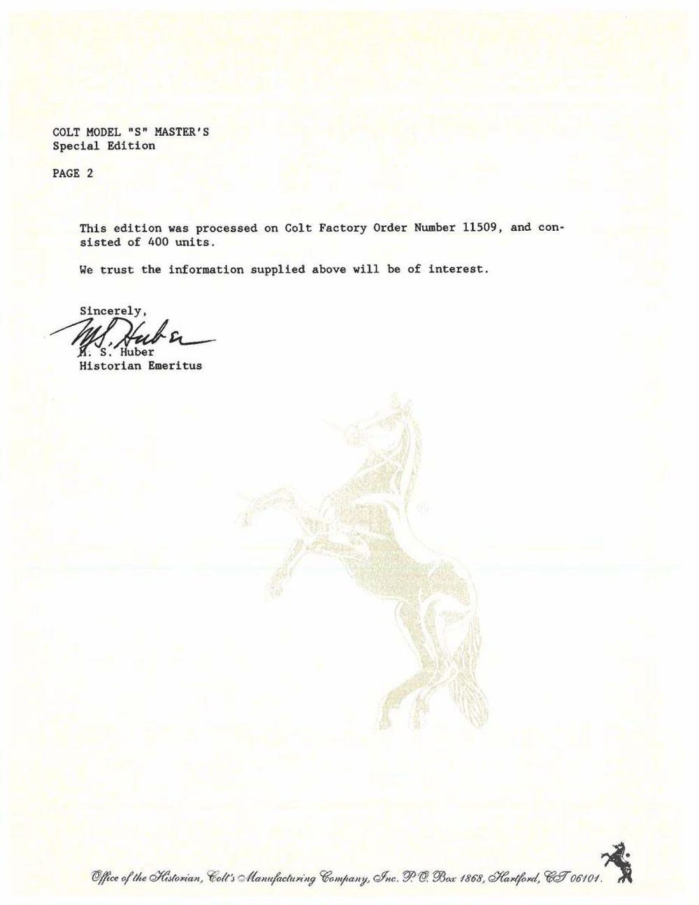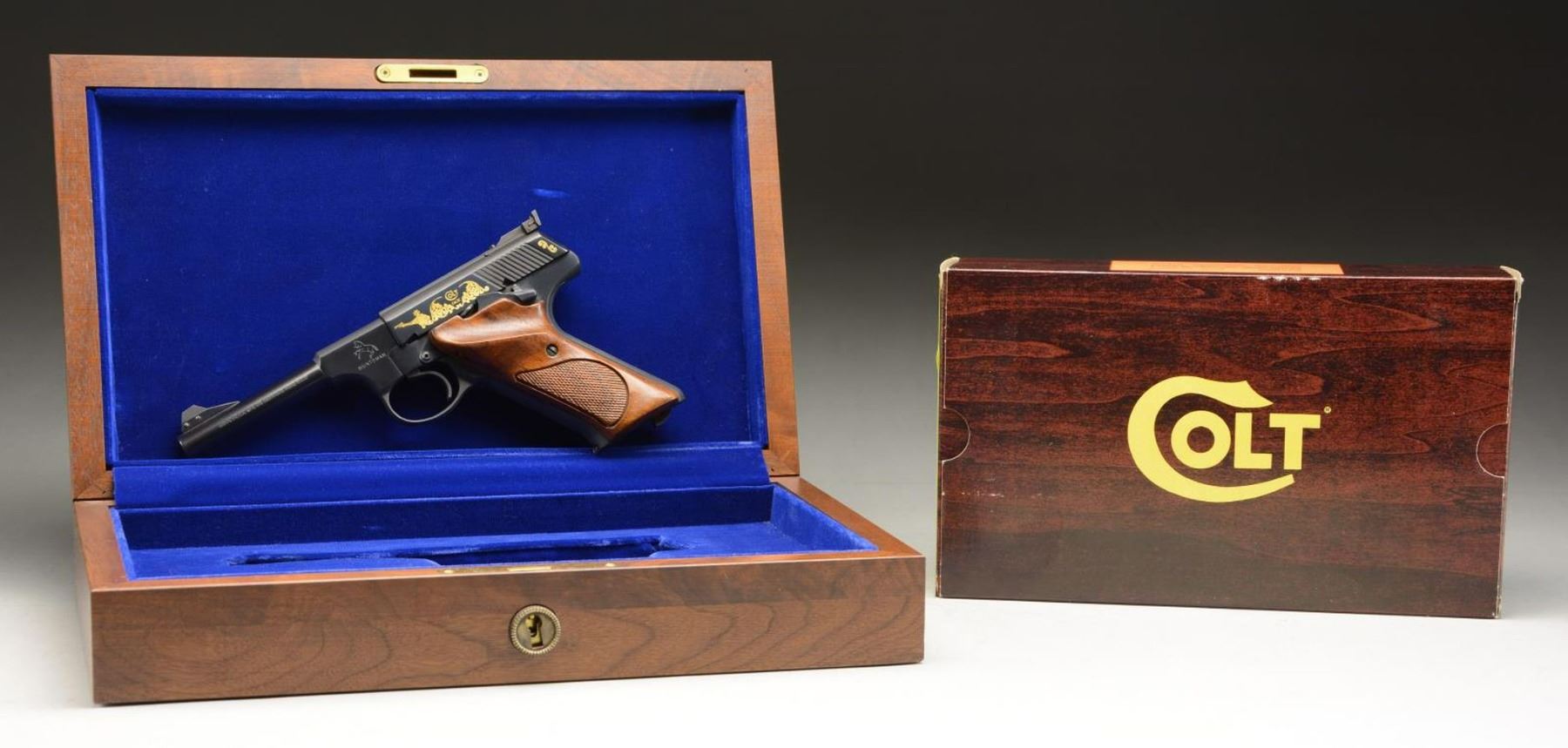 EDITION SEMI-AUTOMATIC PISTOL WITH SHIPPING BOX, BOX, & DISPLAY CASE. Cal. 22 LR. S# 317507S. Bbl 4 1/2". Huntsman Model S Master's Edition manufactured by Colt in 1983. The left side of the barrel is stamped with Colt's single line address, with the Rampant Colt logo above "HUNTSMAN" on the frame. Left side of slide features gold etched marksman followed by light scrollwork surrounding "COLT/ Cal.22", with the right side exhibiting additional gold etched scrollwork. Metal components are blued, with the frame being mounted with 2 piece checkered walnut thumbrest grips. Serrated ramp front sight with Elliason adjustable square notch rear sight. UNATTACHED ACCESSORIES: 2 Colt factory letters (dated 1991 and 2020) indicating that this example was shipped to Sportsmans Emporium Ltd. of Melrose Park, PA on December 9th of 1983, as well as a letter from Robert J. Rayburn of colt22.com indicating that this example is 1 of only 100 of the original 400 Huntsman Model S Master's Edition pistols shipped with a Woodsman Sport Model barrel as compared to the standard Huntsman barrel. Pistol is also accompanied by a shipping box, matching factory box, as well as an original wood factory display case exhibiting a plaque on the lid reading "MODEL S/ Master's Edition/ 1 of 400" and featuring a blue velvet interior. CONDITION: metal components retain bountiful amounts of their original factory blue finish, exhibiting few superficial marks from handling and storage. Mirror bore, exhibiting well defined rifling throughout. Grips are very good overall. Box and display case are excellent. A extremely fine example of a scarce Colt Huntsman Model S Master's Edition pistol. (23-1783/MLW). MODERN. $1,800-2,400.
