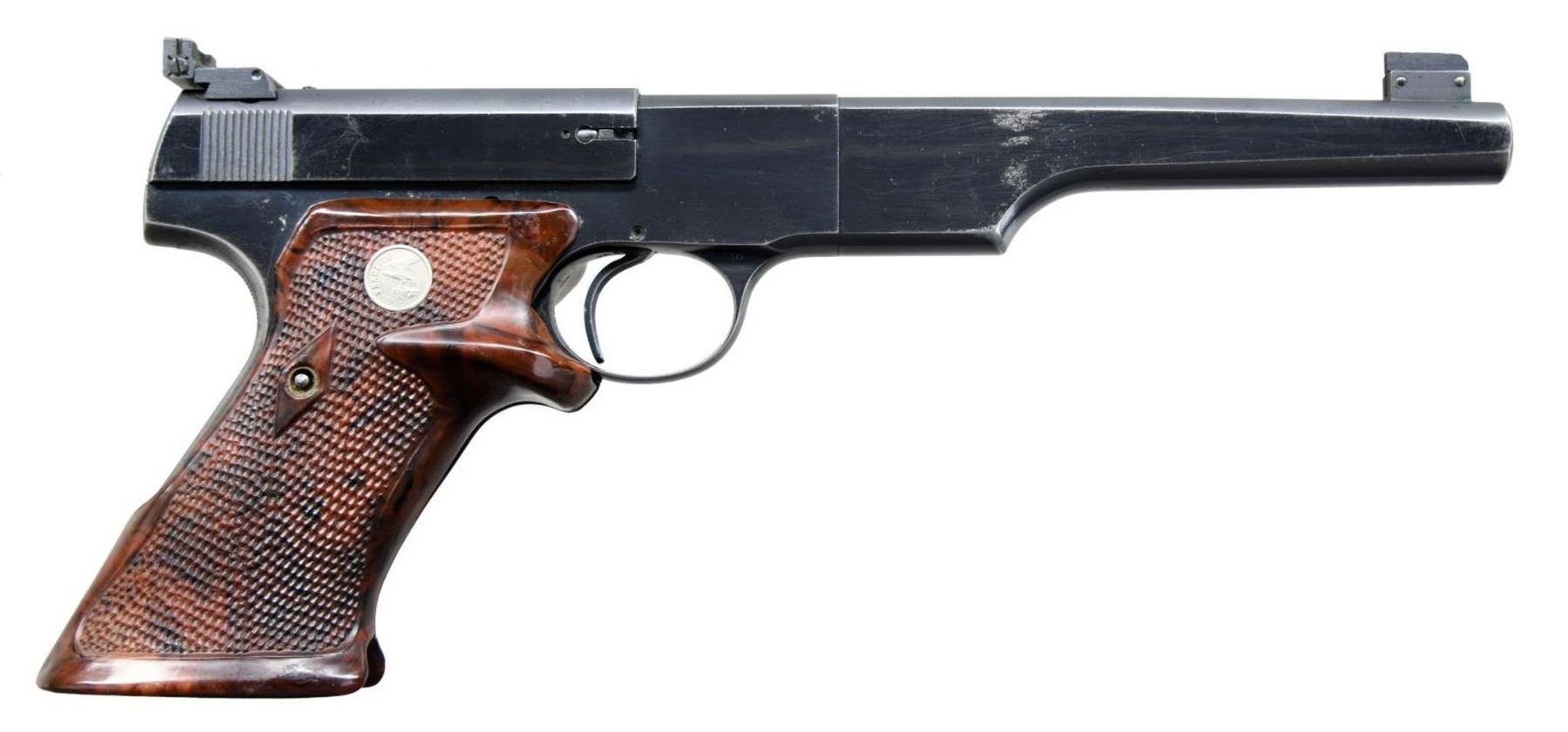SEMI-AUTOMATIC PISTOL. Cal. 22 LR. S# MT1832. Bbl 6 5/8". First year production Woodsman Match Target manufactured by Colt in 1938. The left side of the barrel is marked "MATCH/ (BULLSEYE)/ TARGET", with Colt's address and patent information across the top. The left side of the frame is marked "THE WOODSMAN", with "COLT" followed by the caliber designation and the Rampant Colt logo on the slide. Metal components are blued, with the frame being mounted with 2 piece checkered mottled brown plastic Franzite medallion grips. Front sight has been replaced with a serrated patridge sight, with the rear sight having been replaced with a Micro adjustable square notch sight. MAGS: 1 10 rnd. CONDITION: metal components retain the majority of their original factory blue finish, exhibiting moderate wear and superficial marks from handling overall that show through to gray patina. Right side of barrel bears some extremely light pitting. Mirror bore, exhibiting good rifling throughout. Grips show some scattered marks from handling and storage, but otherwise remain sturdy and serviceable. (23-1755/MLW). CURIO. $900-1,300.