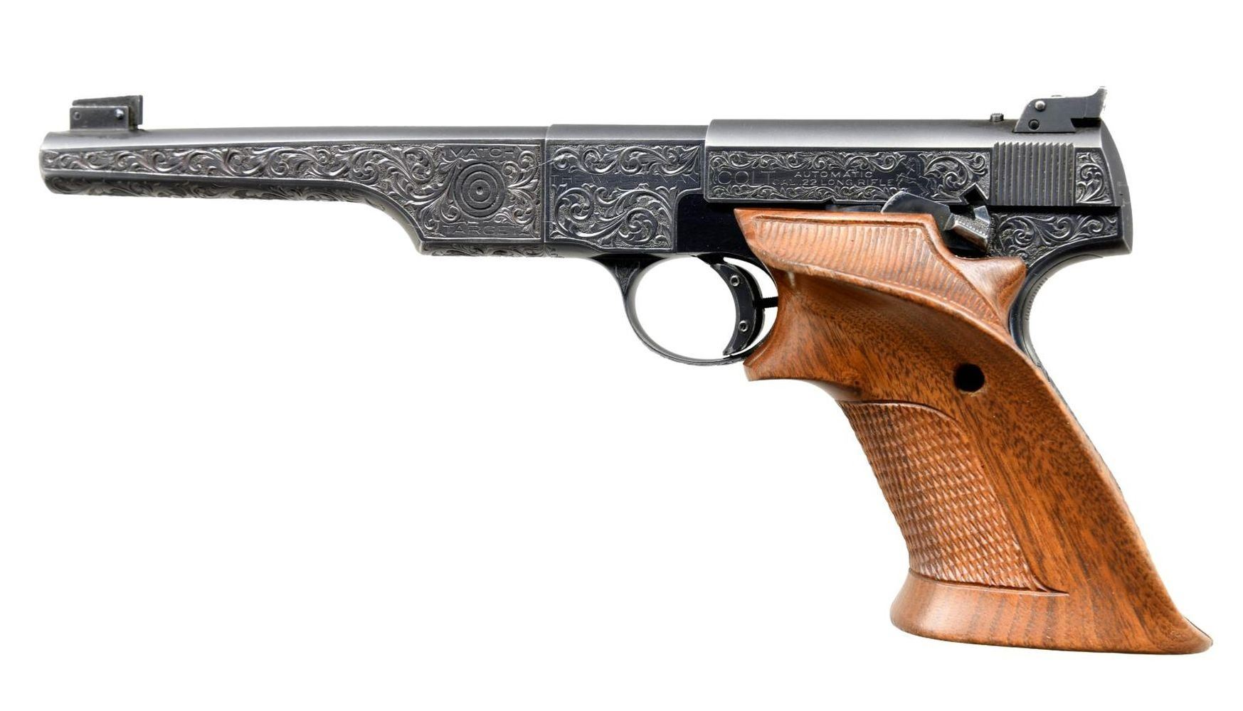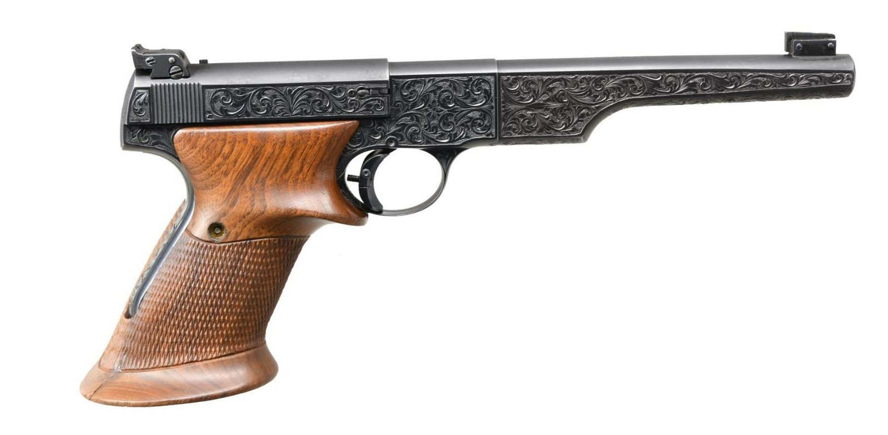 PISTOL. Cal. 22 LR. S#. MT2888. Bbl. 6 5/8". Patridge front with adjustable target rear sight. Sides of bbl., frame & slide have full coverage vine type foliate engraving with stippled backgrounds. Trigger has added wide shoe. Custom thumbrest checkered walnut grips. Mfg. 1938. Mags: 1 two tone detachable 10 rd. CONDITION: over 95% custom reblued finish showing slight edge wear. Grips have a crack along the back . Very good bright bore. (23-4777/DS). CURIO. $2000-3000.