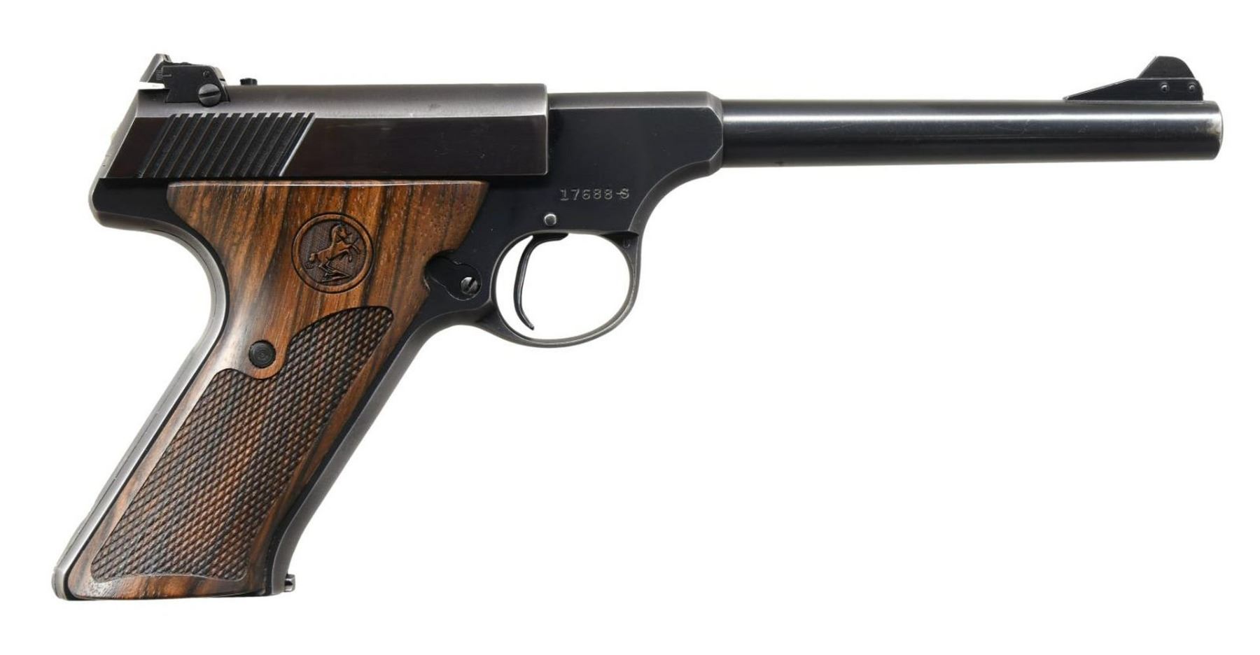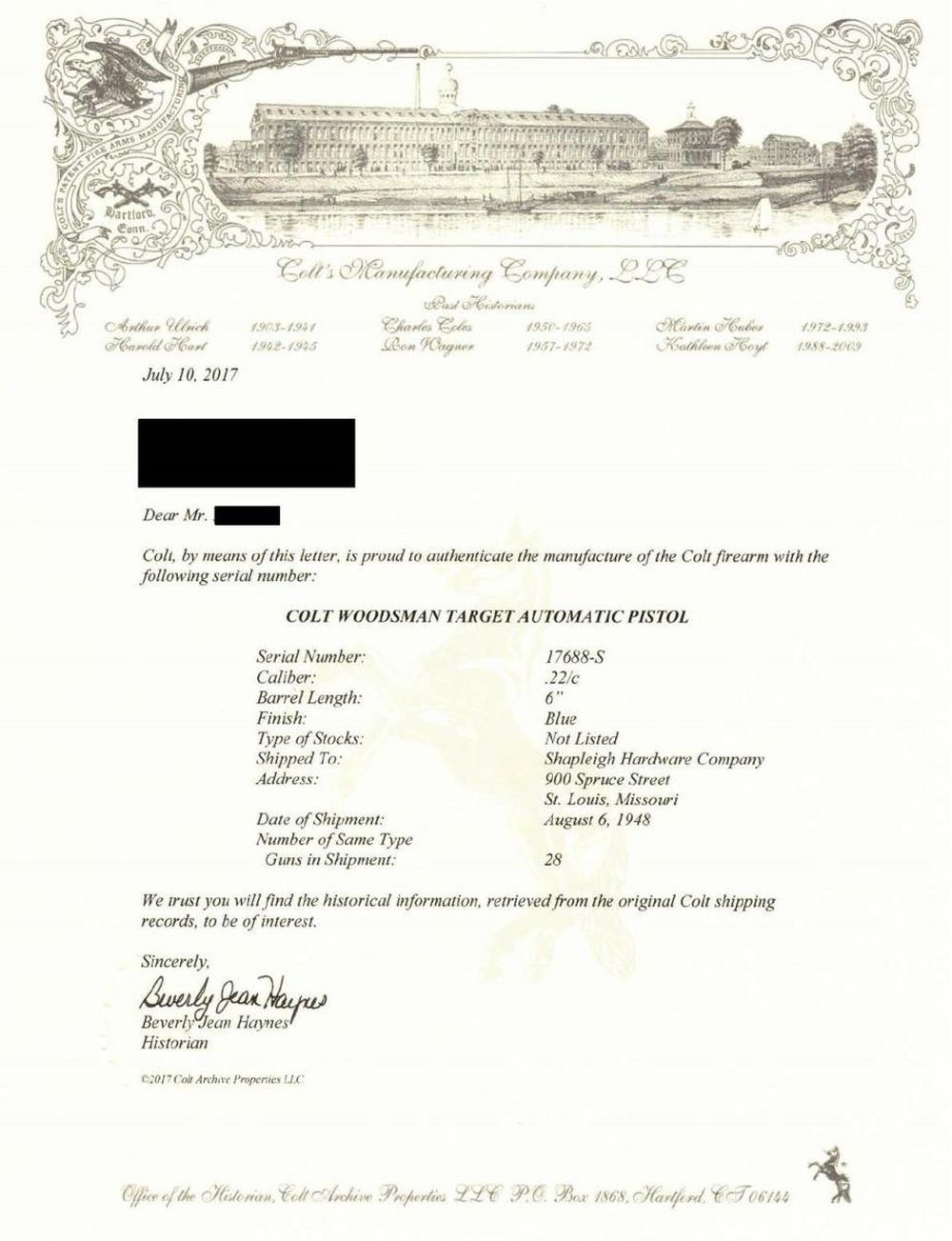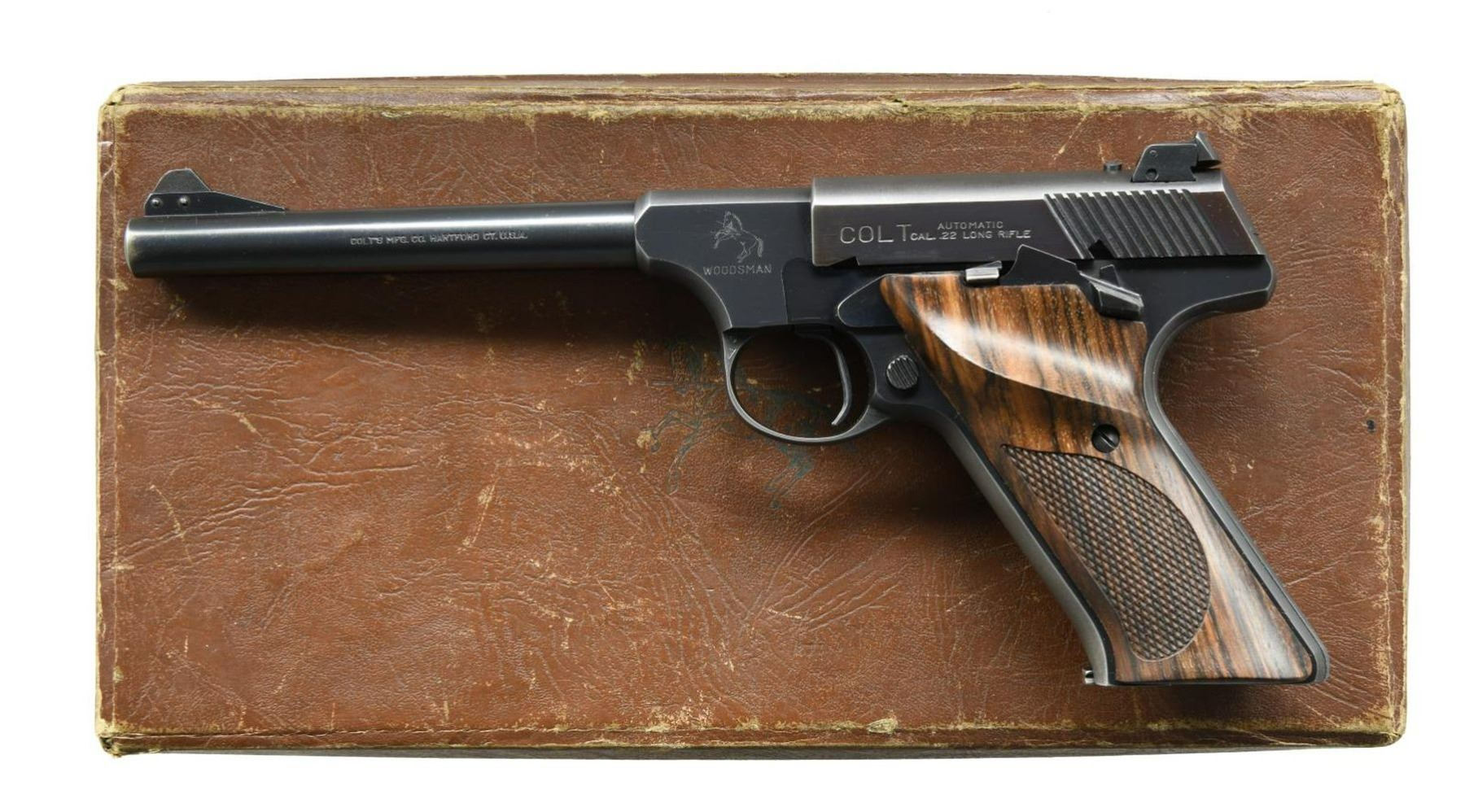 SEMI-AUTOMATIC PISTOL WITH BOX & FACTORY LETTER. Cal. 22 LR. S# 17688-S. Bbl 6". Woodsman manufactured by Colt in 1948. The left side of the barrel is stamped with Colt's single line address, followed by the Rampant Colt logo above "WOODSMAN", with "COLT" and the caliber designation on the left side of the slide. Metal components exhibit a blued finish, with the frame being mounted with 2 piece aftermarket Colt logo checkered wood thumbrest grips. MAGS: 1 10 rnd. UNATTACHED ACCESSORIES: factory box containing the original set of 2 piece Colt checkered brown plastic thumbrest grips, 2 brown plastic rear grip extensions, as well as the manual. Factory letter indicates that this example was included in a shipment of 28 pistols shipped to Shapleigh Hardware Company of St. Louis, MI on August 8th of 1948. CONDITION: good overall, with metal components retaining the majority of their original factory blue finish, exhibiting some spots of mild wear overall, with the grip straps exhibiting wear and thinning through to gray patina. Bright bore, exhibiting good rifling throughout. Aftermarket grips are very good overall. Box shows some exterior wear and some separation at the corners on the lid, but otherwise remains sturdy and serviceable. (23-1788/MLW). CURIO. $700-1,100.