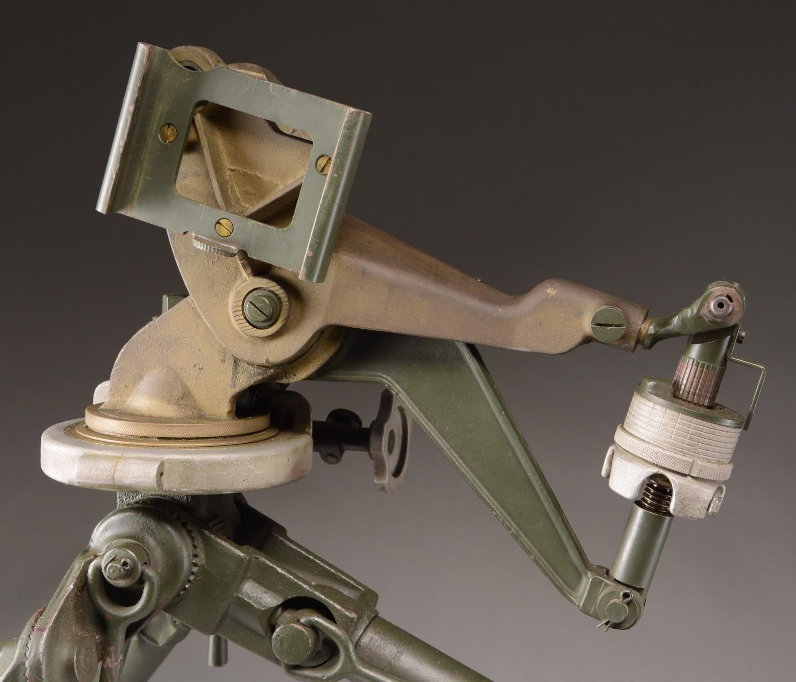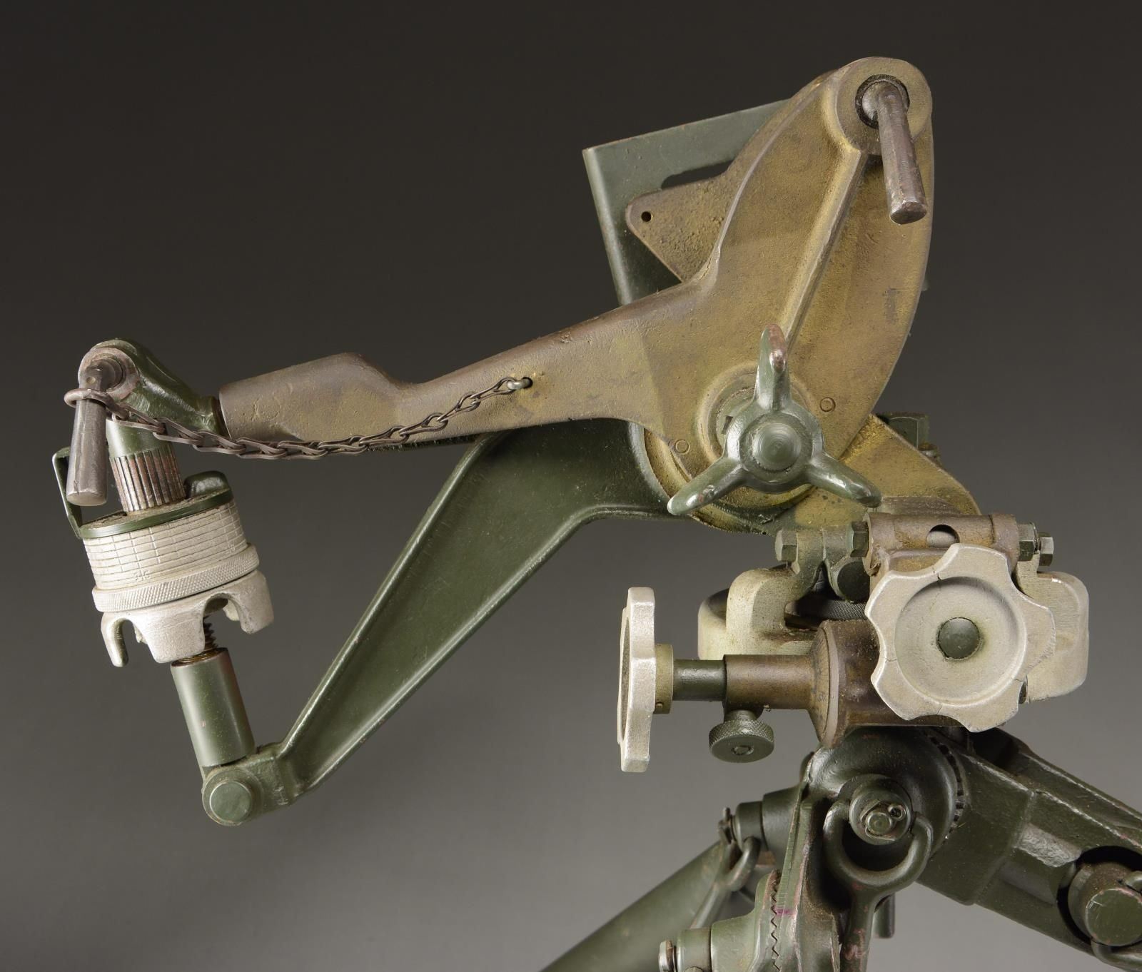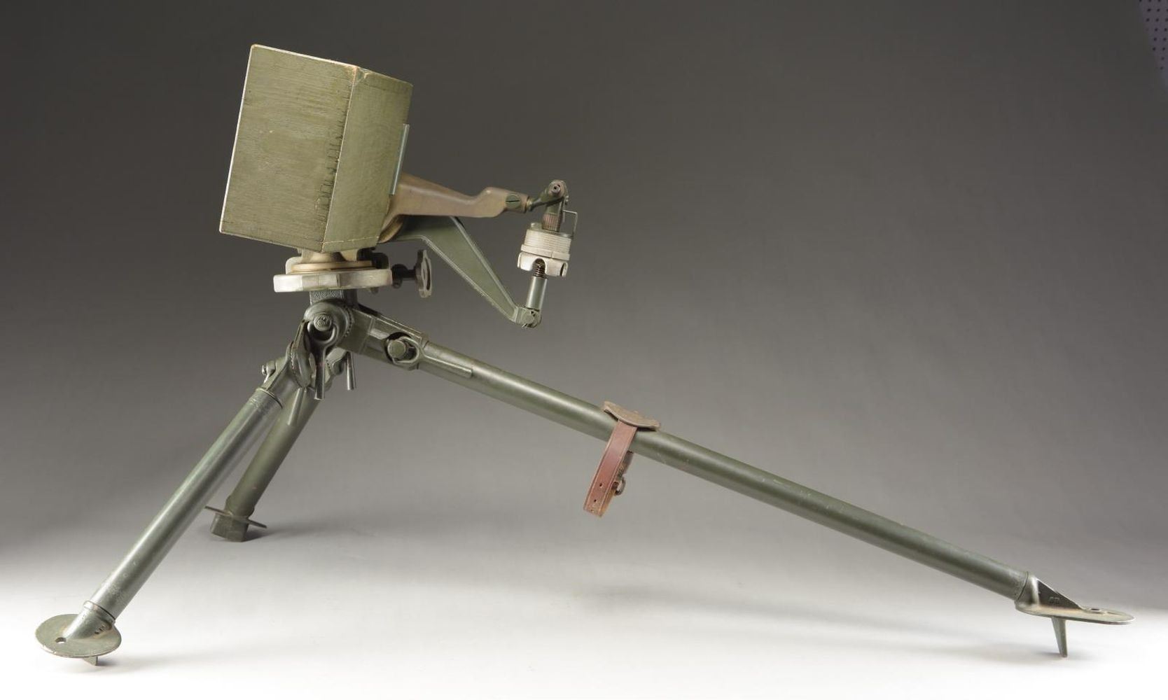The Model of 1918 tripod for the Browning Model of 1917 water cooled machine gun is a very rare accessory to find in the United States. The cradle is a bronze casting and is the intermediate member between the gun and the tripod mechanism. The cradle plays host to a steel bracket to add a Model 1918 wooden belt box, which holds 250 rounds of belted ammunition. This unique tripod has 3 legs & five leg adjustment clamps. The mount allows adjustment in traverse & elevation in both precise, 1 mil adjustments, or adjusted by hand for large adjustments. The rear leg has a 3" long, oval shaped, brass data plate that reads; "MACHINE GUN TRIPOD / MODEL OF 1918 / 8799488 / MANF'D. BY / THE STANDARD EQUIPMENT CO. / CLEVELAND, OHIO U.S.A.". A leather strap attached to the rear leg provides means for strapping the legs together when folded for packing or transportation. UNATTACHED ACCESSORIES: Correct hardwood 1918 ammo box, to hold 250 rd belt. CONDITION: Tripod finished in uniform coverage of olive drab green paint. Brass cradle has naturally aged finish, as well as brass data plate. Leather straps on both tripod & ammo box remain flexible, not dried or cracked. Everything appears to function as intended. (02-19833/JZ). $1,500-2,500.