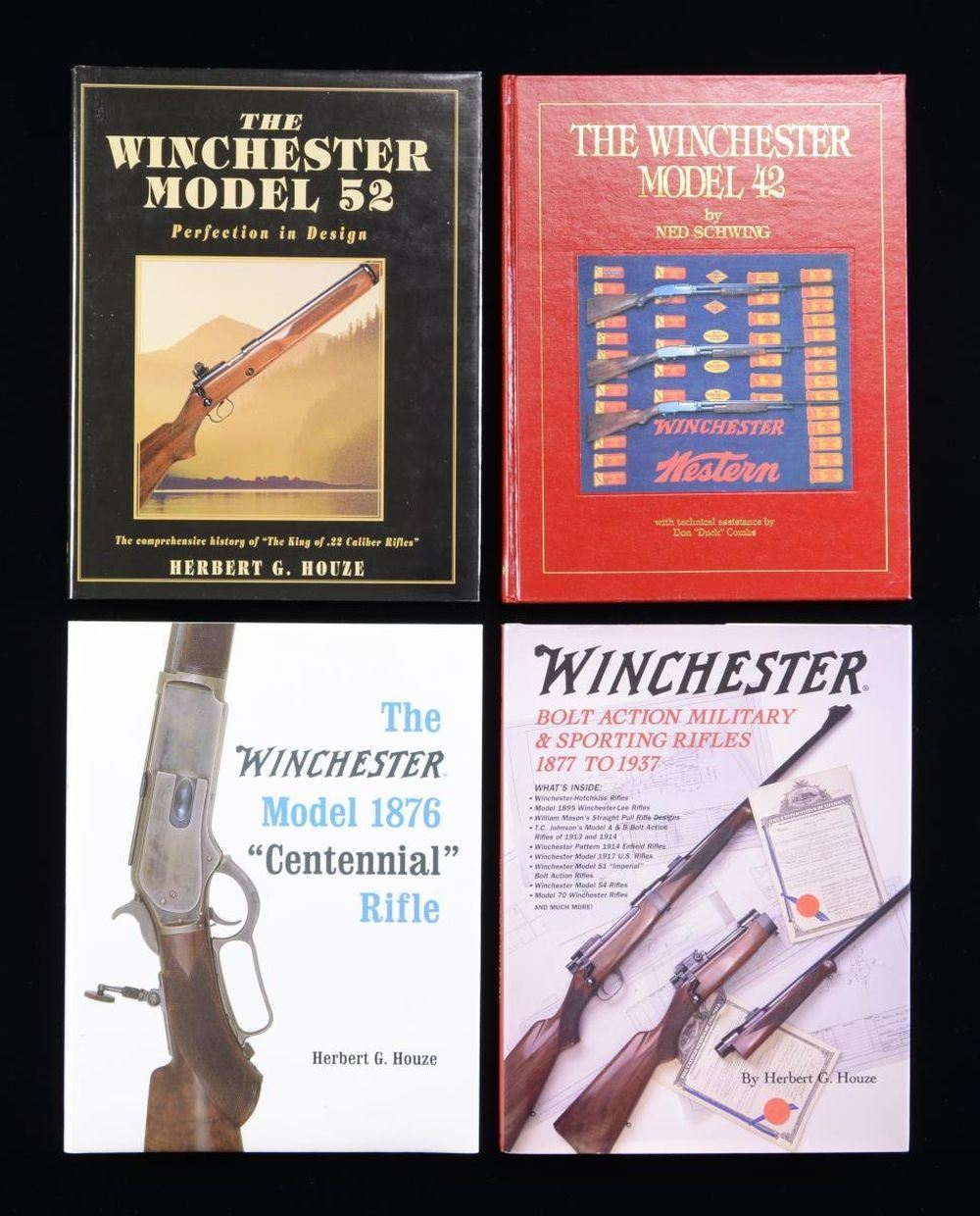 Lot consists of: 1) The Winchester Model 1876 "Centennial" Rifle, by Herbert G. Houze. 2) Winchester Bolt Action Military & Sporting Rifles 1877-1937, by Herbert G. Houze. 3) The Winchester Model 52, by Robert G. Houze. 4) The Winchester Model 42, by Ned Schwing. CONDITION: All are very good, with some minor superficial exterior wear from storage and handling. (02-20171/MLW). $500-1,000.