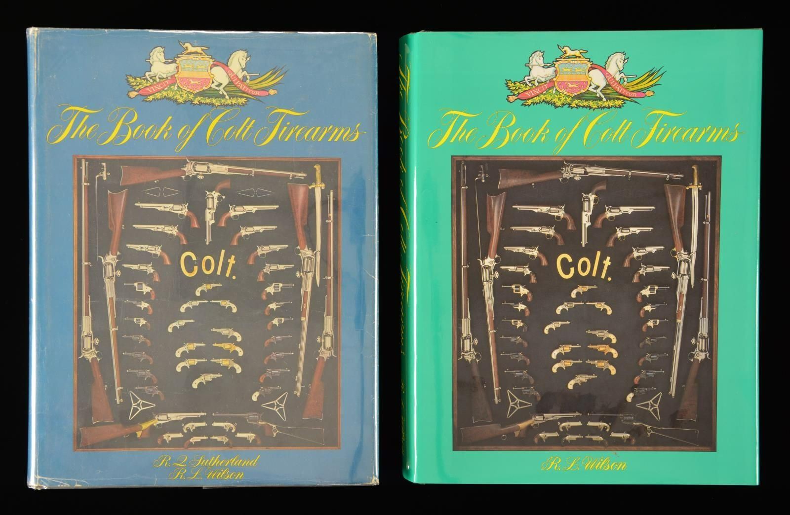 "THE BOOK OF COLT FIREARMS". The first edition was copy righted by Robert Hugh Sutherland in 1971 and was co-authored by the well known R.L. Wilson. This large volume contains an incredible amount of information on Colt firearms and their history. The second volume is an updated version authored by R.L. Wilson and published by Blue Book Publications in 1993. This volume has been updated and expanded to include additional information that has become available since the 1st edition. Both volumes run over 500 hundred pages and are complete w/ dust jackets. CONDITION: both volumes are in very good condition however the Sutherland book has notably more edge wear and very light staining. (02-20880/RW). $400-500.