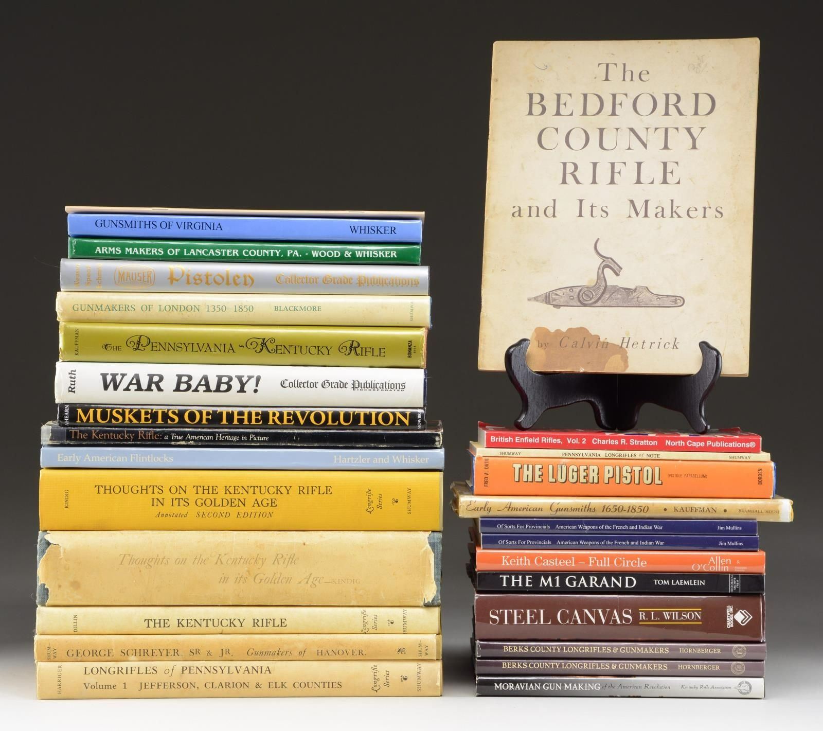 RELATING TO THE AMERICAN KENTUCKY RIFLES. These 28 volumes while relating to handmade early American guns also cover a variety of other subjects. Notable volumes include: 2 Volumes of Thoughts on the Kentucky Rifle & Its Golden Age by Kindig. One is a 1st Edition copyright 1960. The second is a 2nd Edition of The Long RifleSeries. Published in 2002. / The Pennsylvania - Kentucky Rifle by Kauffman. / The Kentucky Rifle by Dillin. / Arms Makers of Lancaster County by Wood & Whisker. / Moravian Gun Making by The Kentucky Rifle Association. / Gunmakers of London 1350-1850 by Blackmore. / War Baby by Larry Roth. / Mauser Pistolen (Collector Grade) by Weaver, Speed & Schmid. / Steel Canvas by R.L. Wilson. / Early American Flintlocks by Hartzler and Whisker. CONDITION: ranges from good to near excellent. Several volumes are paperbound but most are hardback. Books may have wear, staining and torn dust jackets and may be inscribed with the owner's name. (02-19956/RW). $400-800.