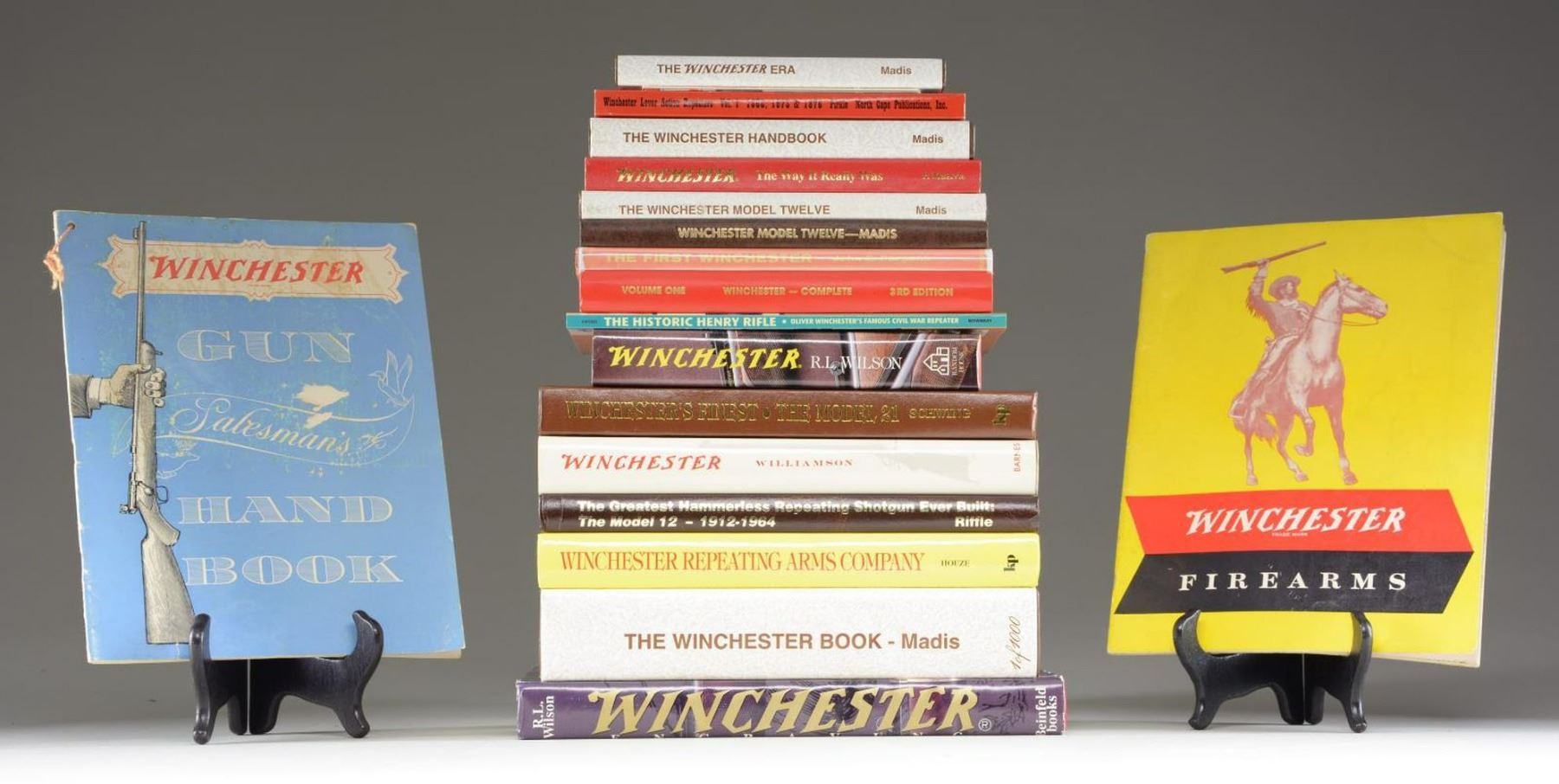 Lot consists of: 1) The Winchester Book 1 of 1000, Madis. 2) Winchester Repeating Arms Company: Its History & Development from 1865-1981, by Herbert G. Houze. 3) The Greatest Hammerless Repeating Shotgun Ever Built: The Model 12 - 1912-1964, by Dave Riffle. 4) Winchester: The Gun That Won the West, by Harold F. Williamson. 5) Winchester's Finest: The Model 21, by Ned Schwing. 6) The Historic Henry Rifle, by Wiley Sword. 7) The Winchester Handbook Vol. I, by Bill West. 8) The Winchester Handbook 1 of 1000, by Madis. 9) The Winchester Era 1 of 1000, by Madis. 10) The Winchester Model Twelve, by Madis. 11) The Winchester Model Twelve 1 of 1000, by Madis. 12) Winchester: The Way It Really Was, by P. Muerrle. 13) Winchester Lever Action Repeating Firearms Vol. I, by Arthur Pirkle. 14) The First Winchester: The Story of the 1866 Repeating Rifle, by John E. Parsons. 15) Winchester: An American Legend, by R.L. Wilson. 16) Winchester Engraving 2nd Edition, by R.L. Wilson. 17) Winchester Gun Salesman's Handbook. 18) Winchester 1952 Catalog. 19) Winchester Model 12 pamphlet. CONDITION: all are good, with mild wear from handling and storage, as well as some small tears on some of the dust covers. (02-20881-2/MLW). $300-500.