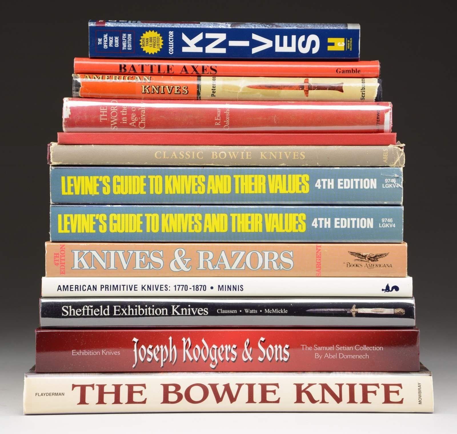 1) The Bowie Knife Unsheathing an American Legend by Norm Flayderman. 2) American Primitive Knives 1770-1870 by Gordon B. Minnis. 3) Sheffield Exhibition Knives by Bill Adams 4) Exhibition Knives Joseph Rodgers & Sons The Samuel Setian Collection by Abel Domenech. 5) 12th Edition Offical Price Guide to Collector Knives. 6) American Knives by Harold Peterson in fair condition. 7) Classic Bowie Knives by Robert Abels in fair condition. 8) I*XL Means I EXCEL by Williams Williamson 9) Battle Axes by James D. Gamble 10) The Sword in the Age of Chivalry by R. Ewart Oakeshott. 11) American Premium Guide to Knives Razors Including Sheath Knives 4th Edition. 12, 13) 2 Copies of Levines Guide to Knives and Their Values, 4th Edition. 14-17) 4 Paper articles on Samuel Bell knives. CONDITION: balance of books in good overall w/ light wear. (02-20881-4/MD). $350-500.
