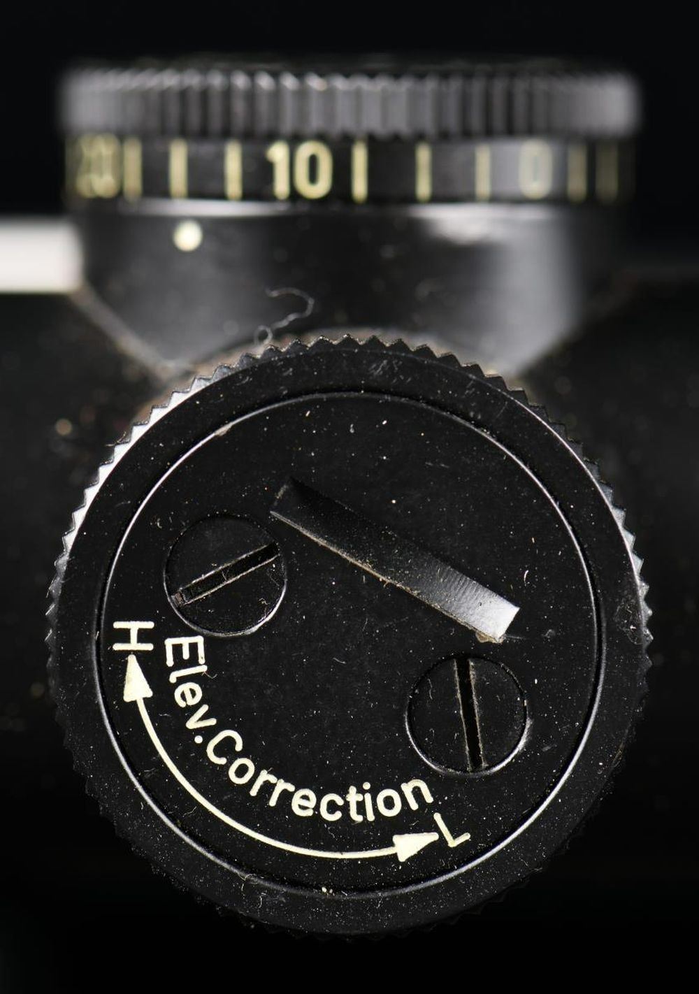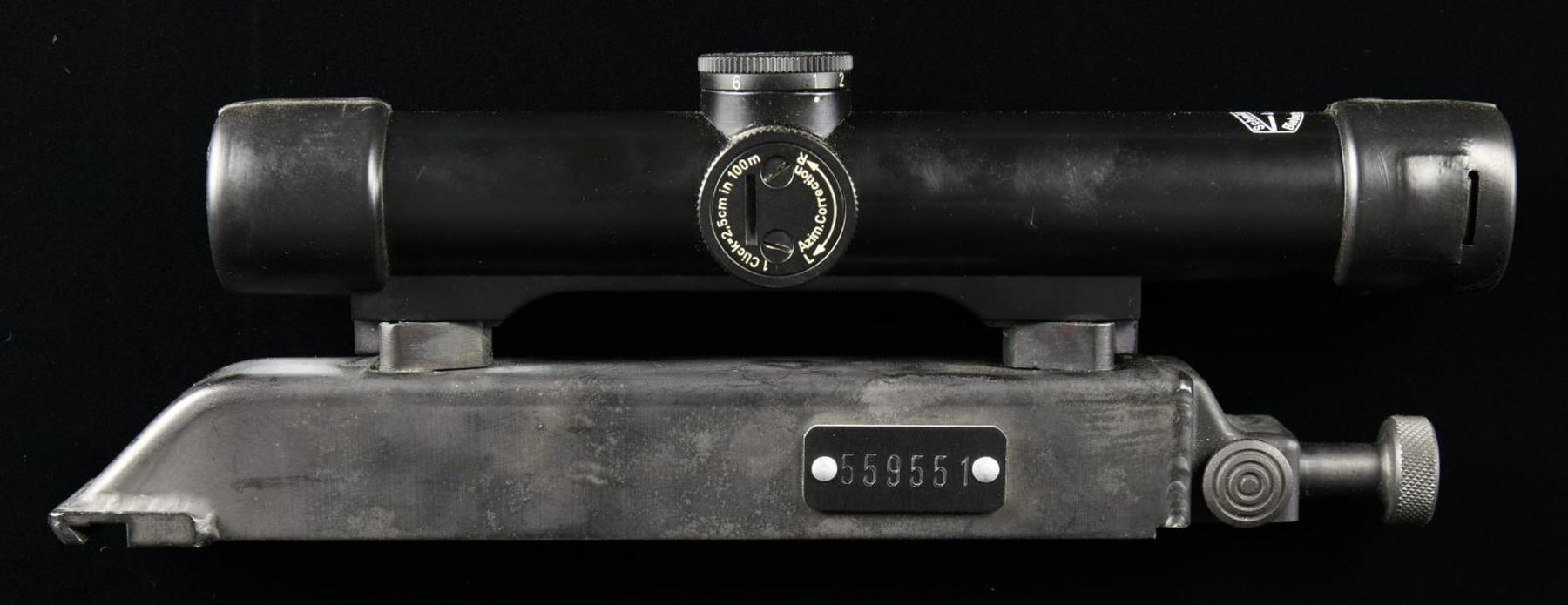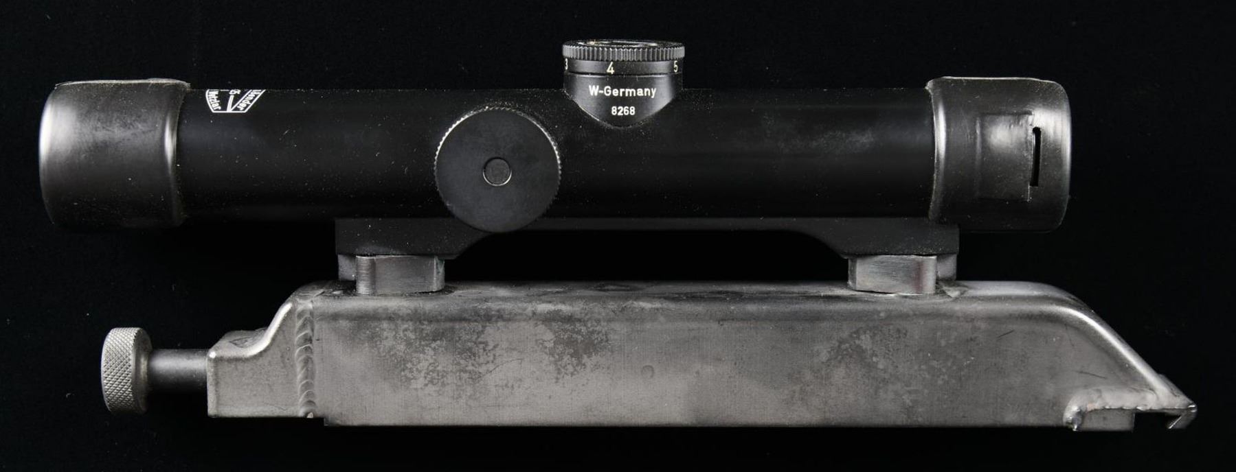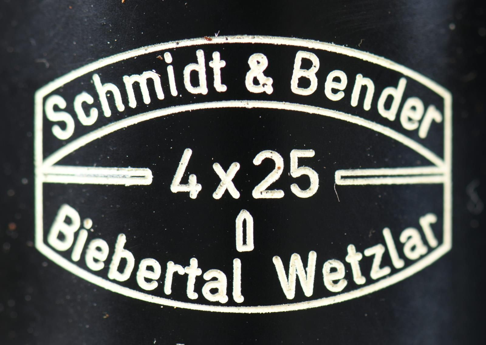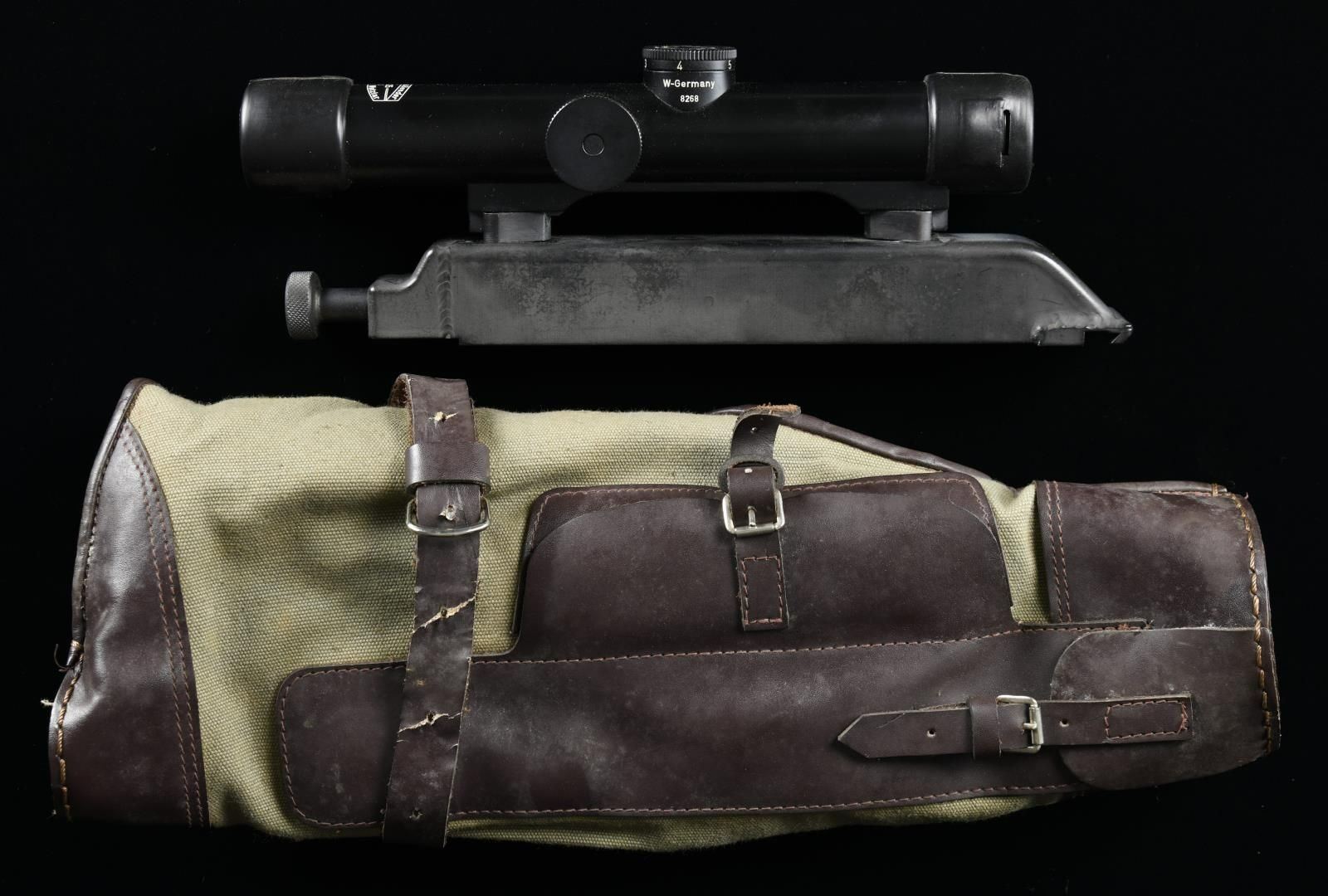 Dark black tube & base w/ parkerized mount. German #4 reticle. Rear of tube marked "Schmidt & Bender / 4 x 25 / Biebertal Wetzlar." Scope base has ID tag "559551". UNATTACHED ACCESSORIES: Green canvas / leather bag. CONDITION: Finish on body enjoys complete & consistent coverage w/ no obvious handling marks. Glass is clear w/ sharp reticle. (02-19987/JZ). $750-1,250.