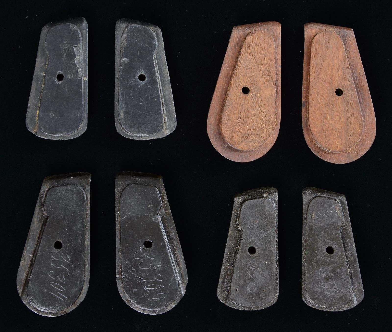 1) Scarce pair of original hard rubber molded pair of grips depicting an angel aiming a C96 at a rampant lion. Interior grips are numbered "35304". Escutcheons are not present. CONDITION: good, with minor nicks and losses around the edges, with a mild loss to the top right of the left panel. 2) Reproduction pair of hard rubber grips with molded foliate designs. Right panel does not retain its escutcheon. CONDITION: good, exhibiting smoothing with some scattered handling marks. 3) Pair of hard rubber molded scroll grips. Screw is not present. Escutcheons are not present. CONDITION: grips show wear, with scattered handling marks and small losses overall. Left grip panel at one time split in half and exhibits adhesive repair. 4) Reproduction checkered wood grips. CONDITION: very good overall, with mild smoothing and a few minor handling marks. (02-16947-3/MLW). $750-1,250.