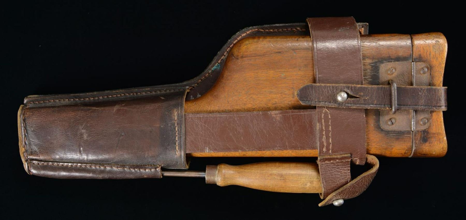 Stock measures 12" in overall length. Unmarked body and lid. Stock iron is numbered "119". Hinge plate with harness loop. Unmarked commercial brown leather harness with cleaning rod. CONDITION: stock exhibits handling marks and some impressions overall, with some mild losses on the left side, slightly below the hinge plate. Interior exhibits a crack that runs behind the hinge plate. Hinge plate and lug exhibit heavy oxidation overall. Harness exhibits scattered marks from handling and storage, with some age related cracking. (02-16945-10/MLW). $600-1,200.