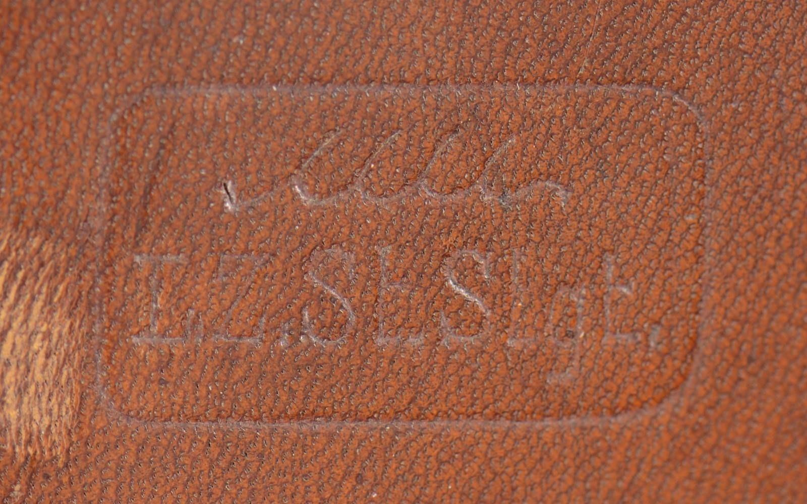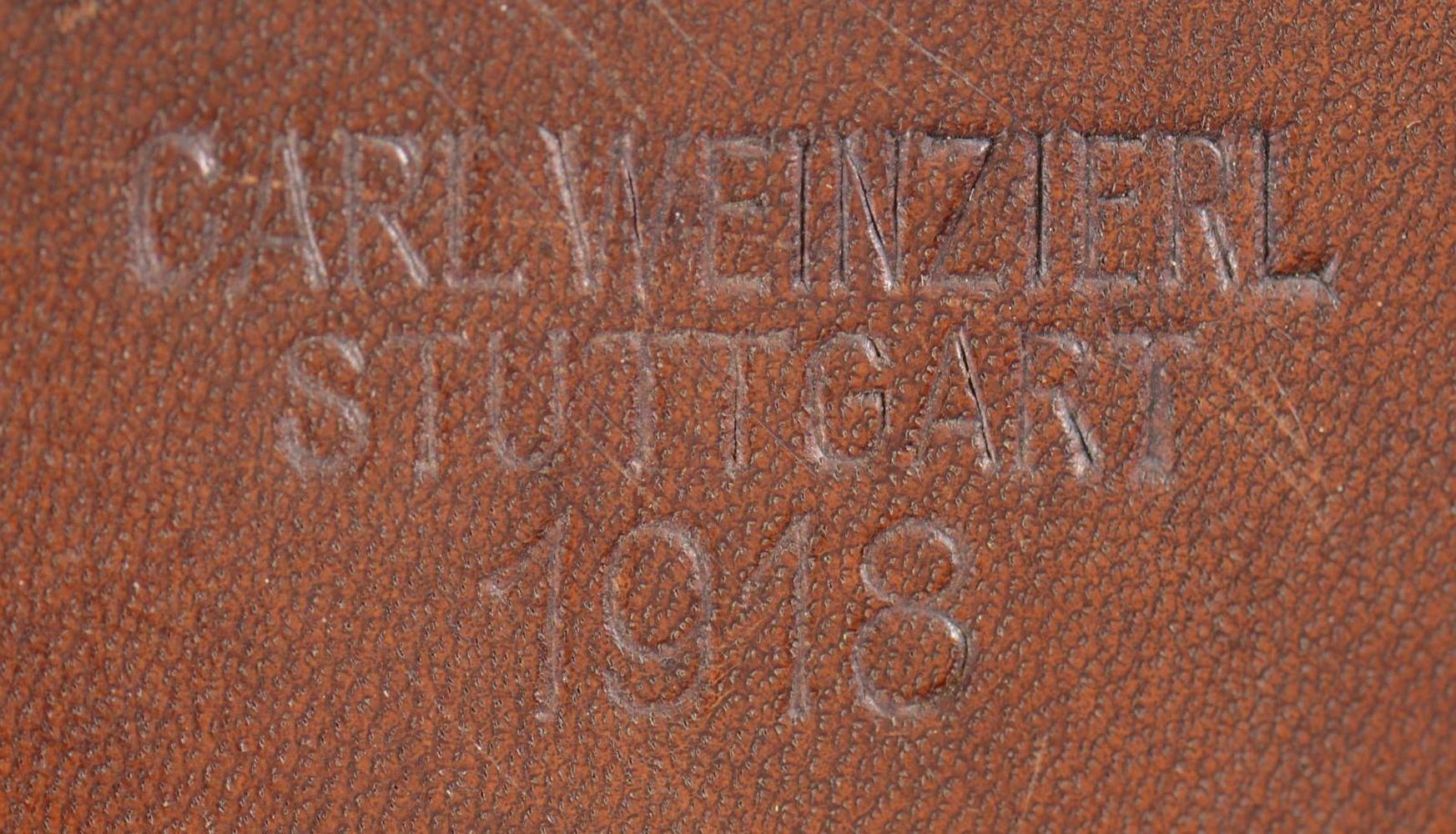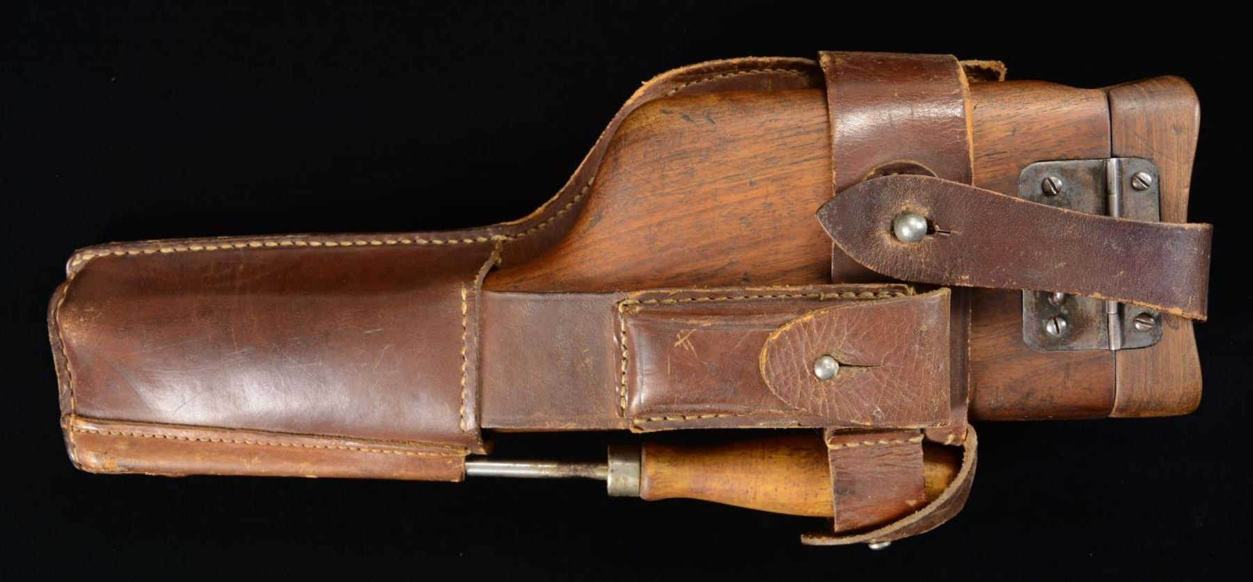 Stock measures 13 1/2" in overall length. Lug has been renumbered and chemically aged. Hinge plate retains its harness loop. Rear is stamped "CARL WEINZIERL/ STUTTGART/ 1918" over a boxed antler proof and "LZ.St.Stgt.". CONDITION: stock exhibits scattered marks and minor impressions from storage and handling, with the varnish having been stripped, several cracks on the body and lid, with the lid having been repaired. Metal components have been cleaned and exhibit a gray patina. Harness exhibits wear, with some age related cracking and crazing, but otherwise remains sturdy and serviceable. (02-16945-7/MLW). $400-800.