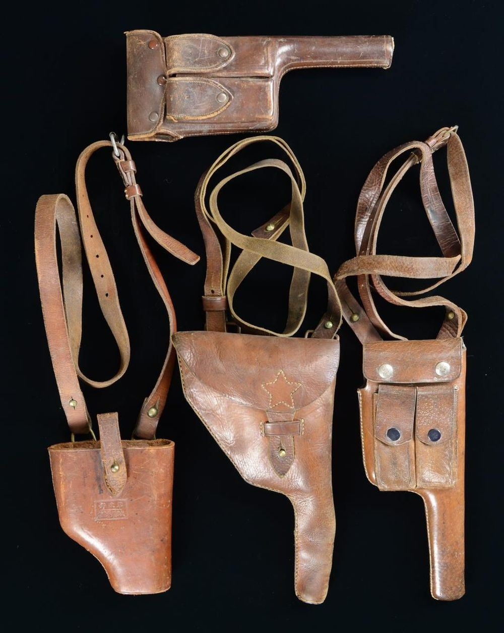 Lot consists of: 1) C96 pattern brown leather holster with shoulder strap. Star stitched pattern on closure flap for strap. Rear features a single leather belt loop, with 2 brass loop reminiscent of a Japanese clamshell holster. CONDITION: leather remains malleable, exhibiting scattered handling marks, some areas of light age related cracking, as well as some areas of crazing. 2) Dark brown leather Chinese pattern C96 holster. 2 cell magazine pouch on front featuring oriental fabric on the interior of the flaps. Rear features 2 brass should strap loops. CONDITION: holster exhibits scattered marks from handling and storage, with areas of crazing overall, but otherwise remains sturdy and serviceable. 3) Brown leather Chinese pattern C96 holster. 2 cell magazine pouch on front, with 2 loops and a leather shoulder strap on rear. Star buttons on closure flap. CONDITION: holster shows scattered marks from handling and storage, with some mild age related cracking overall. 4) C96 leather stock harness, exhibiting boxed Chinese characters on the front, with partial translation appearing to read "Department of Military Affairs" over what appears to indicate manufacturer in the city of Wuchang, 1 of 3 cities that were combined into present day Wuhan. Brown leather shoulder strap. CONDITION: good, with scattered marks form handling and storage, as well as some spots of crazing. (02-16946-9/MLW). $300-500.