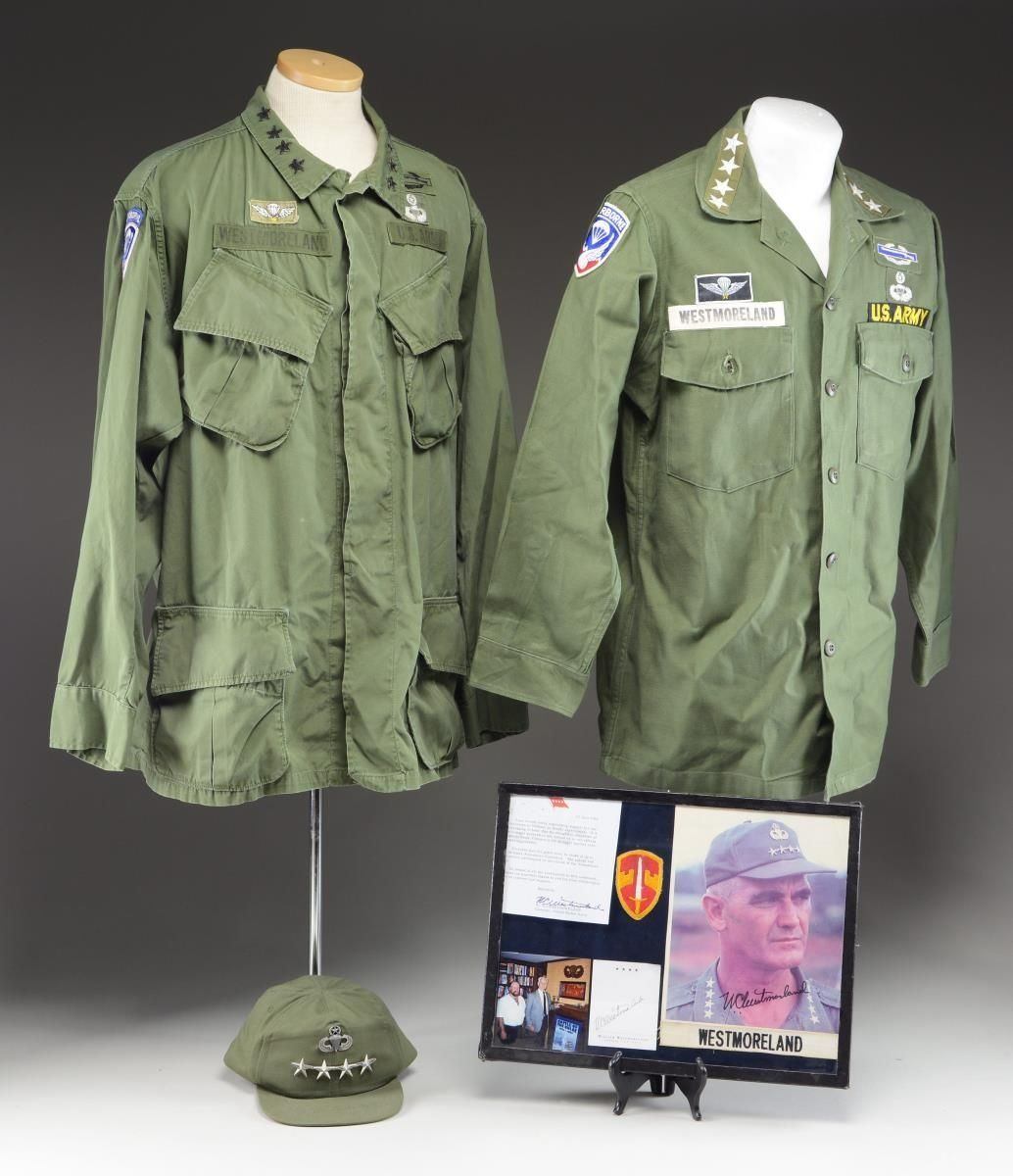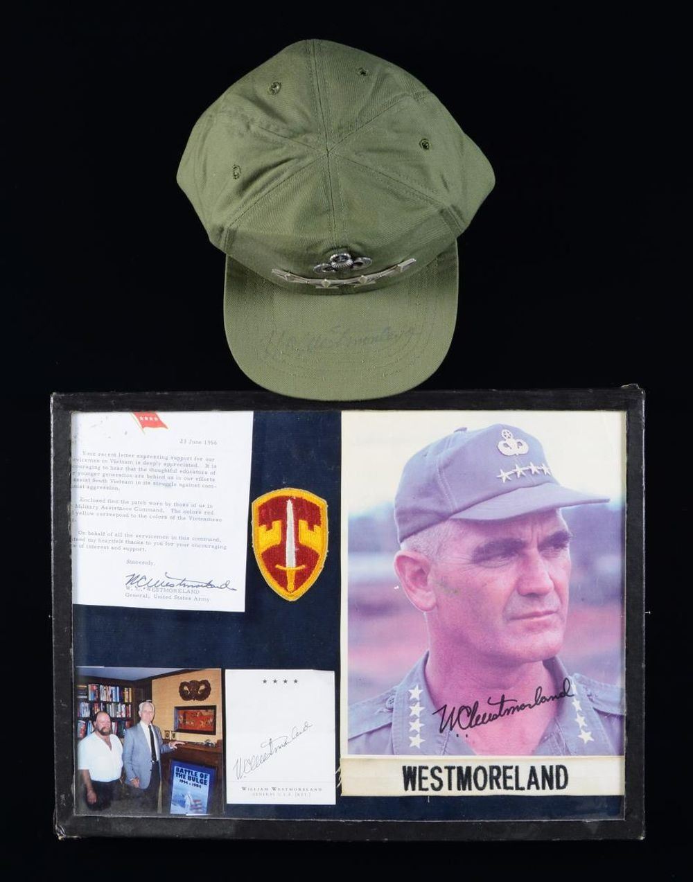 This lot consists of four items relating to General William Westmoreland, the famed commander of US forces in Vietnam from 1964 until 1968. 1. Westmoreland Signed US Army Field Cap. Hot weather US Army field cap size 7 1/8. Brim of hat has faint Westmoreland signature. Crown of hat has Master Parachutist Jump Wings & four star General pin. CONDITION: band shows some crazing, tags have staining & black ink across them. 2. Framed Westmoreland Lot. Frame measures 16" length & 12" in width. Frame has six items: signed photo of the General in uniform, a cloth name tag, a MACV (Military Assistance Command Vietnam) patch, a signed letter from the General dated June 23rd 1966, a signed note on the retired General's stationary & a photo of the General as an older man. CONDITION: frame shows some separation around the edges, scattered staining & light dents. 3. General Westmoreland Tunic. Tunic has two four star collar tabs, a right shoulder 187th Airborne patch, a left shoulder MACV patch, the General's name tag, a combat infantryman patch & two airborne patches. CONDITION: inside tags were removed at some point, tunic otherwise shows some dust staining. 4. Westmoreland Field Jacket. US Army field jacket w/ two four star collar tabs, a right shoulder 187th Airborne patch, a left shoulder MACV patch, the General's name tag, a combat infantryman patch, a US Army patch & two airborne patches. No tags present on inside of jacket. CONDITION: patches show scattered fading & jacket shows some light staining. PROVENANCE: From the Lifelong Collection of Glen E. Mattox. (02-18681/MJC). $2000-3000