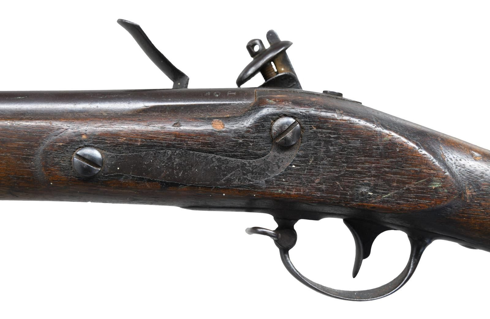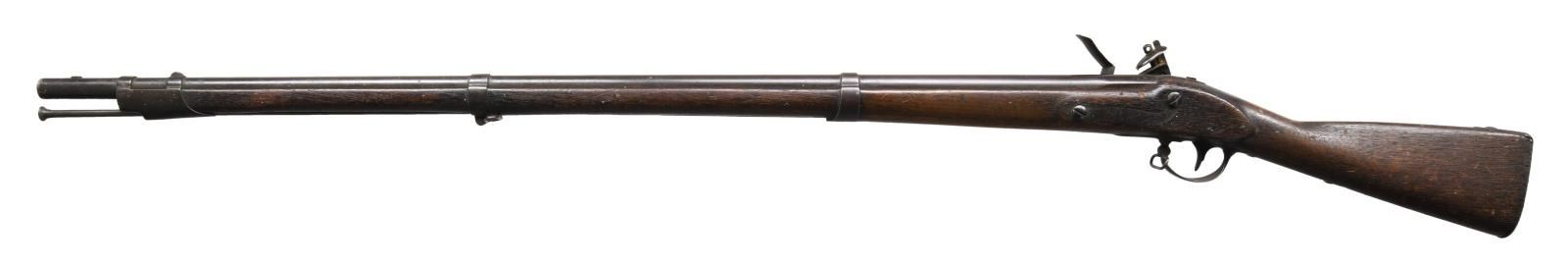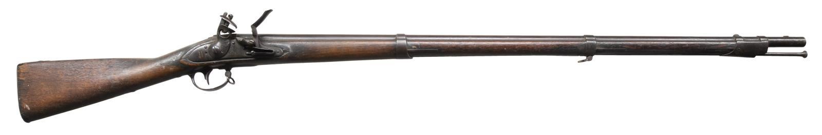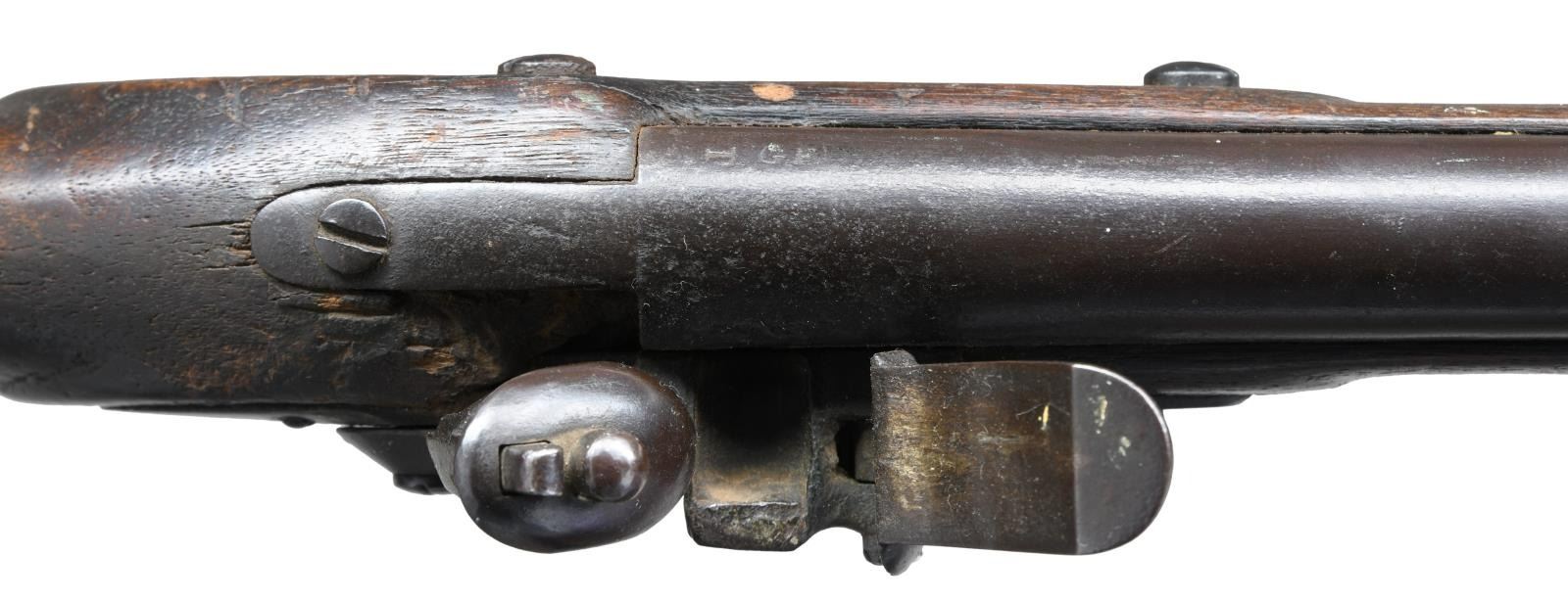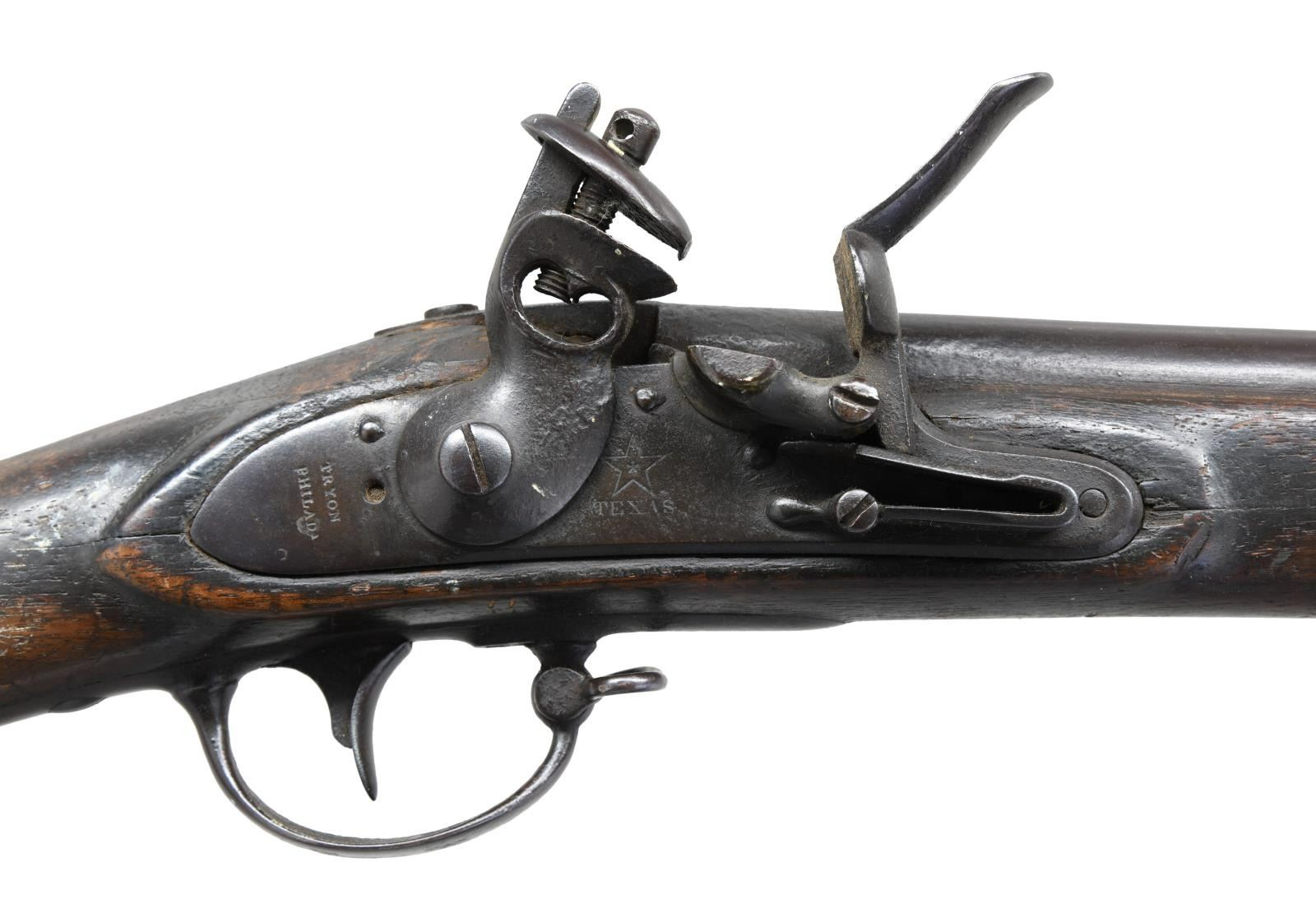 FLINTLOCK MUSKET. Cal. 69. NSN. 57.5" overall, 42" barrel. Only a few original complete unadulterated Tryon Texas contract muskets exist. They are prized by the few institutions who own them. 1500 muskets were contracted in 1839, only 860 were delivered and paid in 1840. George Flegal civilian inspector who had earlier inspected arms for the Springfield armory stated these were of equal quality of US arms. This example has clear "GF" George Flegal inspection on barrel though stock marking is very worn. These rare muskets are mentioned in several early texts on Texas arms with a mystique as rarity and history is so sparce. For this reason, this particular arm has been highly counterfeited over the years and it is nice to see a really nice untouched example here. The lockplate is corrected stamped 'TRYON' and 'PHILADa' in two vertical lines behind the cock. Forward of the cock is a large five-pointed star with an asterisk in the middle, over "TEXAS" in block letters. The barrel's breech is inspected "P" over "GF". UNATTACHED ACCESSORIES: signed letter from Nacogdoches, Texas consignor stating that it has remained in Texas for over 175 years. Copies of some news concerning other survivors. CONDITION: very good overall, dark iron patina, good markings in metal. Stock is sound and solid, weathered, scuffed & dinged, inspector cartouche is visible only in outline. Mainspring weak, otherwise functionable, clear smooth dark bore. (01-23975/JS). ANTIQUE. $20,000-30,000.