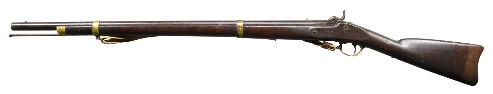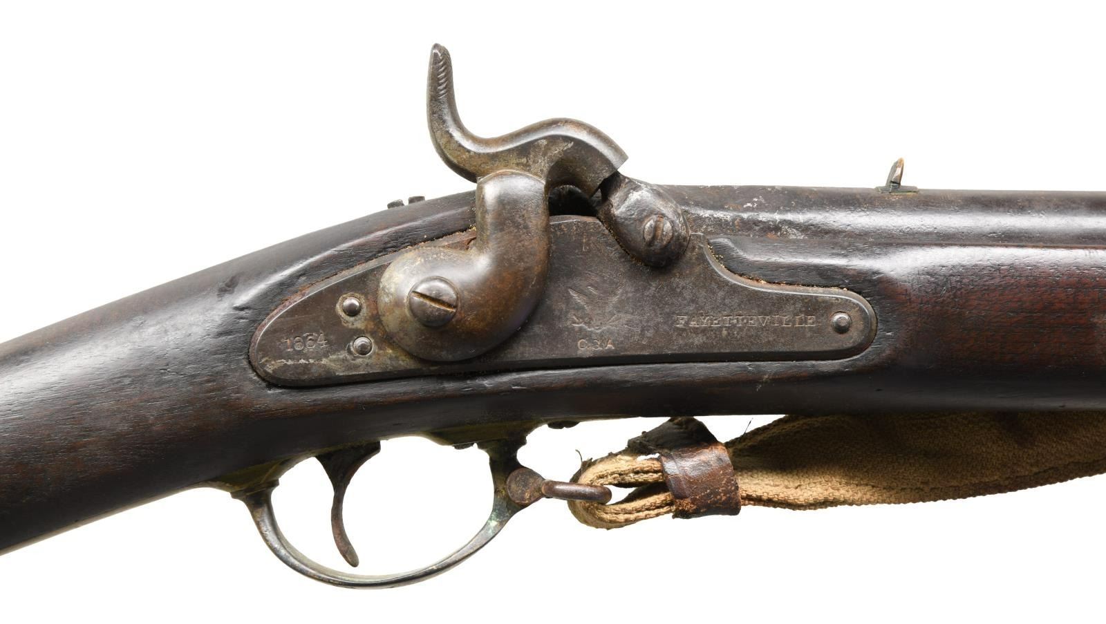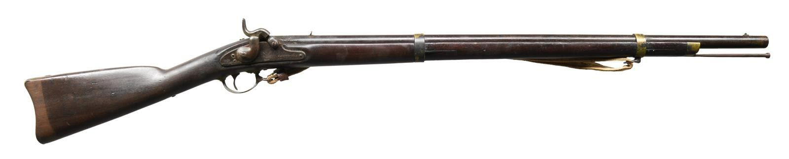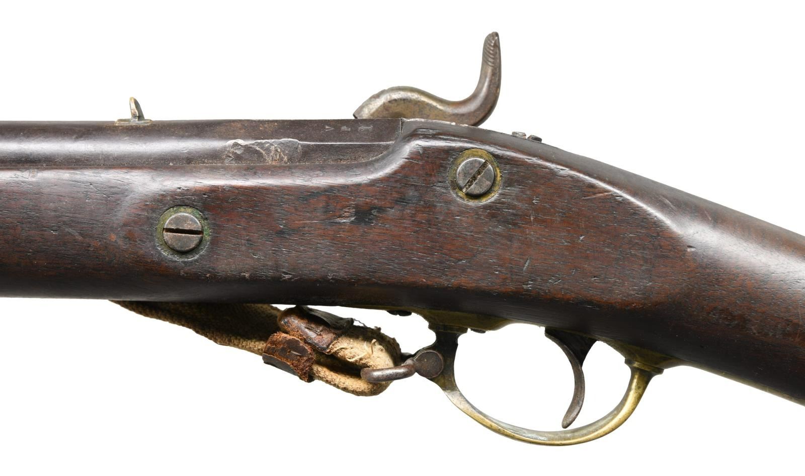 Cal. 61. smoothbore. NSN. Standard configuration of the popular brass mounted Confederate rifle made in Fayetteville, NC from captured Harper's Ferry machinery, 33" barrel proved with captured Harper's Ferry eagle font proof, "V" (viewed) & "P" (proved). The lockplate is marked forward of the hammer w/ eagle over "CSA" & "Fayetteville" & stamped behind the hammer "1864." Buttplate has "CSA" surcharge; both barrel bands marked "U" (up). Inspectors' cartouche "PB" stamped on flat opposite lock. This example still has original Confederate canvas and leather sling. Rifle has been reamed out to smooth bore with small brass front and fixed rear sights. No other alterations made and firearm presents beautifully. CONDITION: good overall. Dark iron patina, pitting at breech. Brass buttplate, trigger guard, barrel bands, lock escutcheons, & nosecap have smooth dark spotted brass patina. Ramrod serial numbered 2137 in old font but not original to this rifle. Stock is sound, worn rounded edges, cartouche visible in outline. Mechanically fine with smooth dark bore. Sling is sound, complete, soiled. PROVENANCE: Fred Edmunds, Ed Holliday estate collection. (01-24032/JS). ANTIQUE. $6,000-8,000.