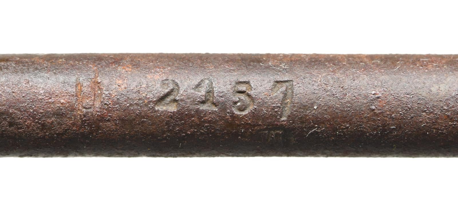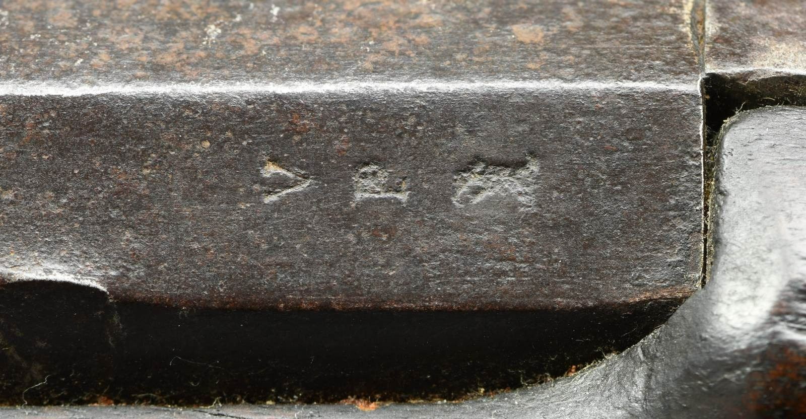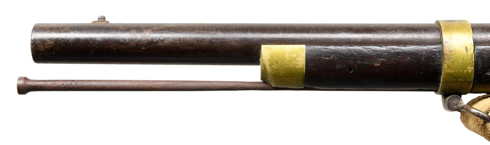 Cal. 61. smoothbore. NSN. Standard configuration of the popular brass mounted Confederate rifle made in Fayetteville, NC from captured Harper's Ferry machinery, 33" barrel proved with captured Harper's Ferry eagle font proof, "V" (viewed) & "P" (proved). The lockplate is marked forward of the hammer w/ eagle over "CSA" & "Fayetteville" & stamped behind the hammer "1864." Buttplate has "CSA" surcharge; both barrel bands marked "U" (up). Inspectors' cartouche "PB" stamped on flat opposite lock. This example still has original Confederate canvas and leather sling. Rifle has been reamed out to smooth bore with small brass front and fixed rear sights. No other alterations made and firearm presents beautifully. CONDITION: good overall. Dark iron patina, pitting at breech. Brass buttplate, trigger guard, barrel bands, lock escutcheons, & nosecap have smooth dark spotted brass patina. Ramrod serial numbered 2137 in old font but not original to this rifle. Stock is sound, worn rounded edges, cartouche visible in outline. Mechanically fine with smooth dark bore. Sling is sound, complete, soiled. PROVENANCE: Fred Edmunds, Ed Holliday estate collection. (01-24032/JS). ANTIQUE. $6,000-8,000.