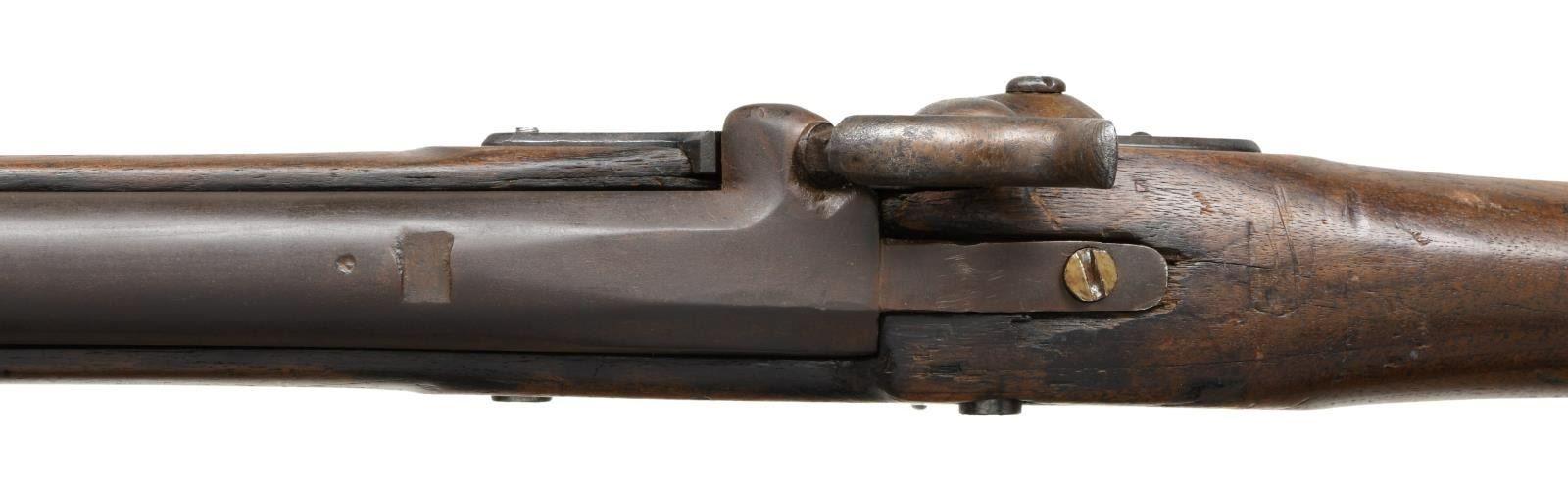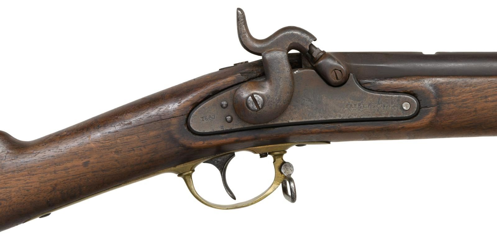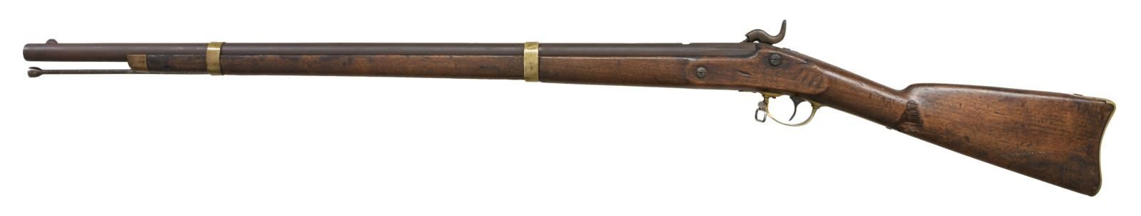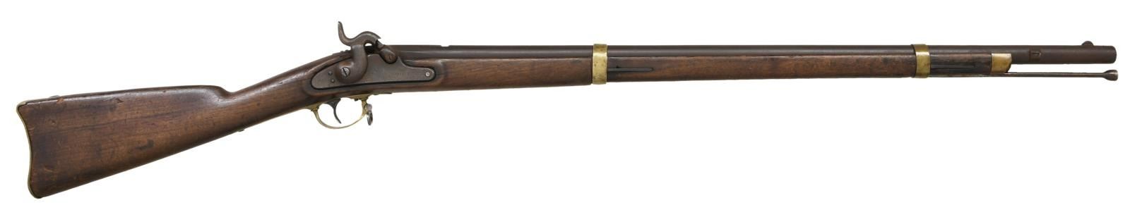 Cal. 58. NSN. Standard configuration of the popular brass mounted Confederate rifle made in Fayetteville, NC from captured Harper's Ferry machinery, with 33" barrel with bayonet lug. The lockplate is marked forward of the hammer w/ eagle over "CSA" & "Fayetteville" & marked behind the hammer "1863." eaglehead proof, "V" (viewed) & "P" (proved) stamped on breech. Buttplate has proper "CSA" surcharge; barrel bands have the usual "U" (up) stamped. CONDITION: fair to good overall. Brass mounts cleaned & toned patina. Barrel has been reworked & recolored, missing rear sight. Lock is worn and pitted with the eagle and CSA only slightly discernible, FAYETTEVILLE & date are well discerned. Stock is sound with large gouge on the left side. "U" On rear barrel band is only partially discernible, sling swivel post on front band has been filed off, attachment post on bayonet lug is missing. Ramrod is shortened replacement. Mechanically good with discernible rifled bore. Regardless, this is an attractive CS gun overall. (01-24050/JS). ANTIQUE.$3,000-5,000.