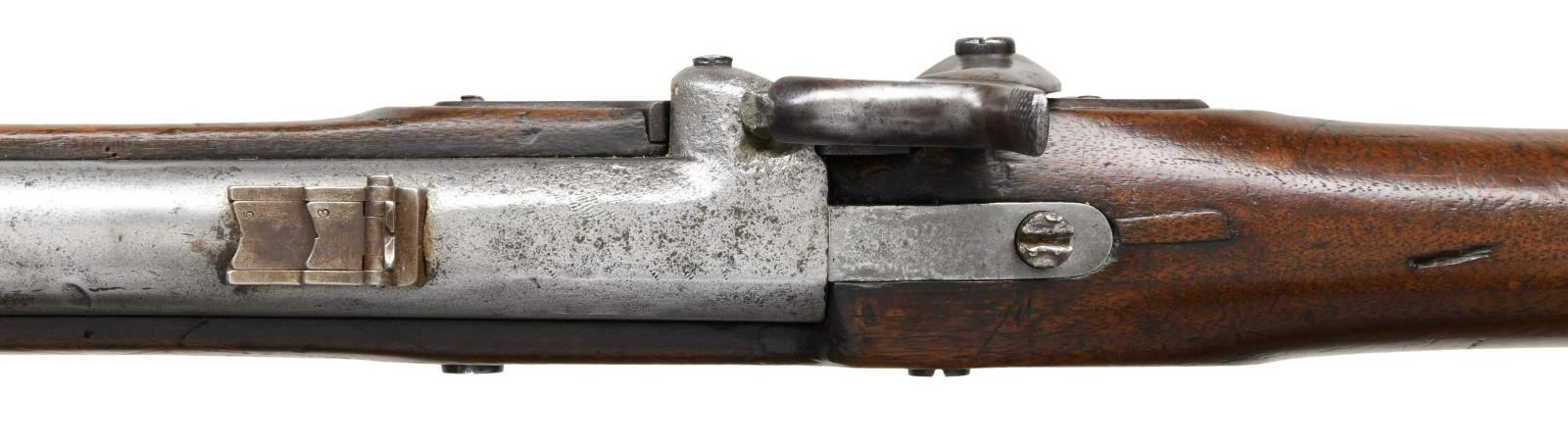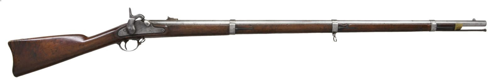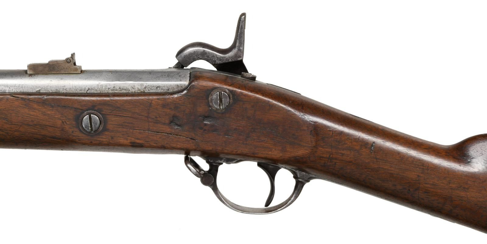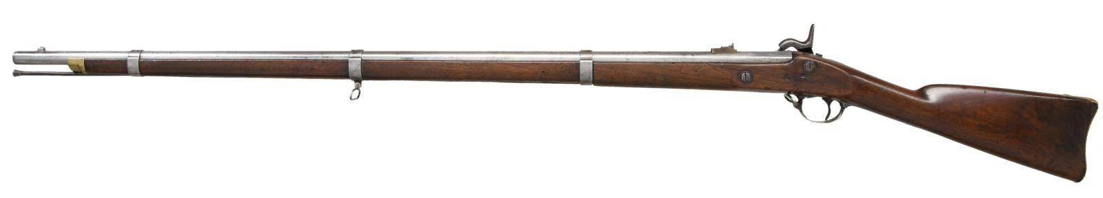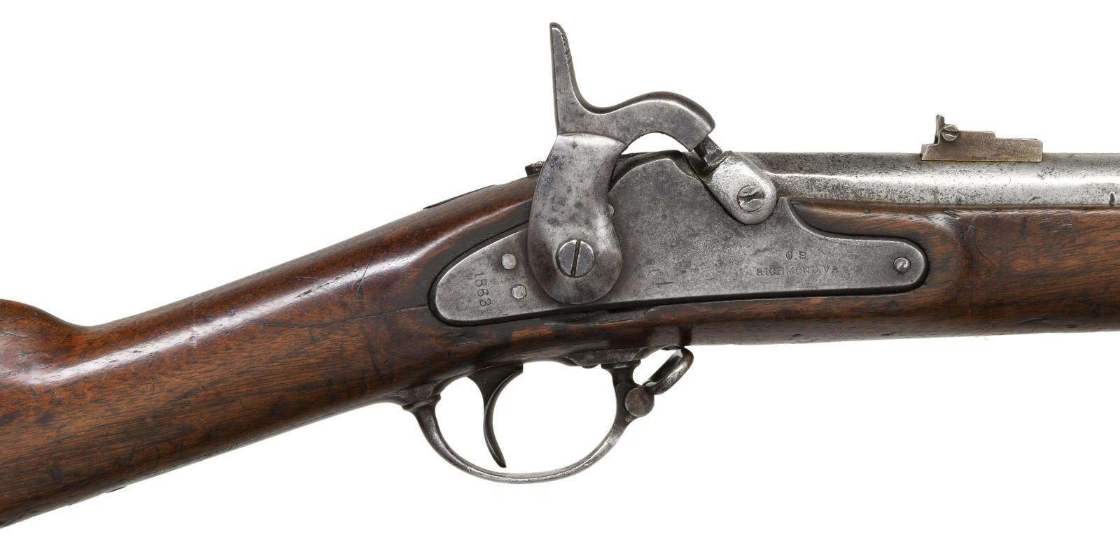 Cal. 58. NSN. Standard configuration made from captured Harpers Ferry machinery. 56" overall, 40" barrel, proper Richmond adjustable rear sight, brass buttplate, brass nose cap, original tapered ramrod. Longitudinal forging flaws are observed which are characteristic of Richmond manufacture. The lock is dated "1863" vertically at tail & "C.S. / RICHMOND, VA" forward of hammer. This is a pleasing example with crisp lock markings. CONDITION: good overall, appears complete & original, old cleaning, mottled gray/bright patina, barrel proofs not visible. Ramrod is not Richmond made but top section appears of era with modern welded extension to fit gun. Rear sight is a restoration. Stock is sound and well fit was scattered dings, dents, and few hairline cracks. Mechanically functional. Bore heavily worn with traces of rifling. (01-24054/JS). ANTIQUE. $4,000-6,000.