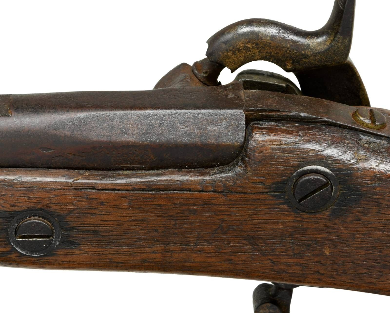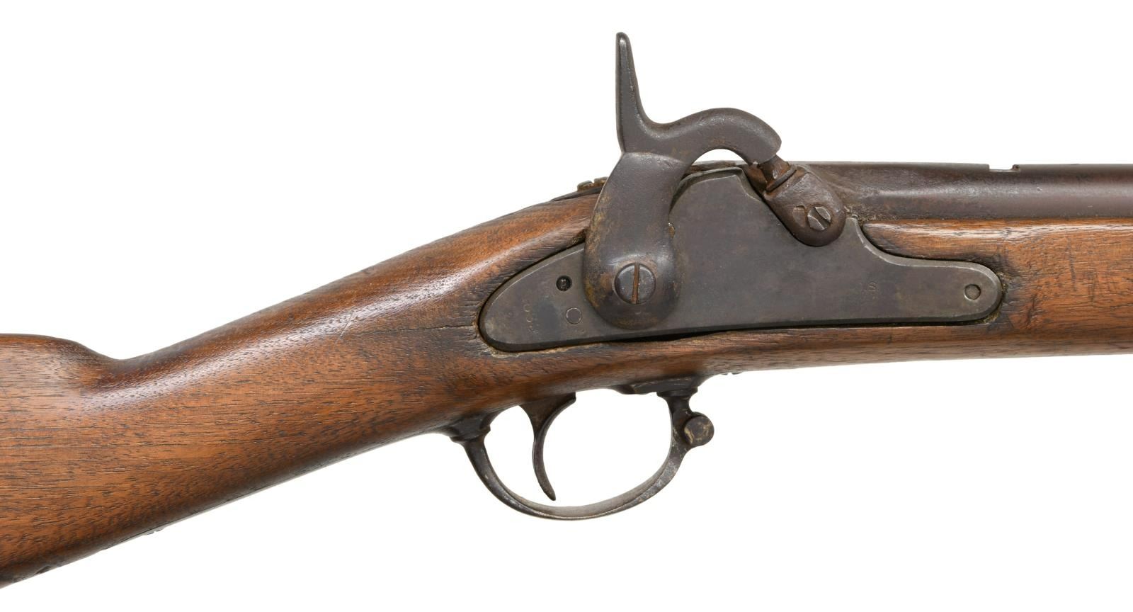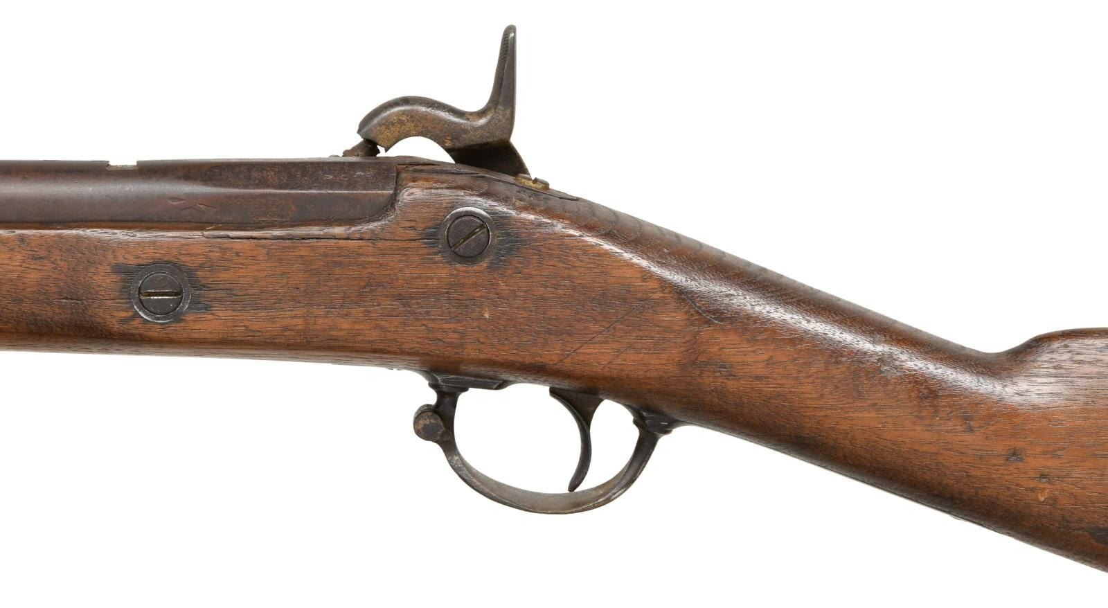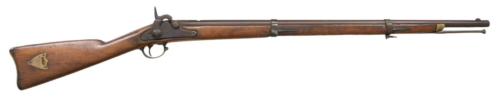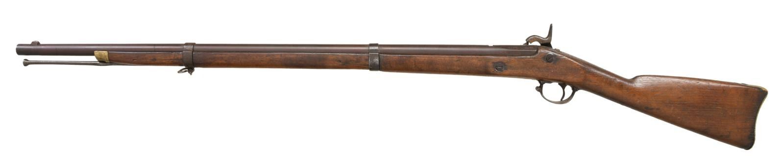 Cal. 58. NSN. Richmond rifles with 33" barrels had a very small production made only late 1863 and 1864. Often parts gleaned from battlefield, shortened damaged musket barrels, a lot of variety is seen in survivors. This example has 1863 dated Richmond lock, Richmond brass buttplate and nose cap. 31" braised repaired threaded ramrod is quite possibly Confederate made. Stock has attached brass saddle shield decoration, undiscernible name scratched on opposite side. CONDITION: good. Originally rifled made in 58 caliber, barrel has been reamed to about 61 caliber smooth bore removing rear sight and probable restored front pinch site in style seen on Richmond rifles. Stock is sound with old sanding missing large chunk rear of lock, weathered & worn overall. Lock markings weak and "RICHMOND" not discernible. Iron has mixed patinas with more pitting on trigger guard and barrel bands than barrel & lock. VP/eagle head proofs on breech have discernible Richmond broken "P". Mechanics are fine with smooth clear bore. (01-24057/JS). ANTIQUE. $2,000-4,000.