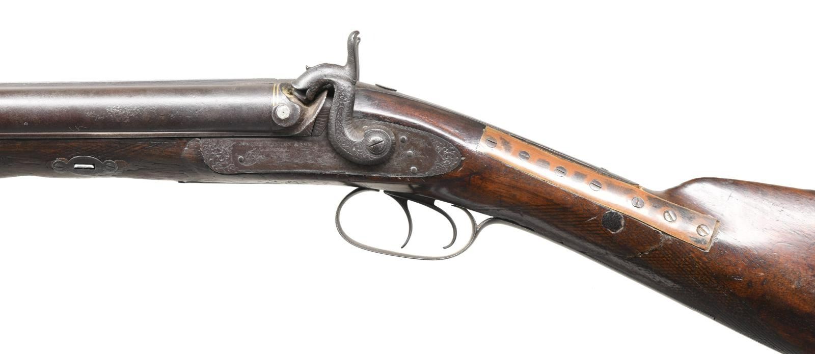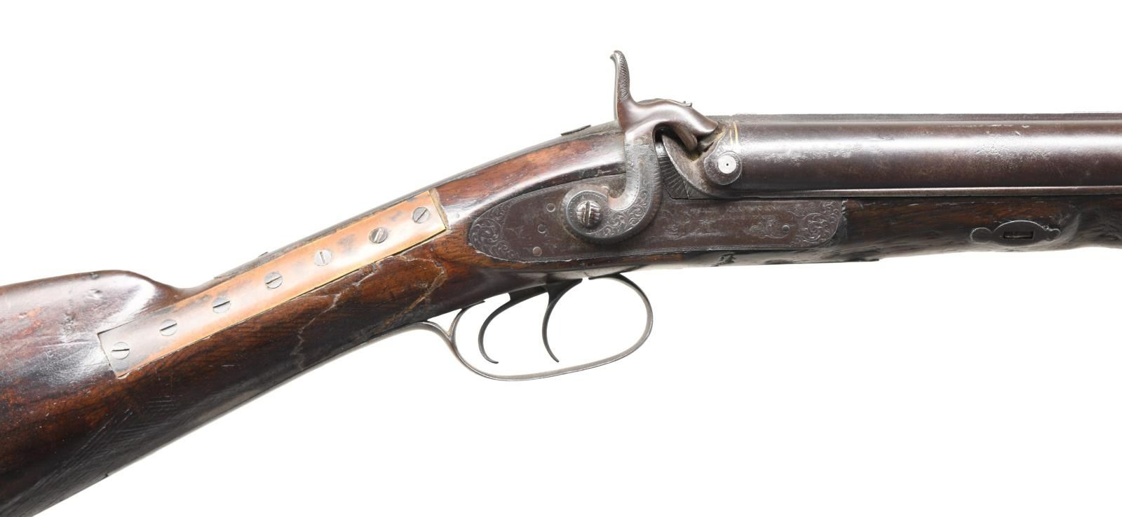 CLARK OF MEMPHIS, TENNESSEE. Cal. 12 Ga. NSN. Bbls. 33 1/4". This extraordinary double barrel, 12 Ga. shotgun was retailed by F.H. Clark & Co. of Memphis, Tennessee. It likely saw extensive use during the Civil War, likely by Confederate mounted troops. This exact gun is pictured on pages 206 through 209 of the book, "Confederate and Southern Agent Marked Shotguns" by Pritchard & Ashworth. Round barrels with a large bridge that has been inlaid with gold letters that reads "IMPORTED & WARRANTED BY F.H. CLARK & CO MEMPHIS TENN:". There is a bead sight near the muzzle and gold inlaid lines at the breech. On the underside of each barrel, covered by the forestock, are 3 Birmingham proofs, 2 stamped "12" marks, "Laminated Steel", and "H & S". The "H & S" likely represents the firm of Hollis & Sheath of Birmingham, England. The front action locks are engraved with dogs, grouse, woodcock, and foliate motifs. The locks are marked "JOSEPH MANTON & SON PATENTEES". The hammers are engraved in a complimentary motif to the locks. Engraved iron trigger guard, engraved buttplate, engraved barrel tang, engraved barrel pin escutcheons, and plain ramrod thimbles. There is a small gold shield escutcheon at the base of the butt. The walnut stock has crosshatching at the wrist. Wooden ramrod is likely an early replacement. UNATTACHED ACCESSORIES: a book titled "Confederate and Southern Agent Marked Shotguns" by Pritchard & Ashworth. CONDITION: barrel has a dark overall patina, as do the locks and other iron parts. Gold inlays are virtually complete. Locks hold both full and half cock. There has been a break at the wrist that has been skillfully repaired with two 4 1/2" brass straps with 7 countersunk screws on each side. There are several gouges & small missing pieces of wood in the forestock, likely due to heavy use during the war. Good bores. (01-24219/BF). ANTIQUE. $3,500-4,500.