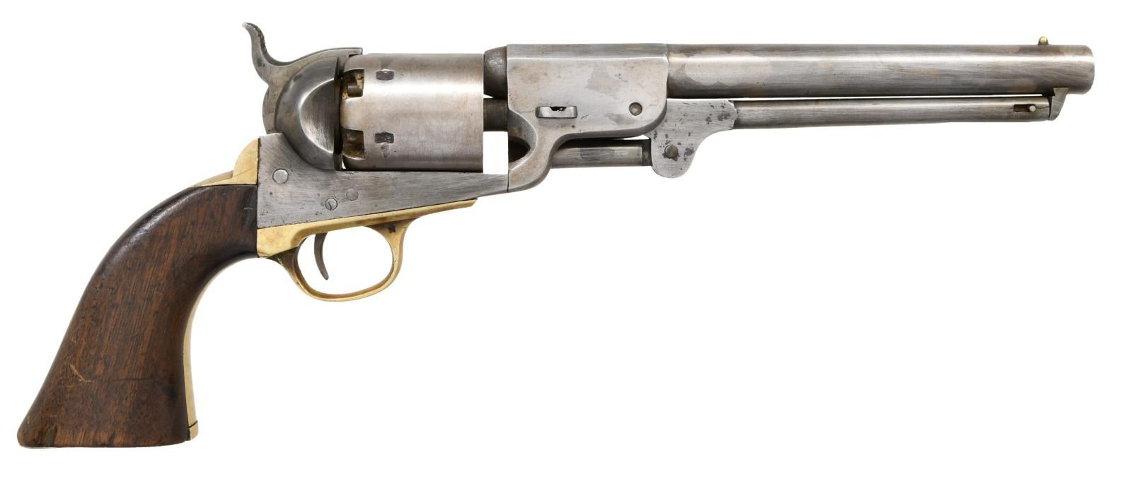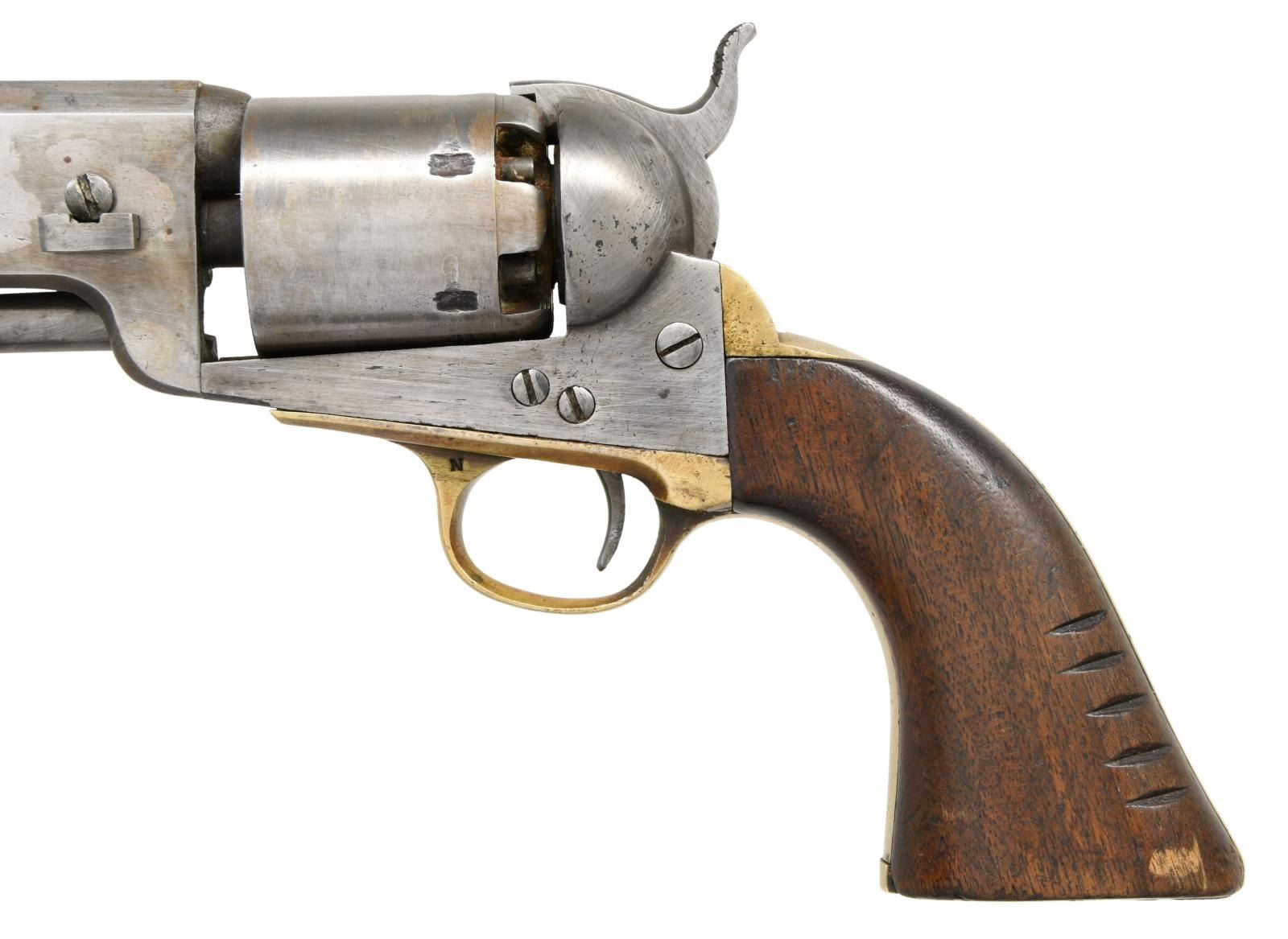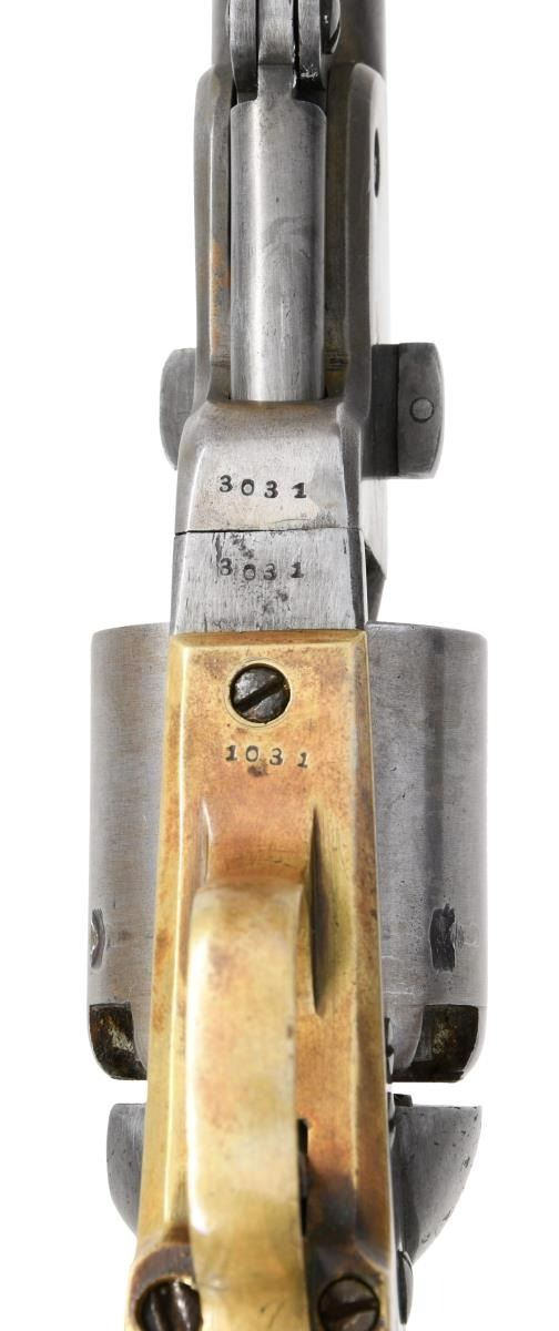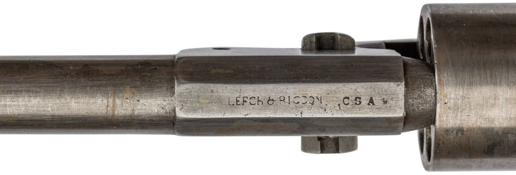 LEECH & RIGDON REVOLVER. Cal. 36. S# 1031. Manufactured in late 1863, one of 1000 revolvers made at Greensboro GA under Confederate contract and one of 300 with South Carolina inspection stamped "S. C.". SC marked revolvers are only known in serial range 1000-1300 (lowest survivor 1007 and highest 1290). Revolver is in standard configuration 7.5" half octagonal to round barrel with brass pin front sight "LEECH & RIGDON CSA" on top flat. "N" inspector stamped both sides front trigger bow. S# observed on every part normally numbered including latch, wedge, arbor, factory mis-transcribed S# 3031 on frame and barrel. Penciled S# observed on grip backstrap channel. This is only example in database with a factory mis-transcribed serial number. Revolver is especially sharp, showing little wear, superior "LEECH & RIGDON" and "CSA" barrel markings. Grips have 5 cut slashes on left side, possible kills in battle? This is a very crisp revolver that probably saw service in the South Carolina Cavalry that has survived in beautiful condition. CONDITION: very good overall, complete and original including screws, matching serial numbers found throughout with the noted transposed "3" for "1" for 1st number on barrel and frame, metal cleaned & polished with scattered staining, brass grip frame has toned patina. Tacking marks on butt of gun, but the SC inspection is still easily discerned. Mechanically fine with crisp rifled bore. PROVENANCE: Buddy Bass collection (when he found revolver, it was cold blued which he removed), Penn Templeman collection, Kerry Elliott collection. (01-24190/JS). ANTIQUE. $25,000-35,000.