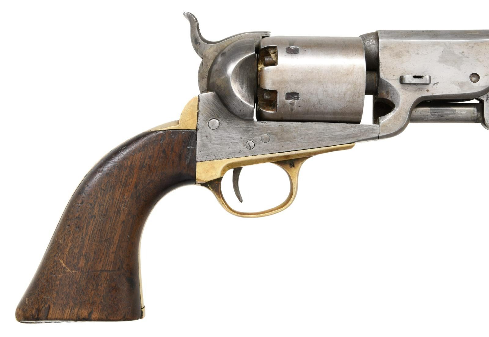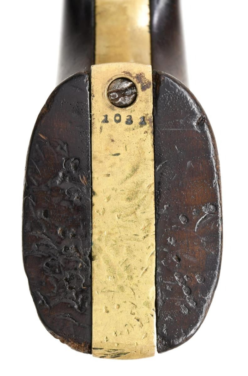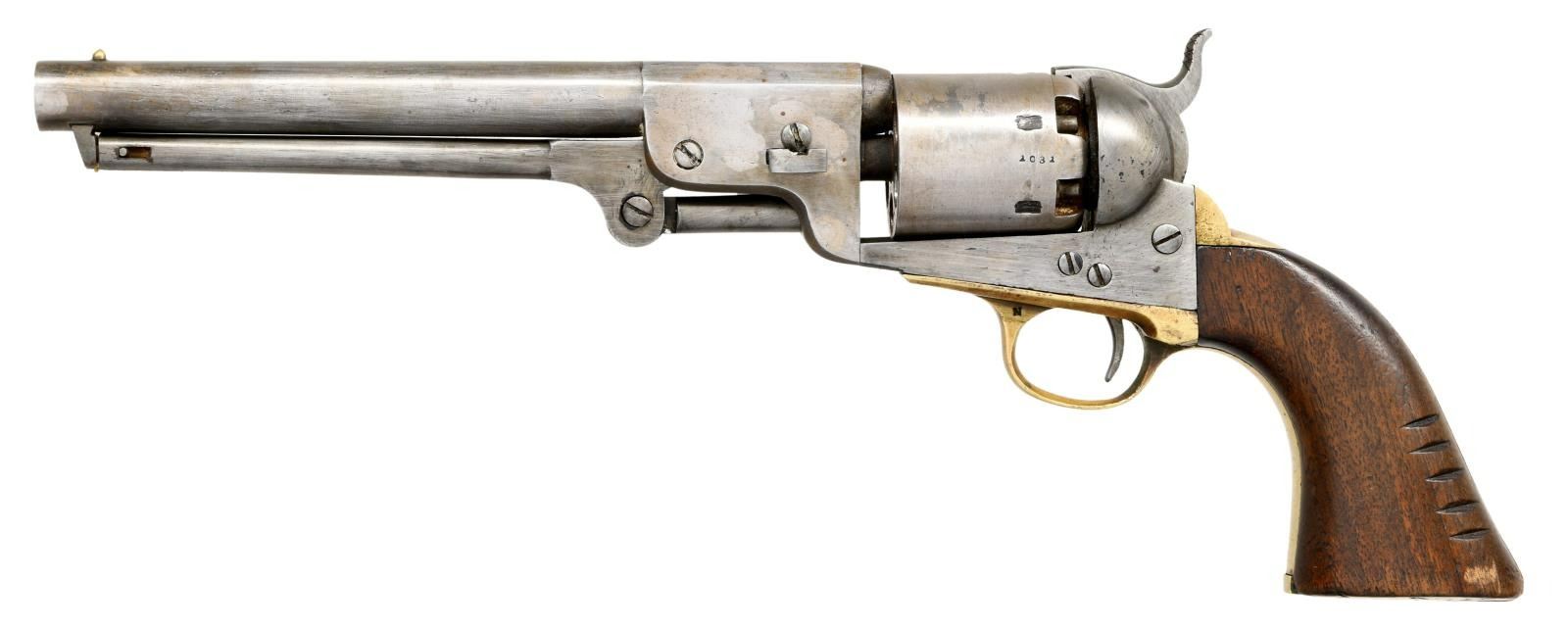 LEECH & RIGDON REVOLVER. Cal. 36. S# 1031. Manufactured in late 1863, one of 1000 revolvers made at Greensboro GA under Confederate contract and one of 300 with South Carolina inspection stamped "S. C.". SC marked revolvers are only known in serial range 1000-1300 (lowest survivor 1007 and highest 1290). Revolver is in standard configuration 7.5" half octagonal to round barrel with brass pin front sight "LEECH & RIGDON CSA" on top flat. "N" inspector stamped both sides front trigger bow. S# observed on every part normally numbered including latch, wedge, arbor, factory mis-transcribed S# 3031 on frame and barrel. Penciled S# observed on grip backstrap channel. This is only example in database with a factory mis-transcribed serial number. Revolver is especially sharp, showing little wear, superior "LEECH & RIGDON" and "CSA" barrel markings. Grips have 5 cut slashes on left side, possible kills in battle? This is a very crisp revolver that probably saw service in the South Carolina Cavalry that has survived in beautiful condition. CONDITION: very good overall, complete and original including screws, matching serial numbers found throughout with the noted transposed "3" for "1" for 1st number on barrel and frame, metal cleaned & polished with scattered staining, brass grip frame has toned patina. Tacking marks on butt of gun, but the SC inspection is still easily discerned. Mechanically fine with crisp rifled bore. PROVENANCE: Buddy Bass collection (when he found revolver, it was cold blued which he removed), Penn Templeman collection, Kerry Elliott collection. (01-24190/JS). ANTIQUE. $25,000-35,000.