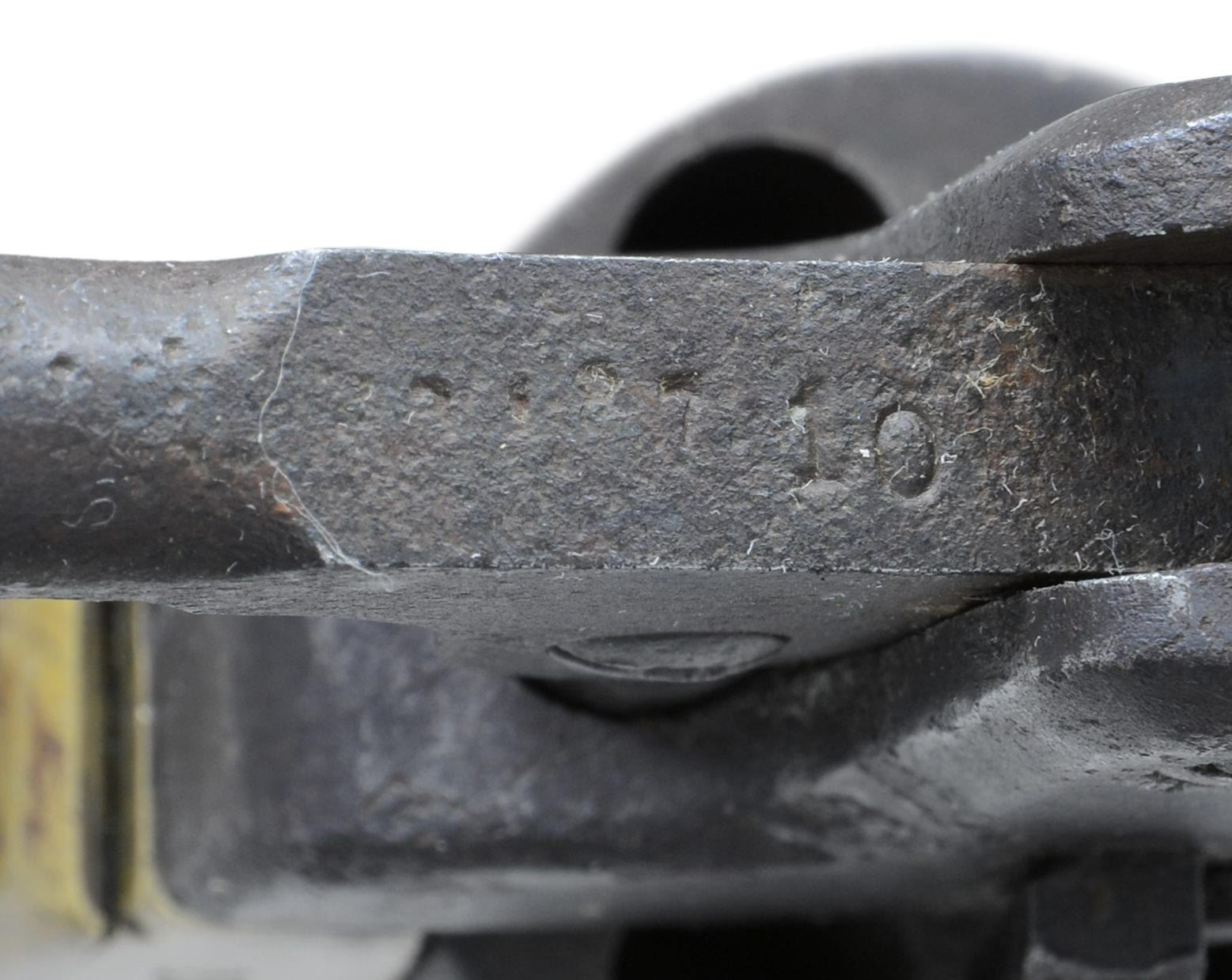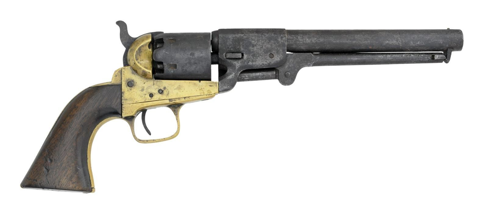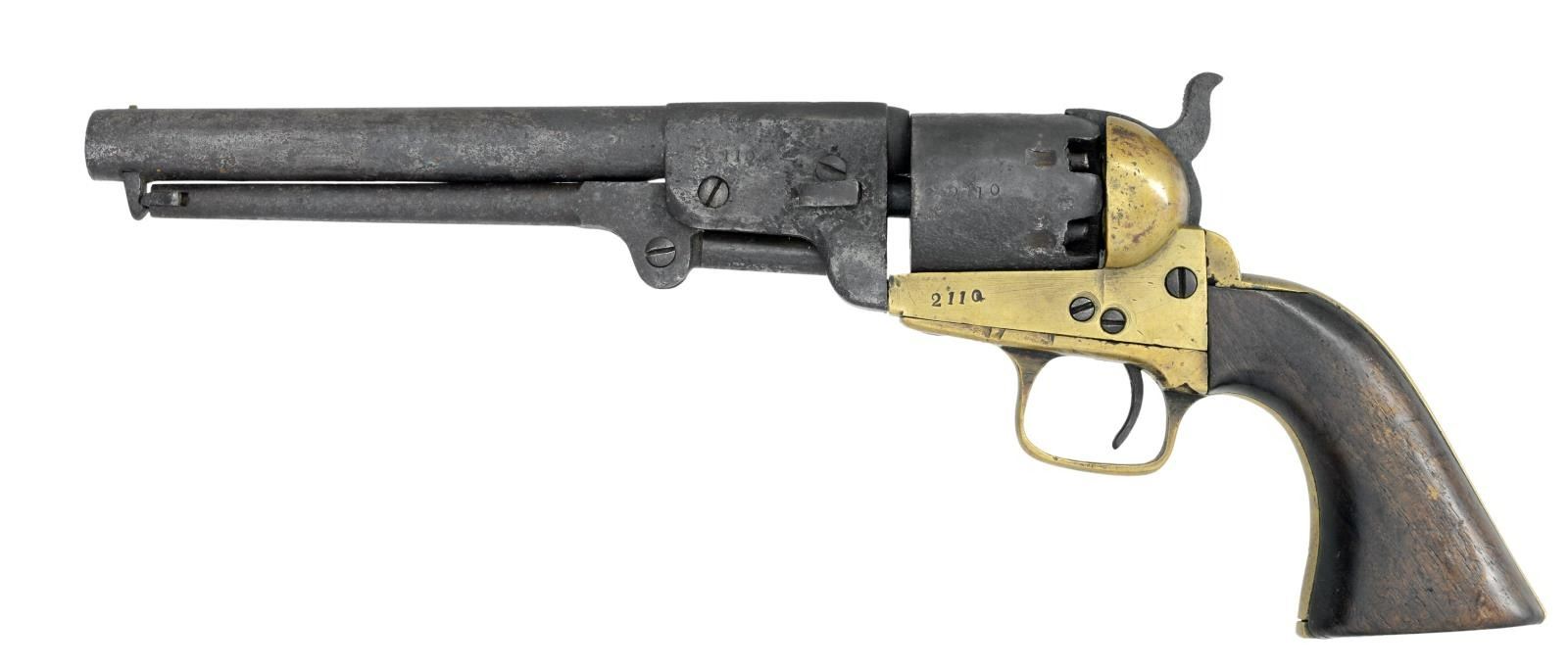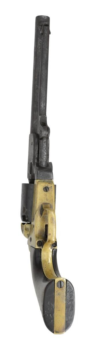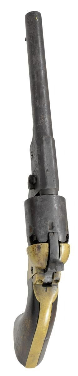 FRAME REVOLVER. Cal. 36. S# 2110. This revolver has been known since the 1970s when in the famous Confederate collection of Fred Slaton of Nebo Kentucky. Revolver is fine survivor, uncleaned, authentic & matching throughout, numbered and marked on every part that can be marked. Samuel Griswold made about half of all approximate 7500 Confederate revolvers made in the Confederacy at his converted cotton gin factory near Macon in Griswoldville, GA. This is a standard 2nd Model configuration with half octagonal barrel housing and 7.5" round barrel. Serial number "2110" is found stamped on the left side of frame, cylinder and barrel housing. Secondary number "10" is found on loading arm, wedge, hammer, trigger guard, and penciled on one piece walnut grips. Cryptic "X" is observed: barrel, cylinder, frame, trigger guard, and backstrap. Matching assembly "XIIII" is cut into the trigger guard, backstrap and frame. This pistol is a fine survivor, original in every regard. CONDITION: good and complete, all matching, only 2 screws appear to be old replacements. Mottled brass patina, iron patina with pitting. Mechanically cocks but cylinder only turns sporadically, pitted well defined rifled bore. PROVENANCE: Fred Slaton collection 1970s, Cecil Anderson collection, private collection. (01-23444/JS). ANTIQUE. $20,000-25,000.