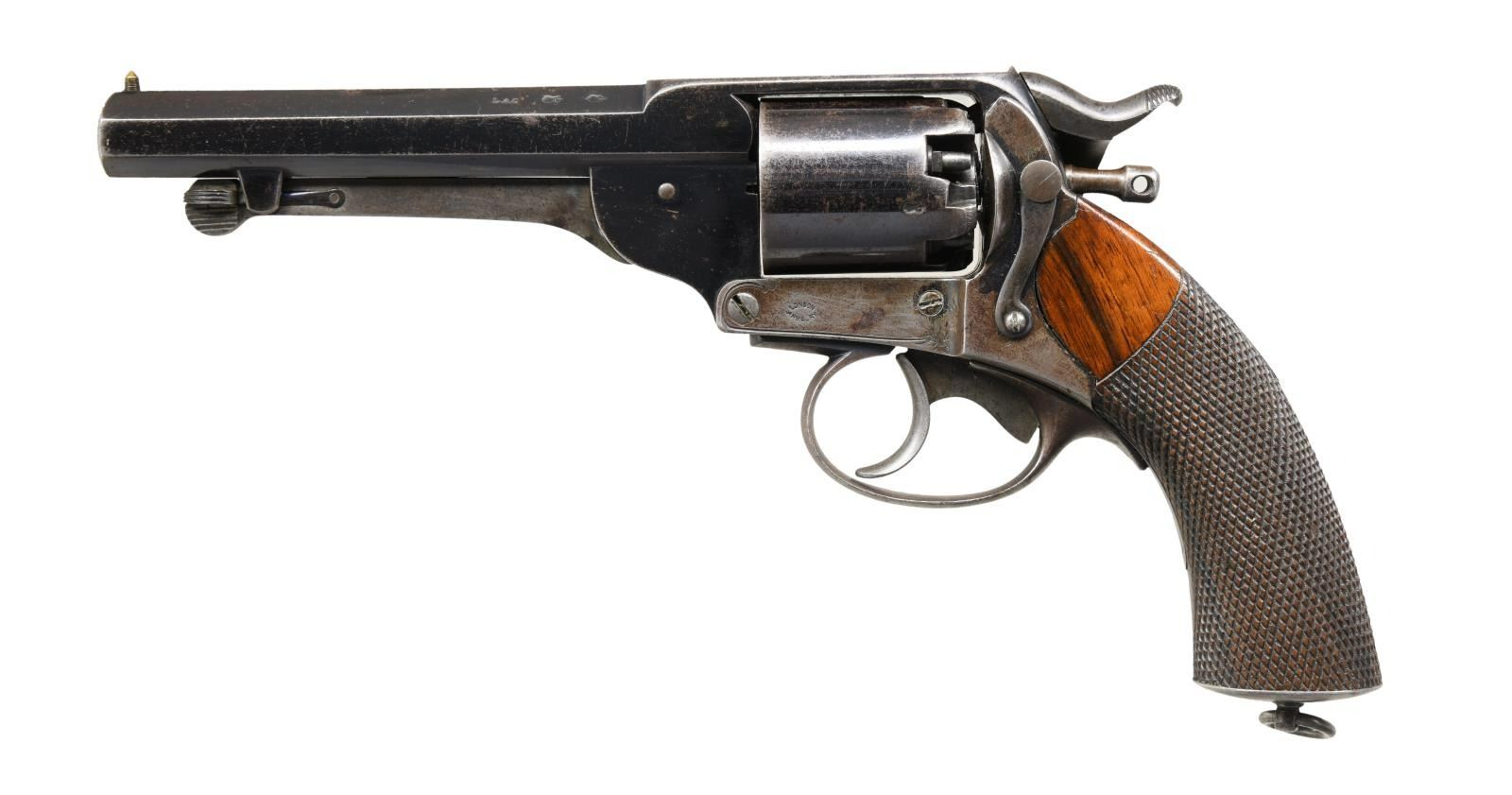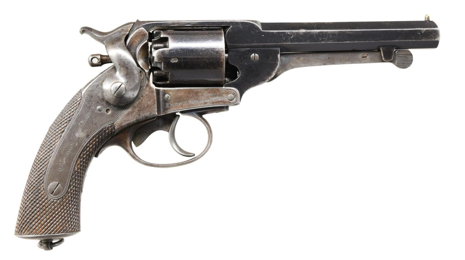 Cal. 44. S# 4802. Bbl. 5 1/2". Brass post front sight. Fixed rear sight. Very fine Kerr single action revolver retaining a high degree of original blue finish. Matching numbers on frame & cyl. Inside of top strap numbered "105". Right side of lock marked "LONDON ARMOURY CO". Right side of frame marked "KERR"S PATENT 4802". Blue finish. Many of this type of revolver were used by the Confederacy during the Civil War & this revolver's serial is close in range to known "JS/Anchor" CSA examples but no such stamp is present. Interestingly a gun a couple serial numbers away also lacks the "JS/Anchor" marking. It is more unusual to find an example w/o this stamp than one w/ it. There is an odd "S" cartouche present on the front of the grips but it is not a "JS/Anchor" stamp. Checkered walnut grips w/ lanyard ring. CONDITION: grips have a small chip on right side, a few flattened points & some handling wear. Metal retains 50% original blue w/ fading to gray on the bottom half, a few light scratches, scattered flaking to brown & light oxidation. Bore shows scattered pitting & oxidation but strong rifling. PROVENANCE: sold at Butterfield auction July 14th, 1992. Ex Jimmy Wrenn Collection.. From the Collection of James B. Taylor who purchased the revolver in 2004. (01-23850/MJC). ANTIQUE. $4000-6000.