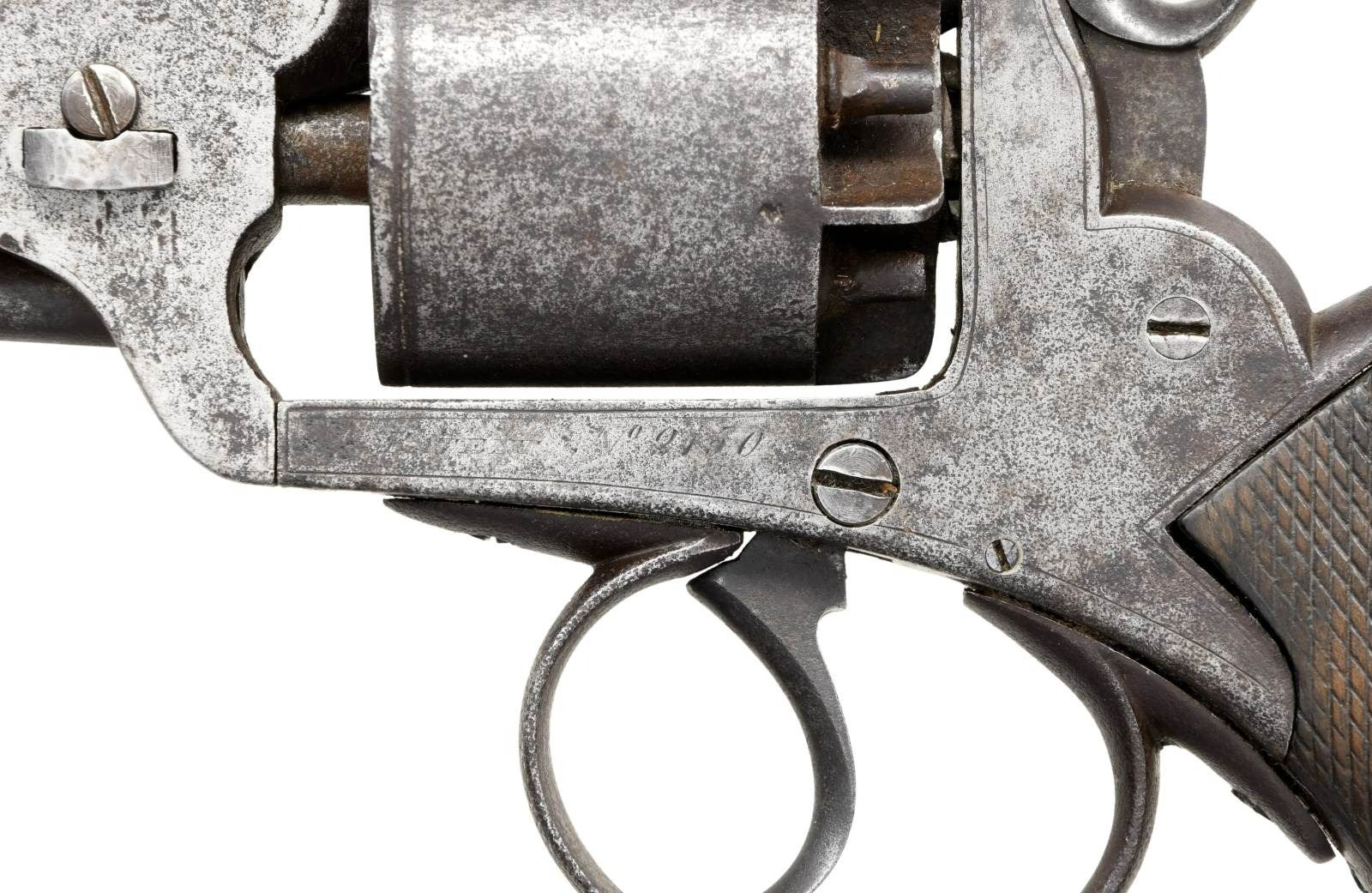 REVOLVER. Cal. 54 bore (.442). S# 2150. Standard configuration of the first type Webley big bore army revolver with Colt type loading assembly, 6.25" barrel, "LONDON" engraved on top strap, "J. ADAMS" engraved on right side of frame, serial number found on the left side of frame "No. 2150". This earliest style of Bentley's big bore patent revolver starts about S# 2000 (earlier revolvers are 80 bore) and ends about 4000 before the Kerr style loading lever was used exclusively. There are several identified Confederate used revolvers of this style including S# 3111 & 3121 which are found on the Pratt list of 18th VA Cavalry issued arms, 1864. This is the second lowest serial number of large bore Webley's in database. CONDITION: good overall, metal cleaned and pitted, markings light and barely discernible other than serial number which is easily read. Checkered grips worn with large chip on right panel, there is a hole cut for lanyard near butt cap. Revolver functions in both double action and single action, good multi groove rifling. (01-24094/JS). ANTIQUE. $1,500-2,000.