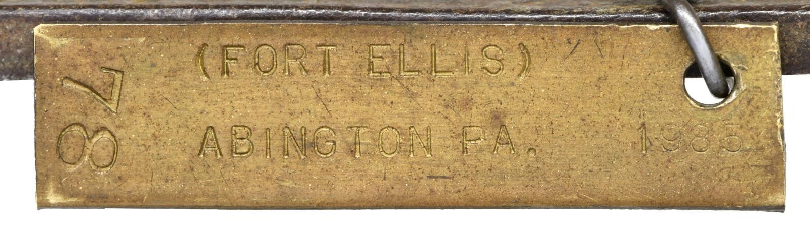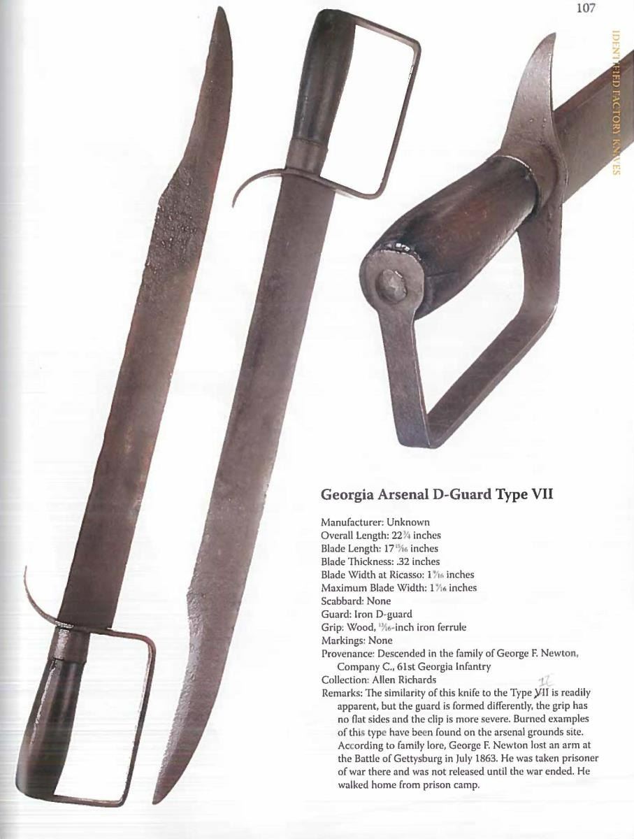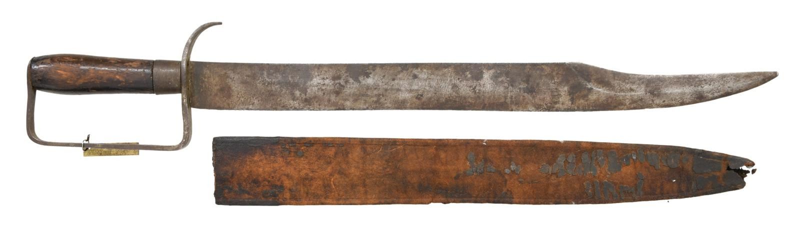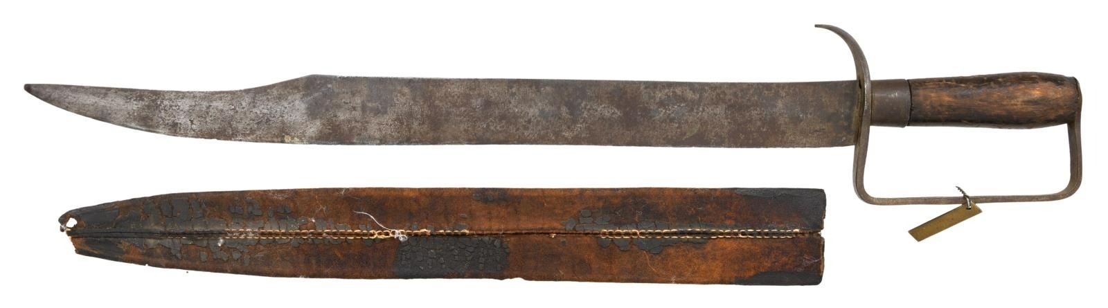 23.25" overall, 18.5" long sharpened 6.5" clip point, .3" thick and the meatiest of GA Armory bowies, classified as "type VII" in my co-authored 2012 text "CONFEDERATE BOWIE KNIVES". Georgia Armory knives are broken down into 8 types in book as at least 14 different contractors supplied the state of Georgia. Regardless of type, all made with same contracted characteristics, but this type 7 & 8's have heavier blades than others and few survivors. About 5000 knives entered the Armory at Milledgeville, GA in 1862 but only about 1400 were issued and the others destroyed by Sherman in 1864 other than handful of souvenirs taken by his soldiers. The type VII shown in text was identified to Gettysburg veteran. This knife has "Ft Ellis" collection tag of Wilfred G. Ellis (1935-1994) from Abington PA. This knife is pictured on page 231 of "ACCOUTREMENTS IV" by Jim Johnston. UNATTACHED ACCESSORIES: Copies of pertinent pages from Accoutrements IV & "Confederate Bowie Knives". CONDITION: very good overall, honest & "as found", iron patina, small nicks in cutting edge, original finishing marks and forging flaws clearly visible on blade, chipped point. Turned wood handle scuffed but sound. (02-19975/JS). $4,500-6,500.