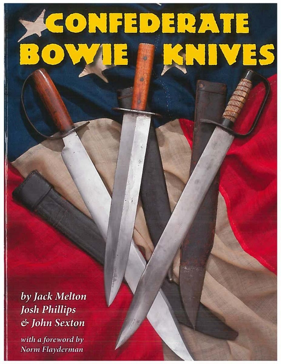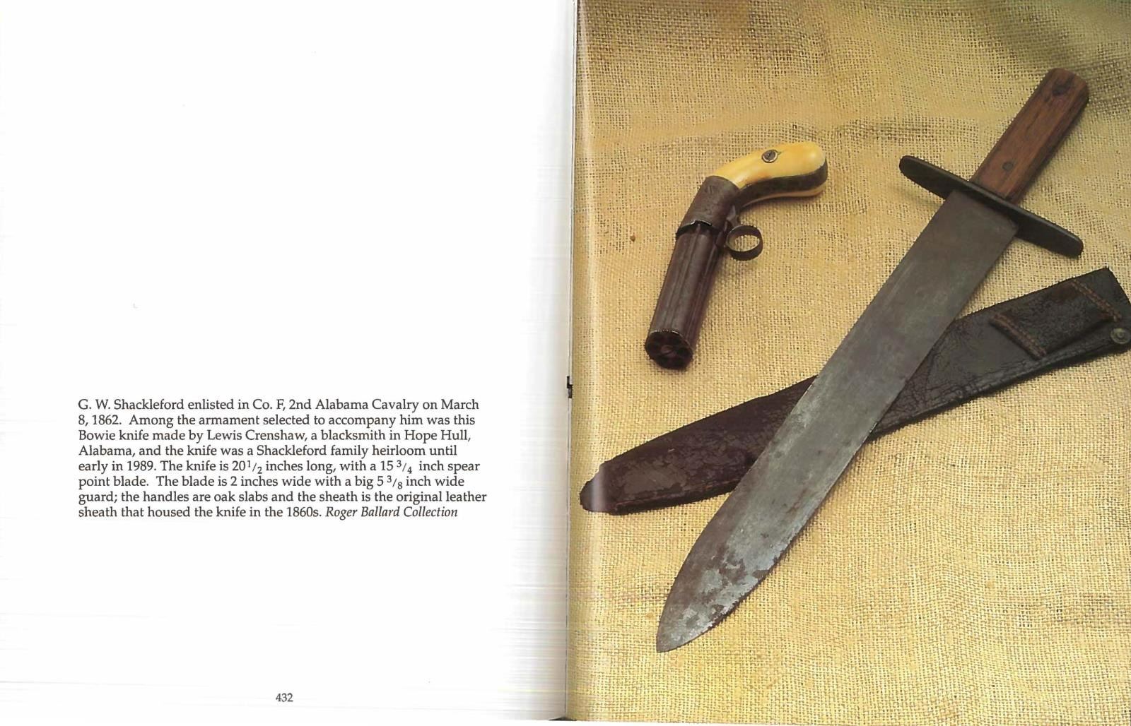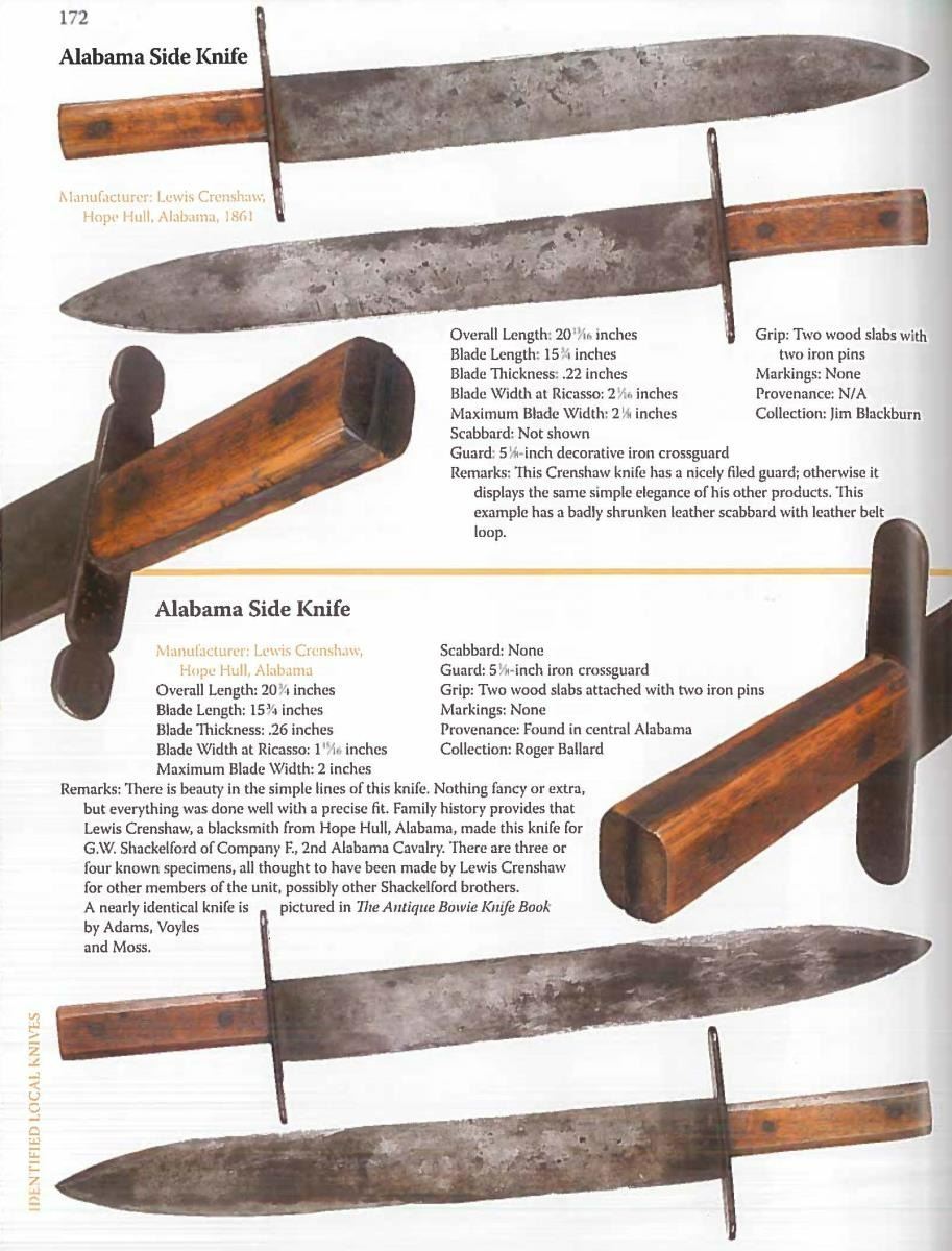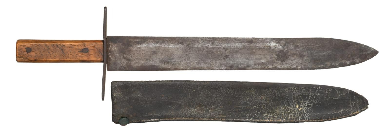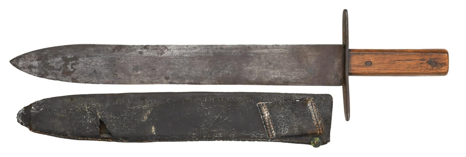 SLAVE LEWIS CRENSHAW, HOPE HULL, ALABAMA. 20.5" overall, 15.75" spear point blade, 2" wide, .22" thick, oak slab grips, original leather sheath. This knife is pictured in "THE ANTIQUE BOWIE KNIFE BOOK" by Adams & Voyles 1990 on pages 432 & 433. This knife was retained by descendants of George Washington Shackleford, Co. F, 2nd Alabama Cavalry who related the history to Roger Ballard in 1989. There are 2 other specimens known, both pictured in "CONFEDERATE BOWIE KNIVES" 2012 on page 172, both found in central Alabama & thought made for the other Shackleford brothers by Crenshaw. Josh Phillips remarked in our coauthored text: "There is beauty in the simple lines of this knife. Nothing fancy or extra, but everything was done well with a precise fit." George Washington Shackleford (1827-1867), Frank (1830-1905), Joseph (1835-1902) & Madison (1838-1905) all served in same Co. F, 2nd Alabama Cavalry having enlisted together on May 1st 1862 in Montgomery AL. Both Madison and Joseph would become commissioned lieutenants. All four brothers are buried in the Shackleford cemetery near their ancestral home. This is among the very few Confederate Bowie knives with known family history as to who carried it and who made it. CONDITION: very good overall "as found", gray blade showing original finishing marks, smooth iron patina, scattered pitting, grip slabs have hand worn patina. The original sheath is dry, slightly shrunk missing last inch or so of tip, reinforced sewn edge is good with the about 1" chip missing one side, 2.5" belt loop still attached. (02-19969/JS). $4,000-6,000.