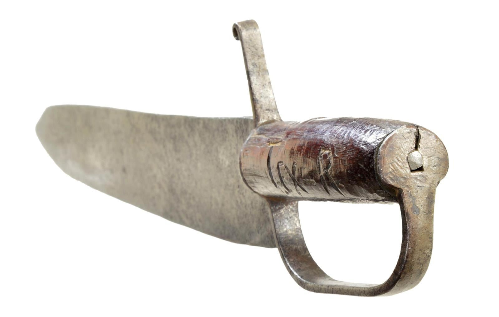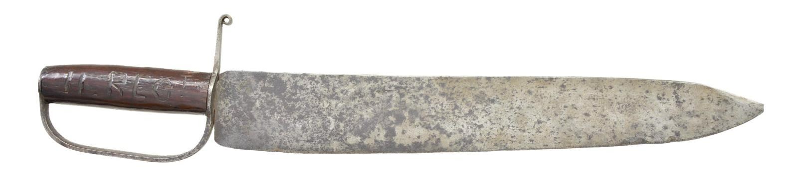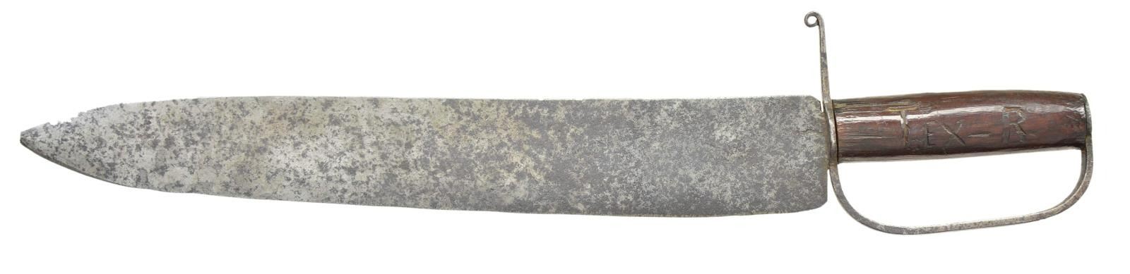 20" overall, 15" meaty spearpoint blade, 2.25" wide, "Tex-R" & "II REGt" carved on either side of wood grip. This knife sold by well known dealer/collector Don Ball to consignor many years ago. CONDITION: very good overall, gray blade, old sharpening, staining & pitting, repeened, wood grip is sound. (02-19075/JS). $3,000-4,000.
