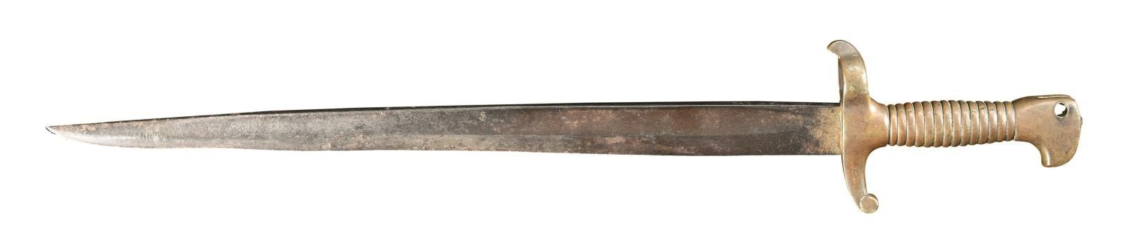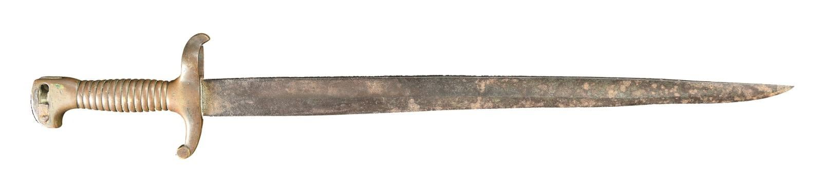 BAYONET. 22" Overall, shortened 17" blade, classic B&G design of hollow cast ribbed handle, bird's head pommel. Made to attach to B&G adapter that could fit variety of Confederate used rifles. Number "57" stamped on bottom of guard. CONDITION: good overall, no dents in handle with coppery patina gray blade, iron patina, old sharpening, locking bolt & most of spring missing. (02-19451/JS). $700-900.