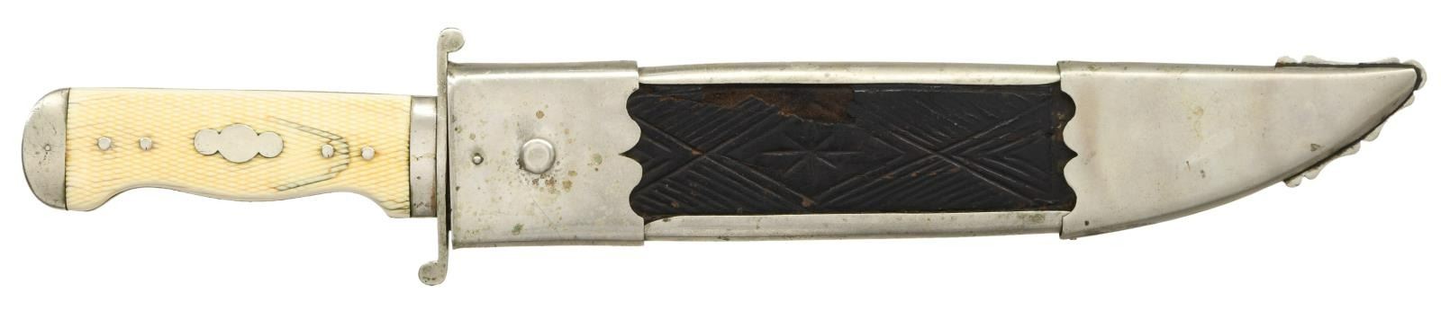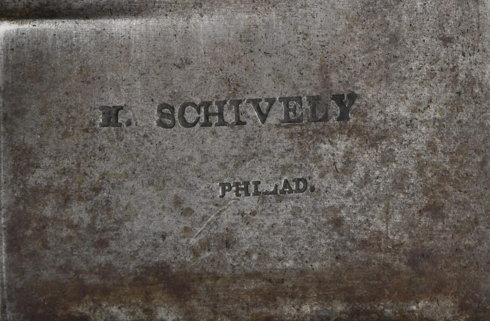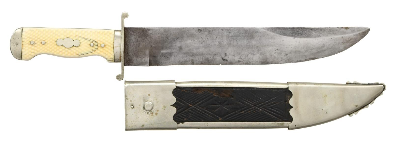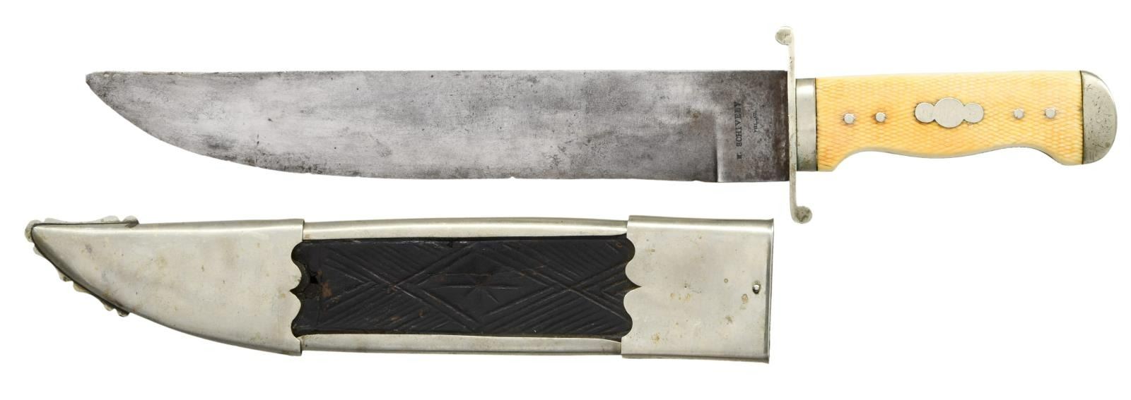 Many collectors and historians believe that Henry Schively made one of the first Bowie knives for Jim & Rezin Bowie during their visit to Philadelphia in August of 1832 based on Bowie's design. "H. SCHIVELY / PHILAD" stamped on ricasso, 10.75" blade, 1-3/4" wide, .23" thick. German silver mounted, 3" S-shaped crossguard, checkered ivory slab grips retained by German silver pins and two vacant sculpted escutcheons on either side. A unique feature of these big Schively bowies is the flat cutler grind on one side of blade from ricasso to point, and the reverse side with a distinct, sharpened 5" false edge giving the appearance of a clipped point. Sheath is unique to Schively, large German silver throat with frog button & tip with moldings at point, two German silver supports attach the mounts along the edges. The German silver mounts wrap around a tooled black leather body. This is a good example of only 12 documented survivors by the most famous Jim & Rezin Bowie associated cutler. CONDITION: very good overall. Blade has smooth gray iron patina, crisp makers mark, a few small nicks in cutting edge, point is blunted. German silver on grip and sheath retain traces of silver plate. (02-21016/JS). $40,000-60,000.