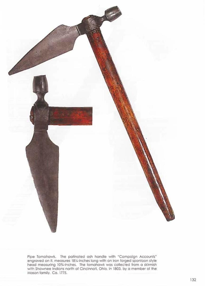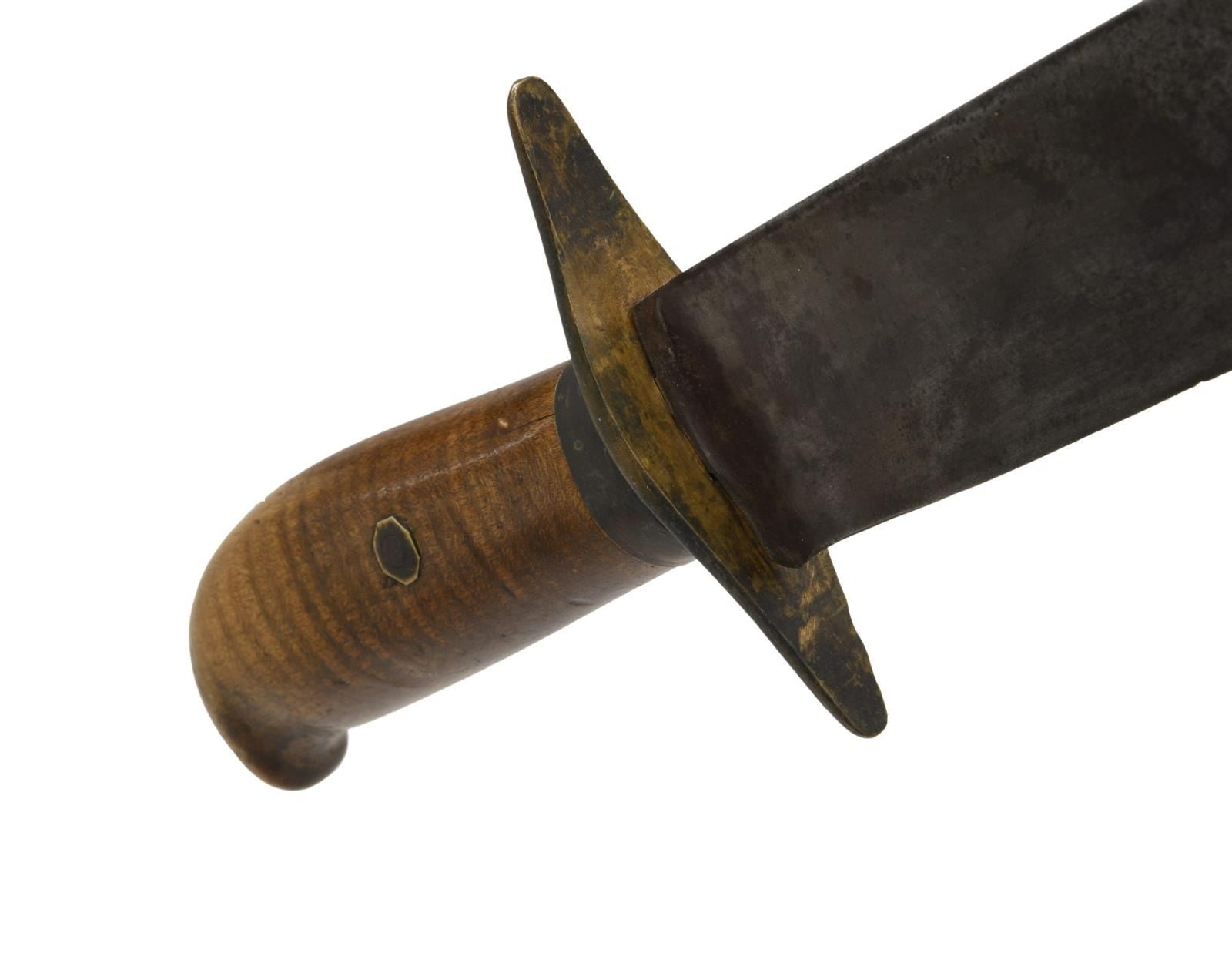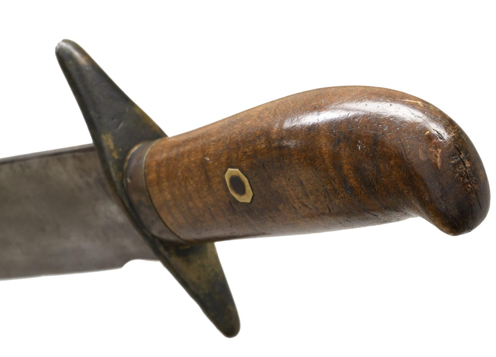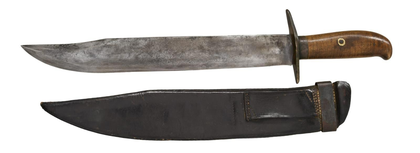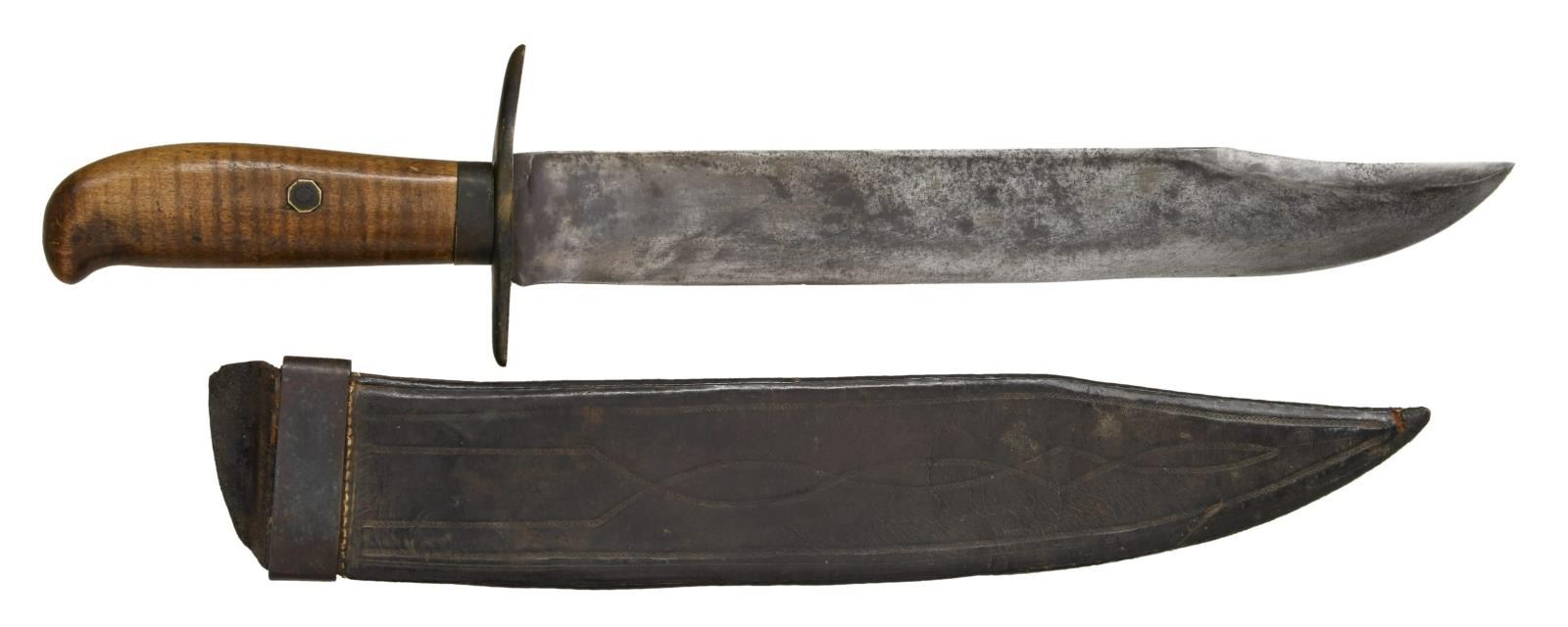 POINT BOWIE KNIFE. 19" overall, 13.5" blade, 4.5" sharpened clip, .25" at ricasso, 1.7" wide, 4" cast brass tapered crossguard, brass ferrule, sculpted birds head Maple grip attached with iron pin held by octagonal brass escutcheons. Tooled leather sheath has 4" belt loop, lap seam braised .75" blued steel ring reinforcing throat. This exact knife is pictured on page 230 of James Johnston's "Accoutrements IV". CONDITION: very good overall, blade has been cleaned and sharpened, accompanying sheath is fine. (02-19974/JS)/ $3,000-4,000.