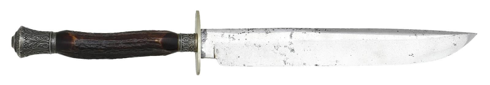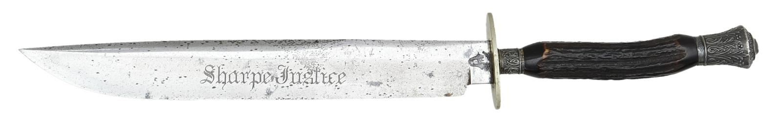 Overall length: 16 1/2". Blade length: 10 3/8". The graceful bowie style blade has a 7" false edge and has a 3" engraving in the center of the blade that reads "Sharpe Justice". The blade's ricasso is heavily stamped with a chest-up view of an English judge with the words "OLD JUDGE" below. German silver, plain elliptical crossguard. Cutlery style hilt with heavily embellished silver pommel & ferrule. The grip is 1-piece darkened horn. No sheath. CONDITION: blade has areas of original factory polish mixed with peppered discoloration. The engraved motto is quite clear, as is the maker's mark on the ricasso. The hilt shows light wear overall. (02-20064/BF). $700-1,200.