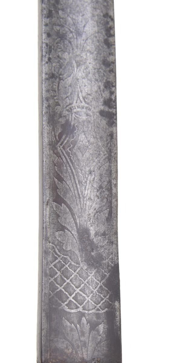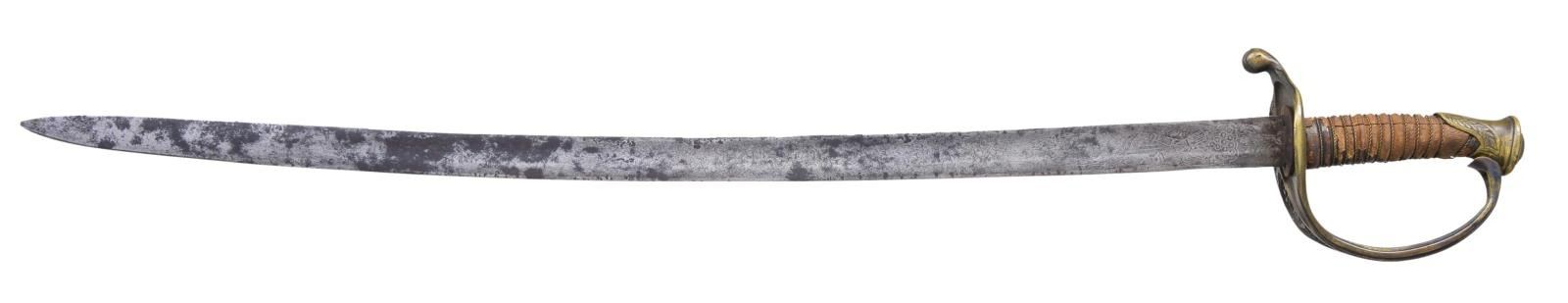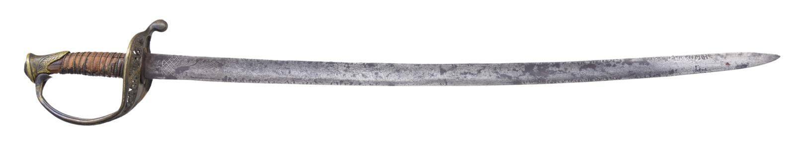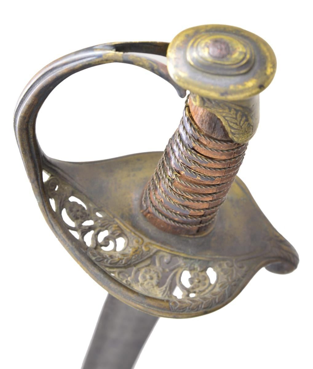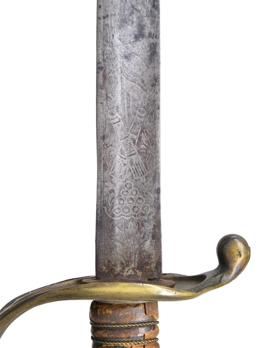 SWORD. Classic New Orleans made Confederate foot officer sword etched panels 23" long on 30" blade with "CS" in pinched ribbon, crossed cannon, 1st national flag. No maker's stamp but all the Dufilho casting features, bulbous undecorated quillon, pommel cast in 2 pieces. This is an honest "as found" sold by well known & knowledgeable Confederate sword collector Lee Gray. CONDITION: good to very good overall "as found", gray blade with discernible etch. Spiral carved wood grip retains about 20% dry original leather with complete twisted wire wrap. Hilt loose due to missing leather washer. (02-19121/JS). $4,000-5,000.