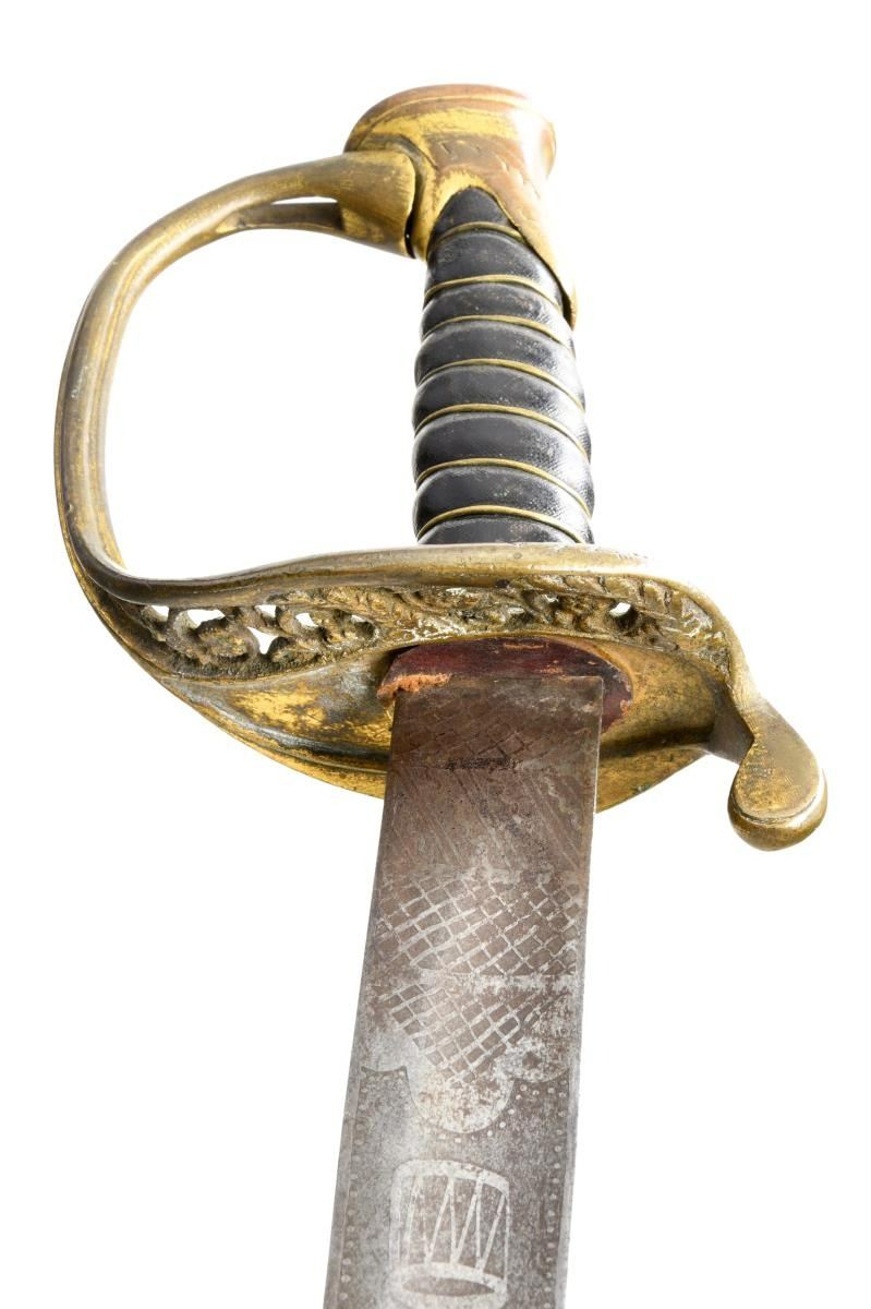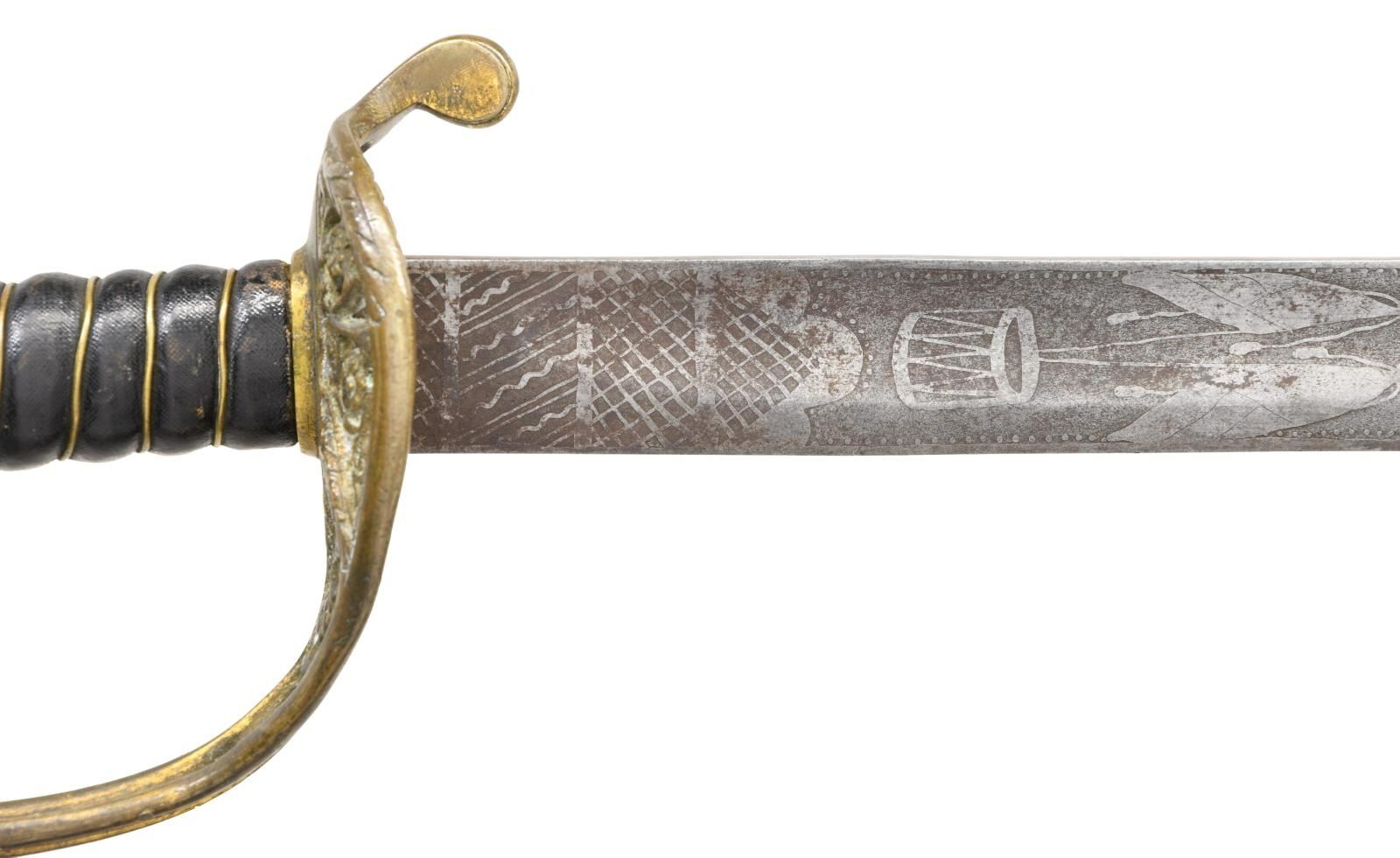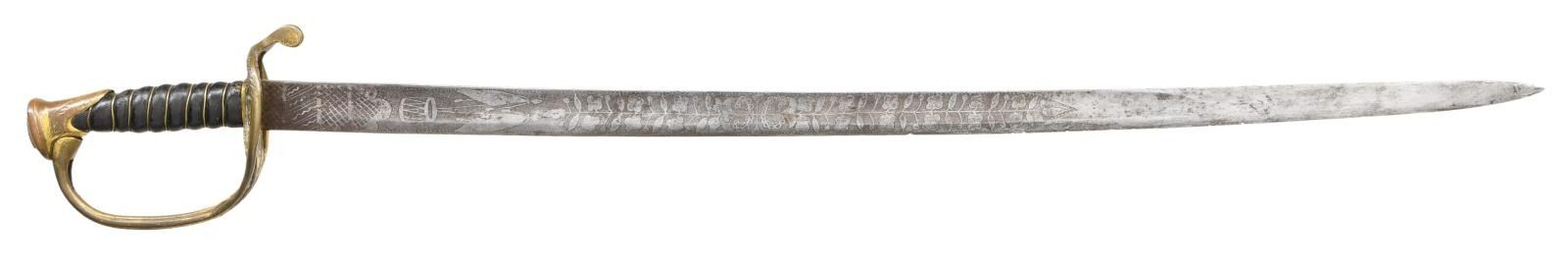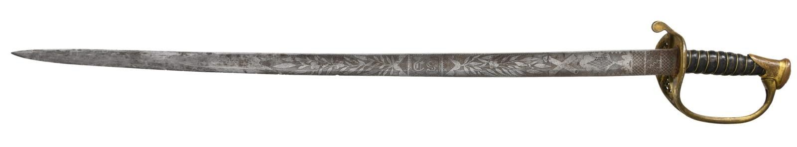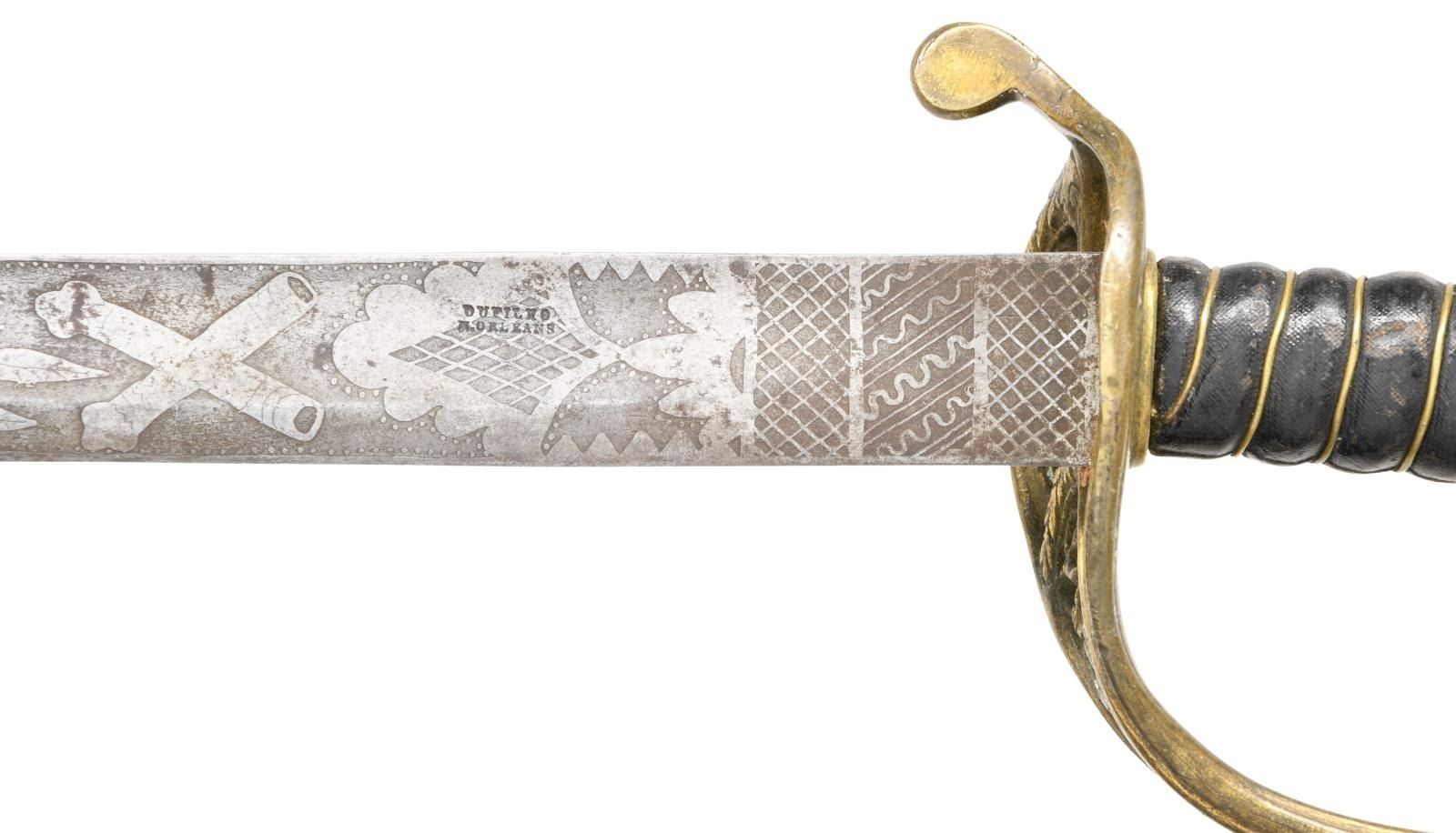 OFFICER'S SWORD, UNIQUE USE OF DUFILHO, NEW ORLEANS SIGNED BLADE. This entire sword was assembled and etched by W J McElroy, classic gold plated McElroy 1850 pattern hilt & pommel with chaste design undecorated pommel & quillon unique to this CS pattern. Grip is classic McElroy with painted canvas covered spiral cut wood & single brass wire wrap. Unique to this sword is McElroy's mounting of "DUFILHO / N. ORLEANS" signed blade. Dufilho was antebellum New Orleans cutler prior to Civil War, making medical instruments & Bowie knives. At onset of war Dufilho made many high grade Confederate swords and were most famous for their unique fancy Louisiana state seal raised relief decorated hilts with large "C" & "S" on either side. Dufilho was only in business till the fall of New Orleans April 29, 1862, so their production was very limited. Macon Georgia made Confederate blades have stopped fullers. How did McElroy come upon this blade to mount & etch. McElroy was known to have etched and mounted at least a few imported cavalry sabers, blades and scabbards, this was part of their business. We will never know why McElroy etched and mounted this blade, we don't know if an officer with a Dufilho foot sword like one later in this sale had battle damaged damage hilt and wanted a beautiful decorative Confederate patriotic etch. Regardless, this unique sword is in beautiful "as found" condition. CONDITION: very good overall, complete grip and wire wrap, traces of gold plate in protected areas, never unhilted, slightly loose, fine etched blade, several small nicks in cutting edge.(02-20973/JS). $8,000-12,000.