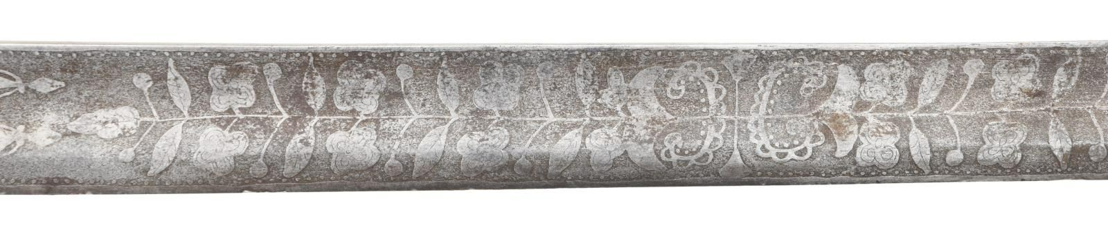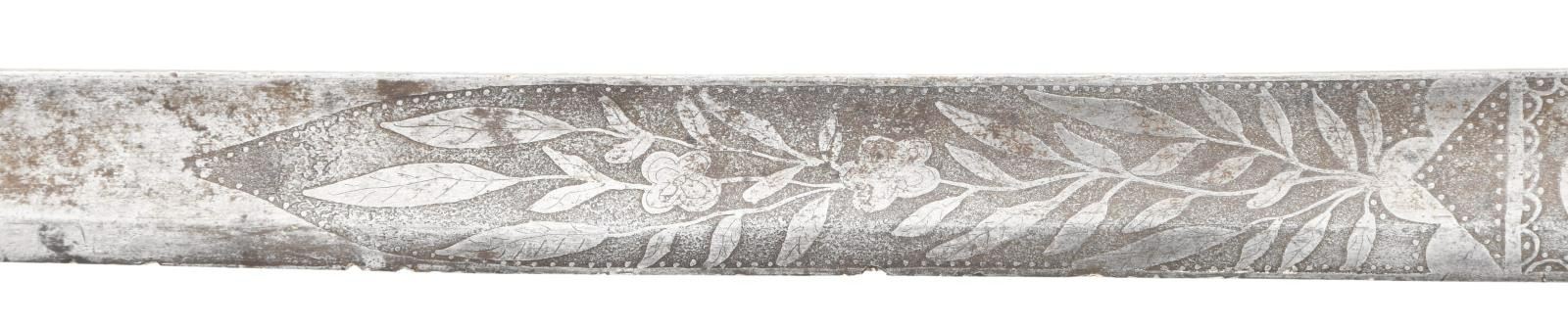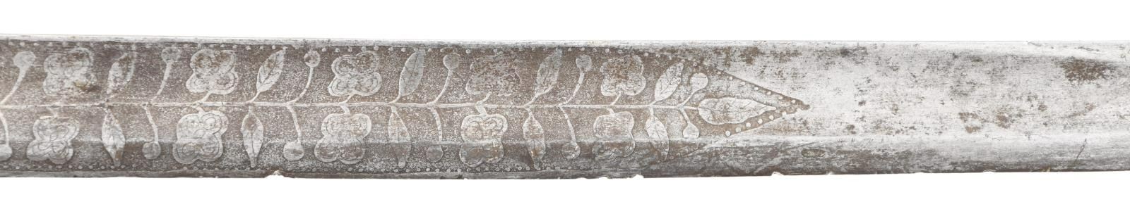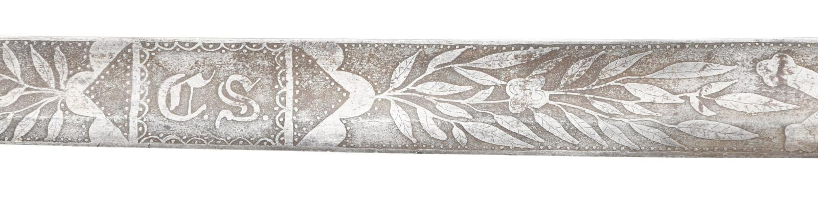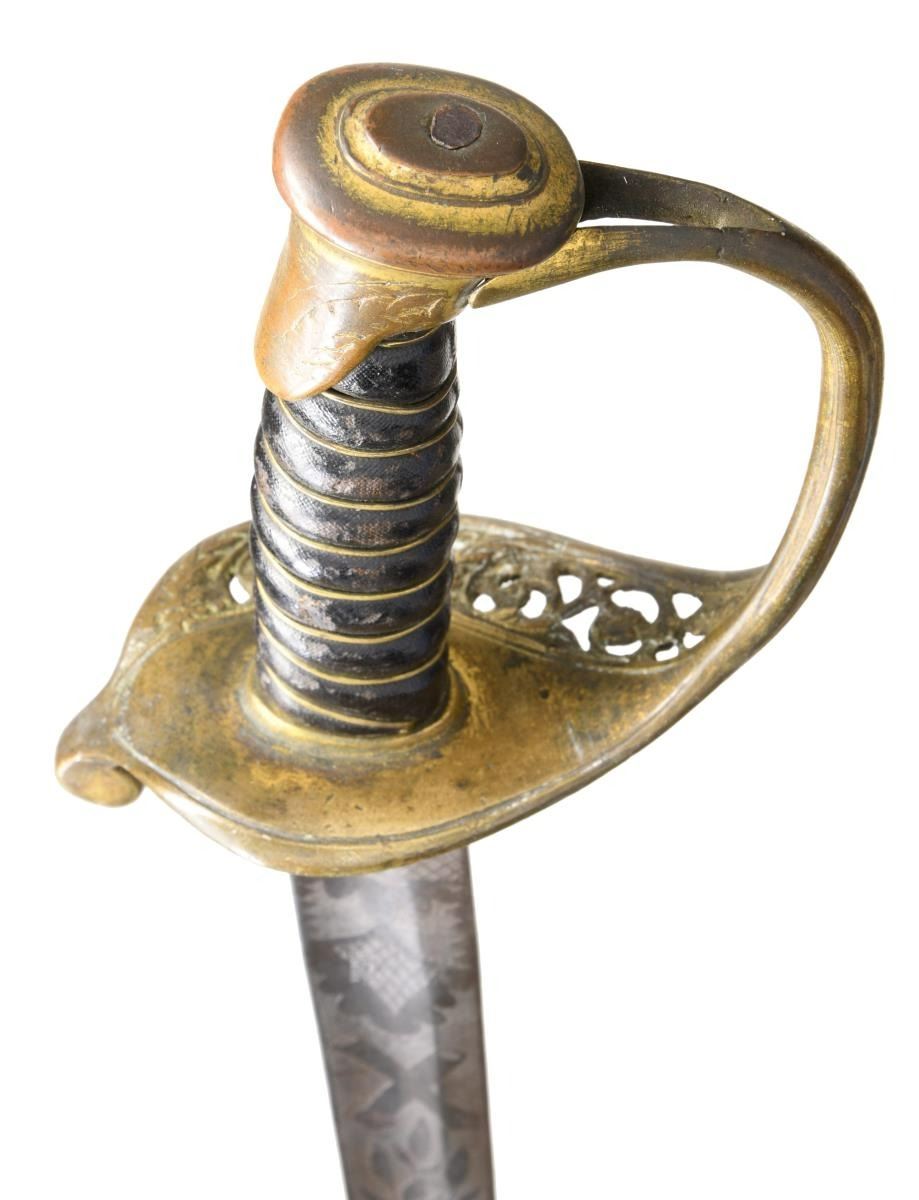 OFFICER'S SWORD, UNIQUE USE OF DUFILHO, NEW ORLEANS SIGNED BLADE. This entire sword was assembled and etched by W J McElroy, classic gold plated McElroy 1850 pattern hilt & pommel with chaste design undecorated pommel & quillon unique to this CS pattern. Grip is classic McElroy with painted canvas covered spiral cut wood & single brass wire wrap. Unique to this sword is McElroy's mounting of "DUFILHO / N. ORLEANS" signed blade. Dufilho was antebellum New Orleans cutler prior to Civil War, making medical instruments & Bowie knives. At onset of war Dufilho made many high grade Confederate swords and were most famous for their unique fancy Louisiana state seal raised relief decorated hilts with large "C" & "S" on either side. Dufilho was only in business till the fall of New Orleans April 29, 1862, so their production was very limited. Macon Georgia made Confederate blades have stopped fullers. How did McElroy come upon this blade to mount & etch. McElroy was known to have etched and mounted at least a few imported cavalry sabers, blades and scabbards, this was part of their business. We will never know why McElroy etched and mounted this blade, we don't know if an officer with a Dufilho foot sword like one later in this sale had battle damaged damage hilt and wanted a beautiful decorative Confederate patriotic etch. Regardless, this unique sword is in beautiful "as found" condition. CONDITION: very good overall, complete grip and wire wrap, traces of gold plate in protected areas, never unhilted, slightly loose, fine etched blade, several small nicks in cutting edge.(02-20973/JS). $8,000-12,000.