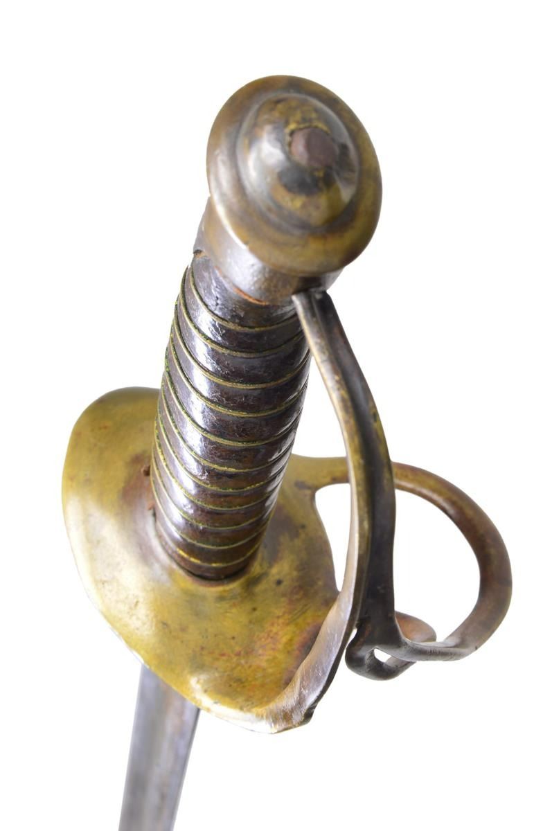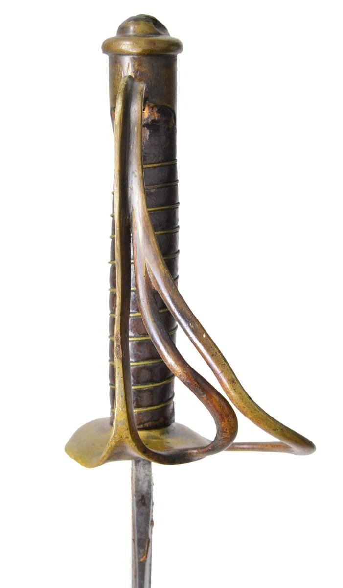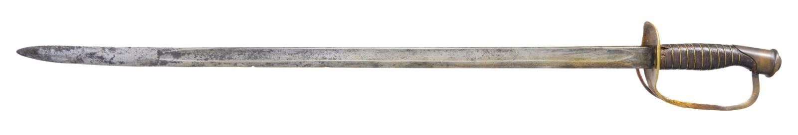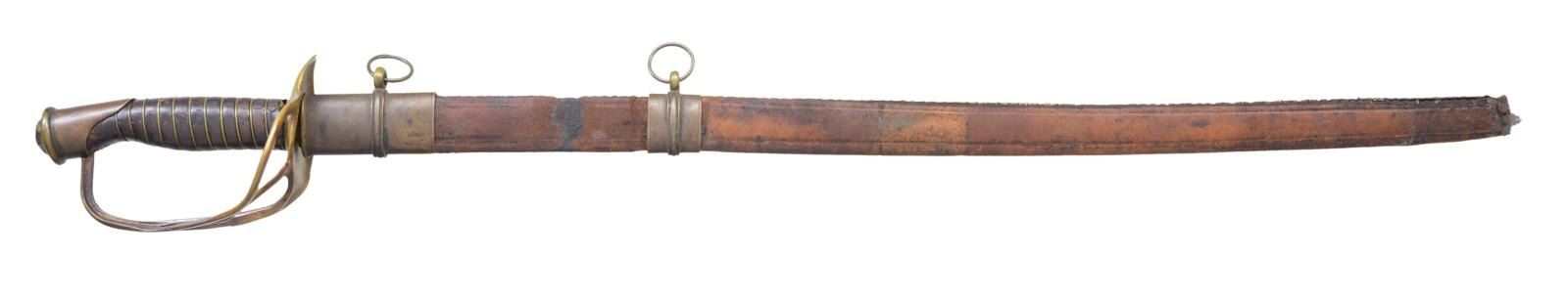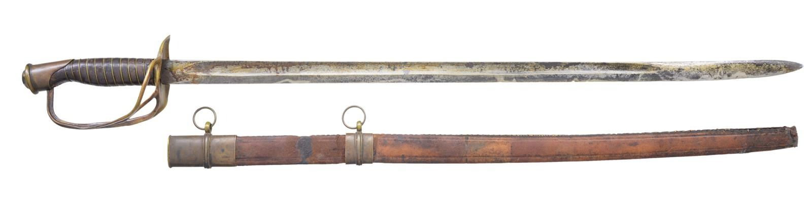 29.75" unstopped fuller straight heavy blade. Hilt is BG&M branched cavalry with their unique convex downward cupped guard. CONDITION: very good overall, gray blade with staining, old sharpening, rounded point, small nicks in cutting edge. Original grip retains virtually all its original leather and tight single strand brass wire wrap. Well disguised braised repair to knuckle guard. The accompanying brass mounted leather scabbard fits sword well, missing drag, dark patina to mounts, heavily scuffed, seam unsewn. This is rare wartime combination of BG&M cavalry hilt with straight officer's blade, much more common on US swords. (02-19149/JS). $3,000-4,000.