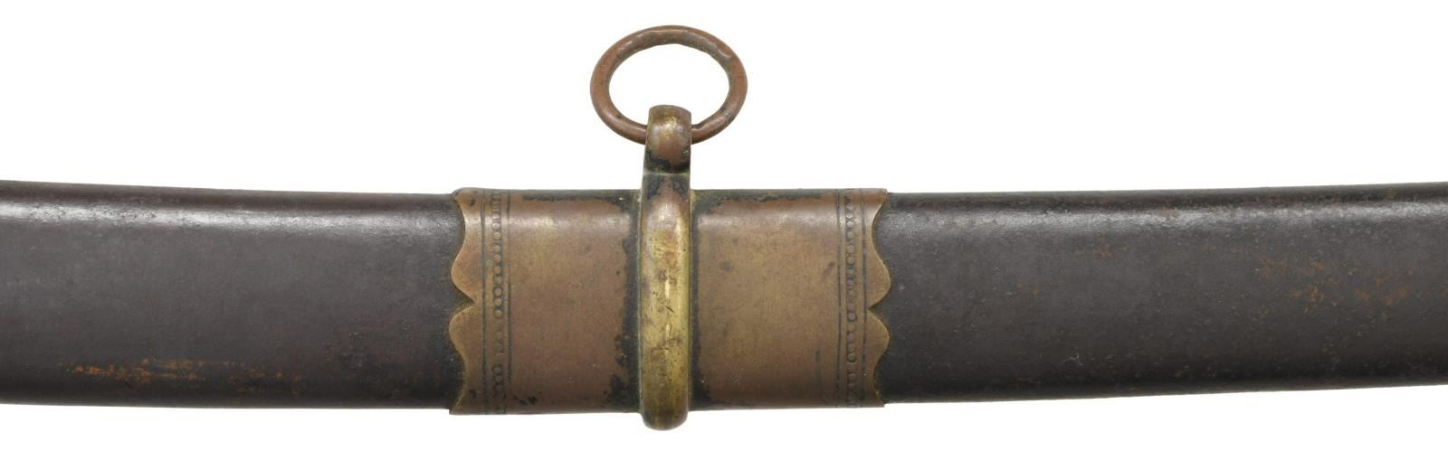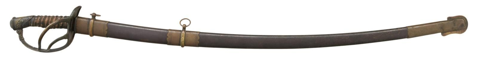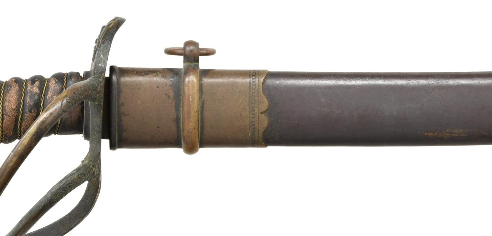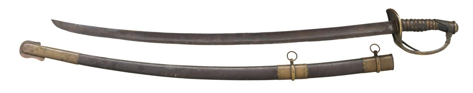 GRISWOLD. Overall length: 43 1/2". Blade length: 33 1/2". The unmarked blade has a single wide fuller with no secondary fuller. Brass hilt with a 2-branch guard showing foliate embellishments on the lower section of both branches. The quillon area has leaf embellishments. The knuckle bow has floral & leaf embellishments as it enters the pommel. Acanthus leaf decorated pommel with central flower showing the characteristic split seam. Replacement wire-wrapped leather grip. This sword has a very interesting brass mounted iron scabbard that is not typical of Griswold production, but does fit the sword extremely well and has a matching patina. CONDITION: blade has a dark patina with areas of crusty oxidation. Hilt has a very dark patina and is a bit loose. Grip has been skillfully replaced with artificial aging. Scabbard has a dark patina on the brass areas and an oxidized patina on the iron body. (02-19169/BF). $2,000-3,500.