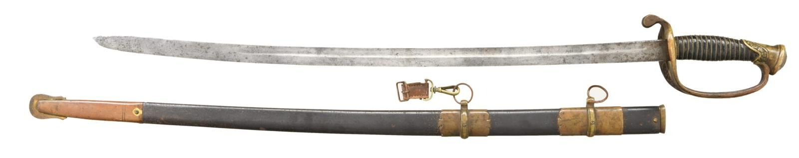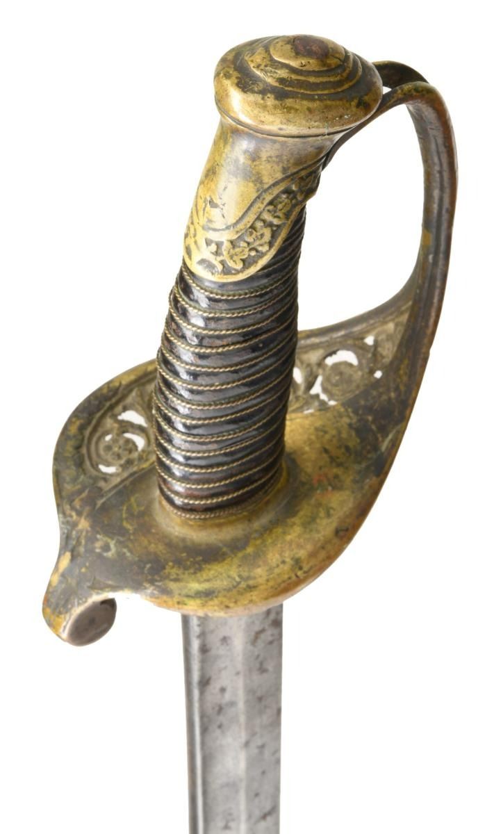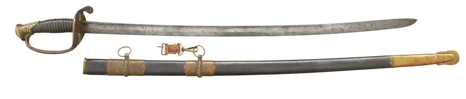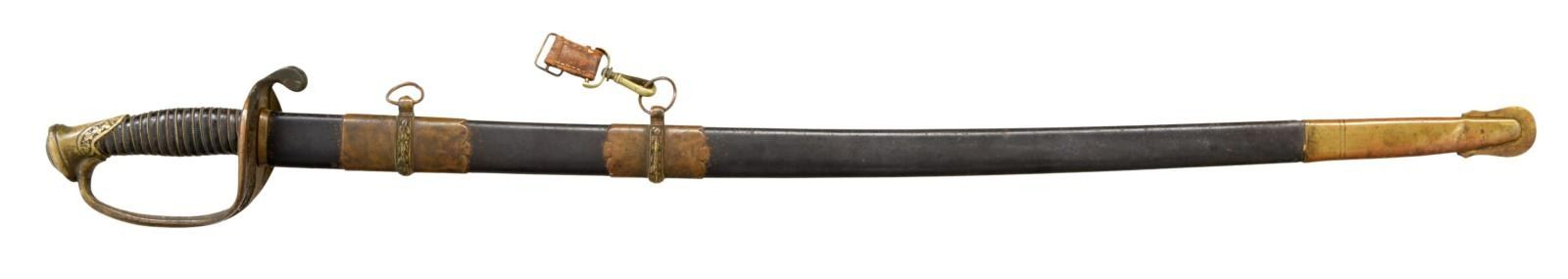 BROTHERS OR MITCHELL & TYLER OF RICHMOND, VIRGINIA. Overall length: 39 1/2". Blade length: 30". Blade has a single medium, unstopped fuller. Gilded brass hilt with pierced counterguard showing floral & foliate motifs. Heavy downturned quillon & plain quatrefoil section knuckle bow. Knuckle bow has a knot slot as it nears the pommel. Pommel has an ivy leaf motif with a stepped pommel cap. Wire-wrapped leather grip. This Confederate officer likely lost or broke his scabbard on the battlefield and salvaged this one from a Yankee foot officer's sword. The sword fits well and the patinas match nicely. The scabbard is a gilded brass mounted, metal scabbard with a dark brown finish. CONDITION: blade has a medium gray, mottled patina. The hilt shows only traces of original gilding and remains undamaged. Grip leather is 90% and the wire is complete. Scabbard mounts show only traces of original gilding. Scabbard body remains quite solid. (02-20059/BF). $1,800-2,600.