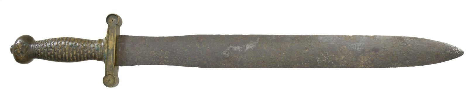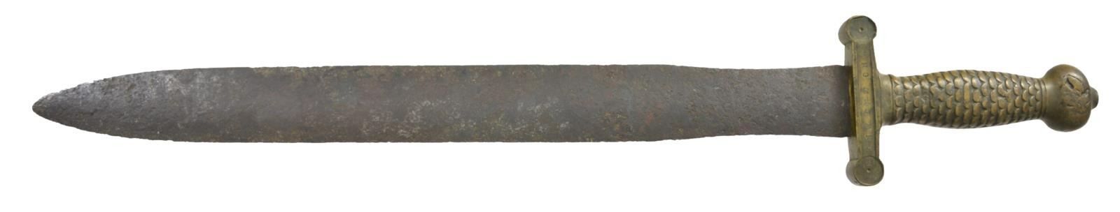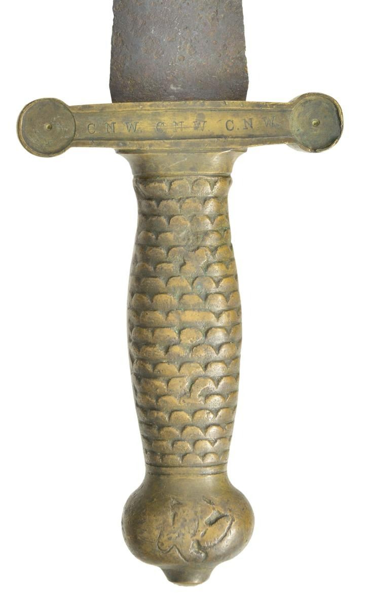 GUARD. Made in style of model 1832 US with partially discerned cast eagles in pommel, 24.5" overall, 19" double edged wasp-waist blade hollow cast feathered grip. Stamped 3 times on cross guard "C.N.W.". CONDITION: good overall, heavy pitted blade, mottled brass patina. (02-19098/JS). $1,500-1,800.