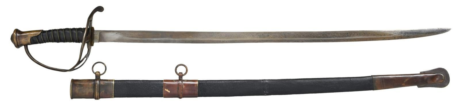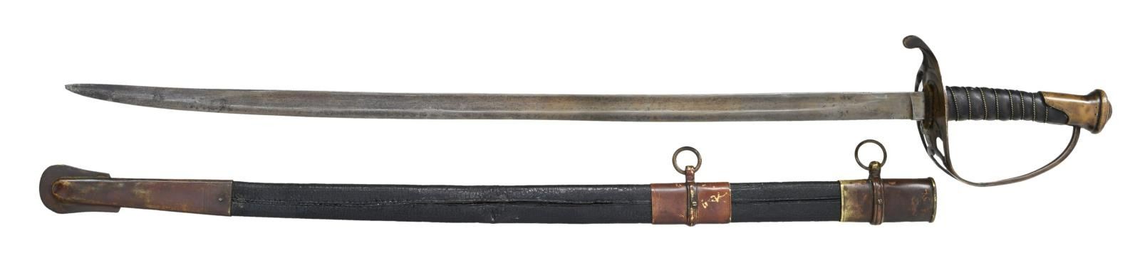 ARSENAL. Overall length: 36 1/4". Blade length: 28 1/2". The College Hill Arsenal was operated by L.T. Cunningham of Nashville, TN. In 1861, Cunningham organized an arsenal on College Hill in Nashville, w/ an advance from the State of Tennessee, to mfg. swords. This example has a plain blade w/ a single, lg. unstopped fuller. 3 Branch brass hilt showing "CSA" on a stippled field on the underside of the guard. The 3 branches flow into a plain knuckle bow which in turn enters a plain pommel cap. Wire wrapped leather grip. Brass mounted leather scabbard. CONDITION: blade has a medium gray, cleaned patina. Hilt has a dark, aged brass patina throughout. The grip is a quality replacement made to resemble the original College Hill grip. The scabbard is of US or European mfg. & was not originally associated w/ this sword. The center mount is replaced & artificially aged. The scabbard body remains solid but flexed. There are several minor dents in the drag. (02-19964/BF). $3,000-4,000.