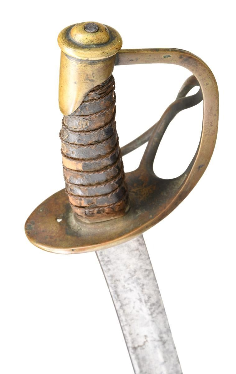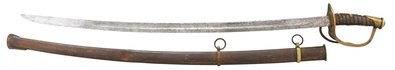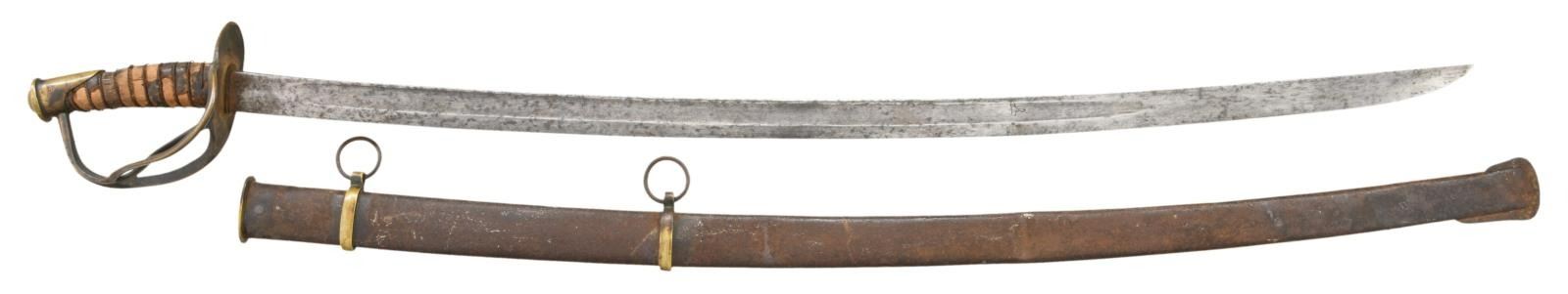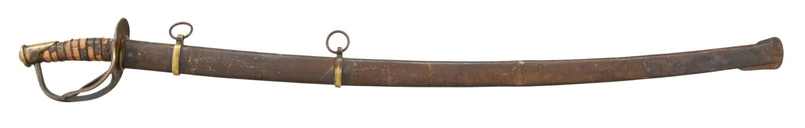 Overall length: 42". Blade length: 34 1/2". Probably the best-known Confederate cavalry saber is the Dog River saber. For many years, this term covered all Confederate cavalry sabers not attributed to a specific arsenal or manufactory. Today, the traits of the Dog River saber are more recognizable and research is ongoing as to the origin of these and similar sabers. Plain blade with a single wide, unstopped fuller. Brass hilt with an oval guard. Plain knuckle bow with 2 similar plain branches. Phrygian helmet pommel. Iron wire wrapped leather grip. Iron scabbard with crude lap seam at the base, brass mounts, and iron suspension rings. There is a large brass throat and an iron drag. CONDITION: blade has a mottled medium gray, lightly cleaned patina with no evidence of notable pitting. Hilt has a mellow mustard patina and is slightly misshaped. 35% of the grip leather remains with all of the twisted iron wire and nearly all of the core intact. Scabbard has an oxidized blackened finish with 2 minor dents and a small hole near the first mount. (02-20018/BF). $2,600-3,400.