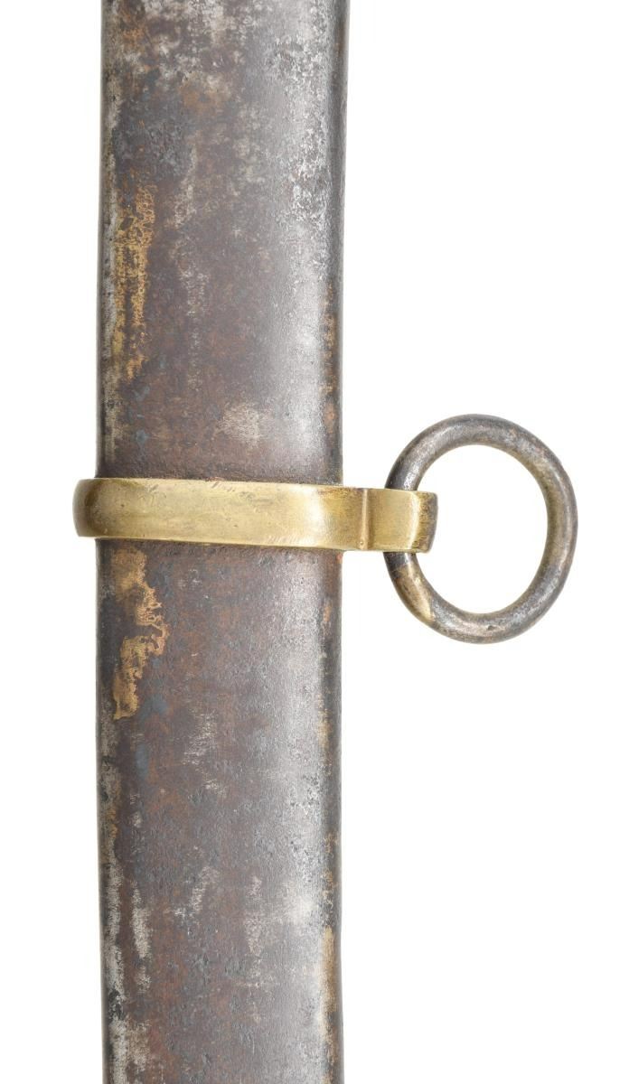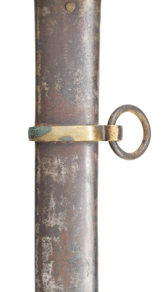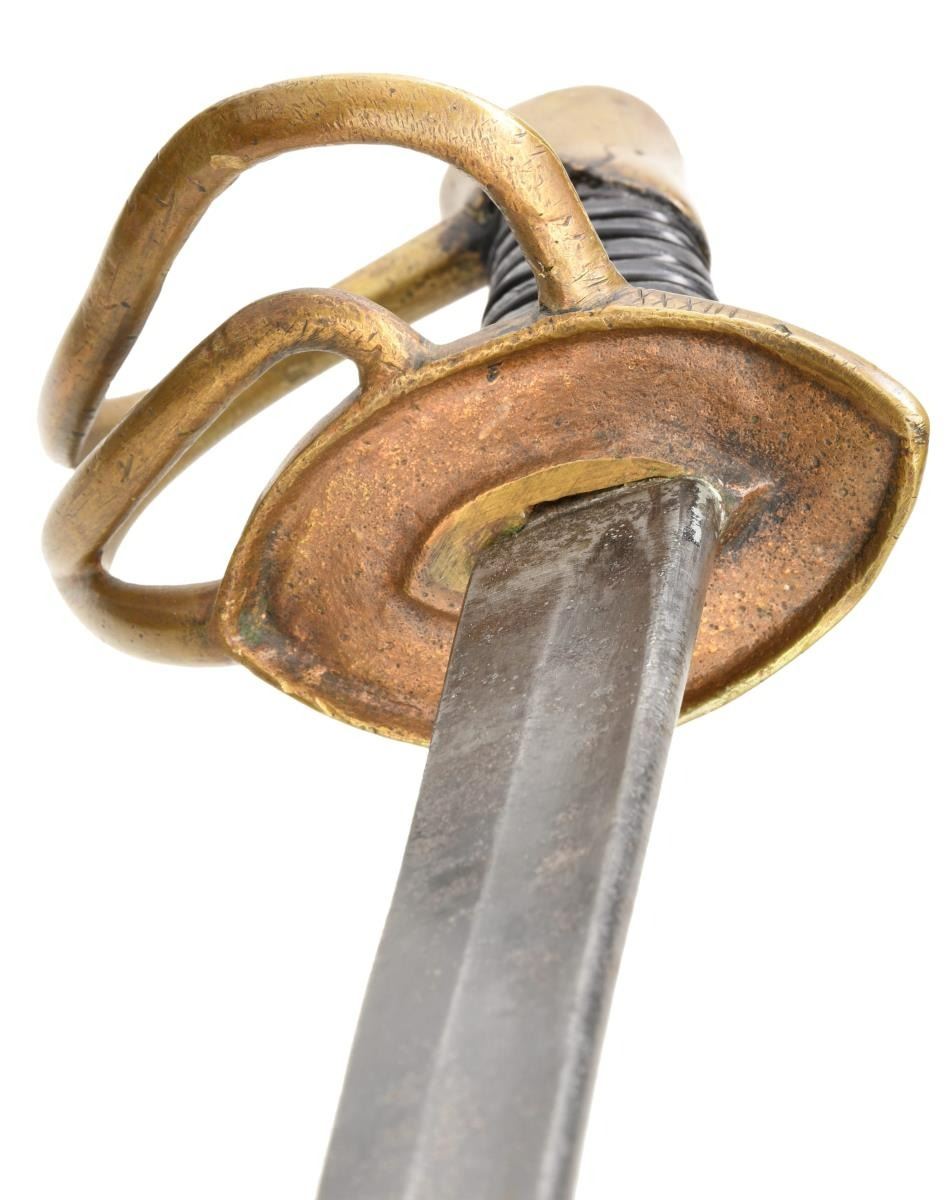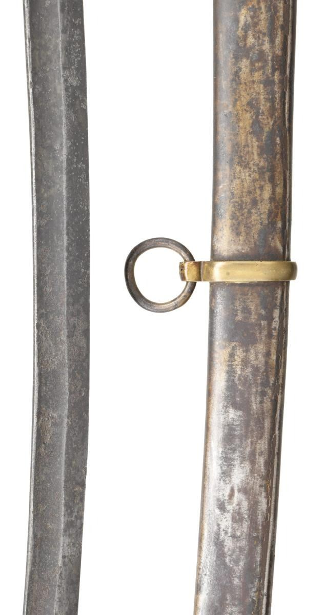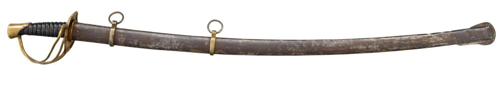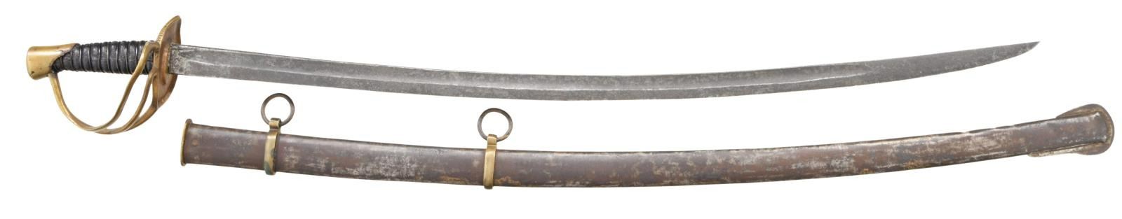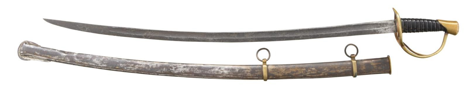Overall length: 41 1/2". Blade length: 33 3/4". A classic Confederate cavalry saber, typical of the production of the Confederate sword factory at Kenansville, NC. Plain blade with a single wide, unstopped fuller. Brass hilt with elliptical guard showing Roman numerals on the edge. Plain knuckle bow with 2 similar plain branches. Smooth pommel. Leather grip with iron wire wrap. Iron scabbard with crude lap seam at the base. Brass mounts with iron suspension rings and a brass throat with iron drag. CONDITION: blade has a dark patina with some evidence of cleaned pitting. Hilt has a pleasing mustard patina and is very slightly misshaped. Grip leather shows moderate wear and the wire wrap is complete. It appears that the grip had a substantial drying crack that was filled at some point in the sword's history. Scabbard has a cleaned, oxidized finish with no notable dents. Mounts have a pleasing, light mustard patina. (02-20024/BF). $2,600-3,400.