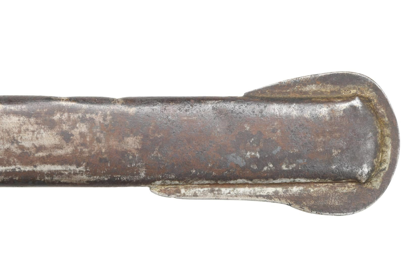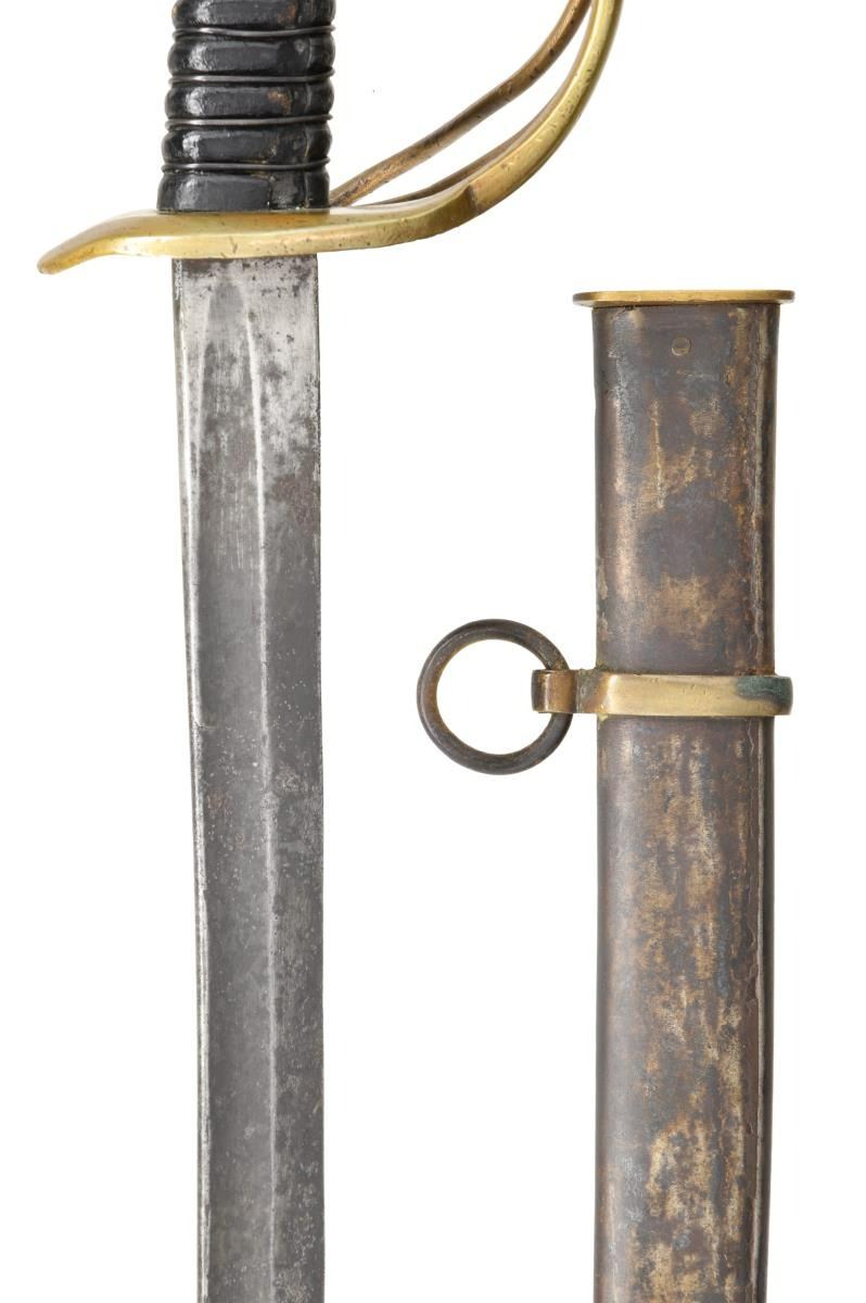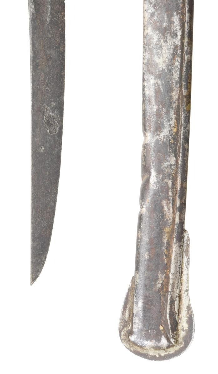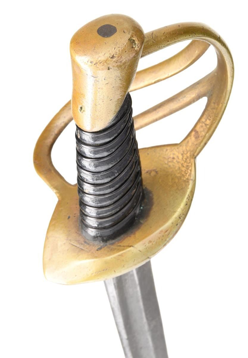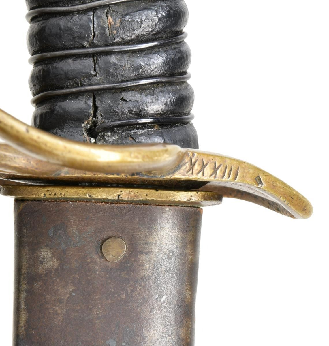 Overall length: 41 1/2". Blade length: 33 3/4". A classic Confederate cavalry saber, typical of the production of the Confederate sword factory at Kenansville, NC. Plain blade with a single wide, unstopped fuller. Brass hilt with elliptical guard showing Roman numerals on the edge. Plain knuckle bow with 2 similar plain branches. Smooth pommel. Leather grip with iron wire wrap. Iron scabbard with crude lap seam at the base. Brass mounts with iron suspension rings and a brass throat with iron drag. CONDITION: blade has a dark patina with some evidence of cleaned pitting. Hilt has a pleasing mustard patina and is very slightly misshaped. Grip leather shows moderate wear and the wire wrap is complete. It appears that the grip had a substantial drying crack that was filled at some point in the sword's history. Scabbard has a cleaned, oxidized finish with no notable dents. Mounts have a pleasing, light mustard patina. (02-20024/BF). $2,600-3,400.