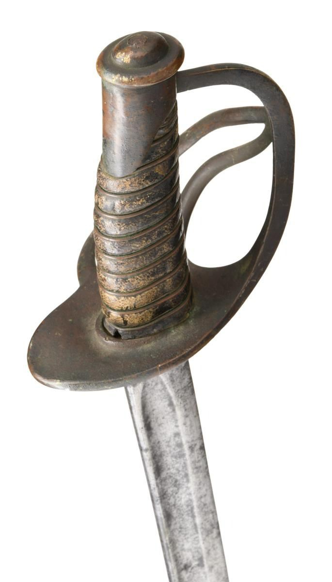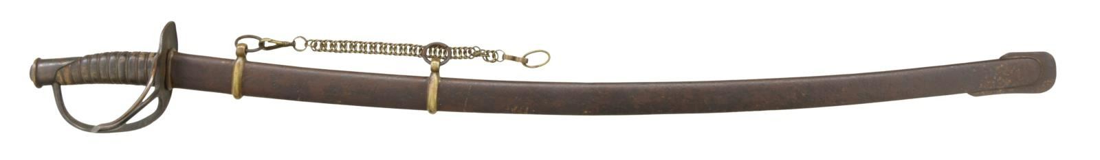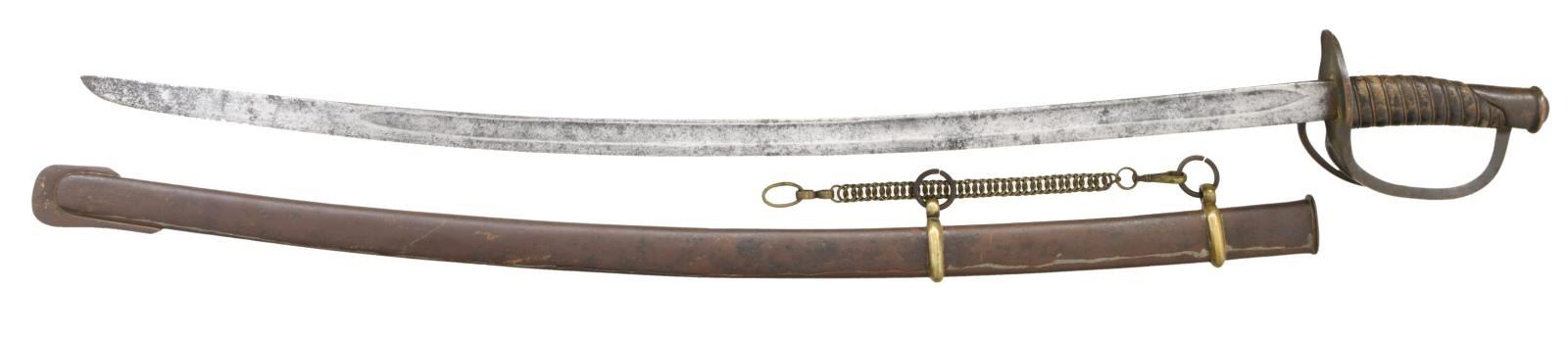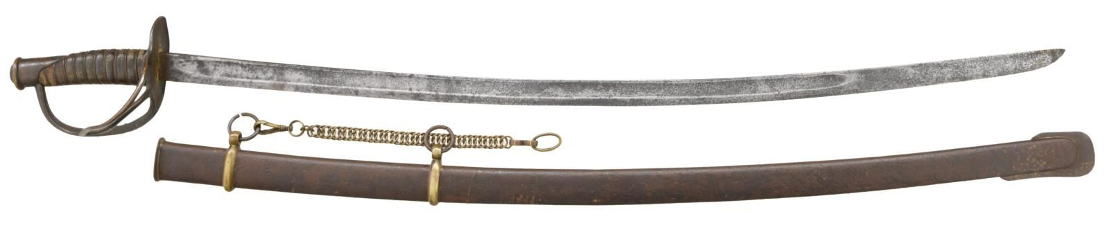 Overall length: 42 3/8". Blade length: 35 1/4". Probably the best-known Confederate cavalry saber is the Dog River saber. For many years, this term covered all Confederate cavalry sabers not attributed to a specific arsenal or manufactory. Today, the traits of the Dog River saber are more recognizable and research is ongoing as to the origin of these and similar sabers. Plain blade with a single wide, unstopped fuller. Coppery brass hilt with an oval guard. Plain knuckle bow with 2 similar plain branches. Phrygian helmet pommel. Copper wire wrapped leather grip. Iron scabbard with crude lap seam at the base. Brass mounts, iron suspension rings, iron throat, and iron drag. There is a single sword chain attached to the top suspension ring. CONDITION: blade has a medium gray patina with evidence of very light, cleaned pitting. Hilt has a dark overall patina with tones of copper showing through. Grip appears to be a skillful rewrap. Wire is complete. Scabbard has a pitted, oxidized finish but remains quite solid with no dents.(02-20017/BF). $2,400-3,200.