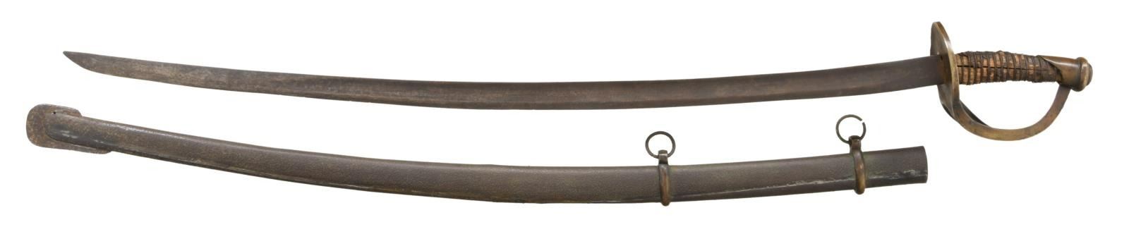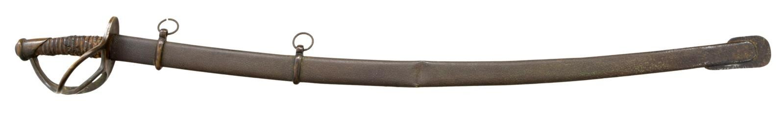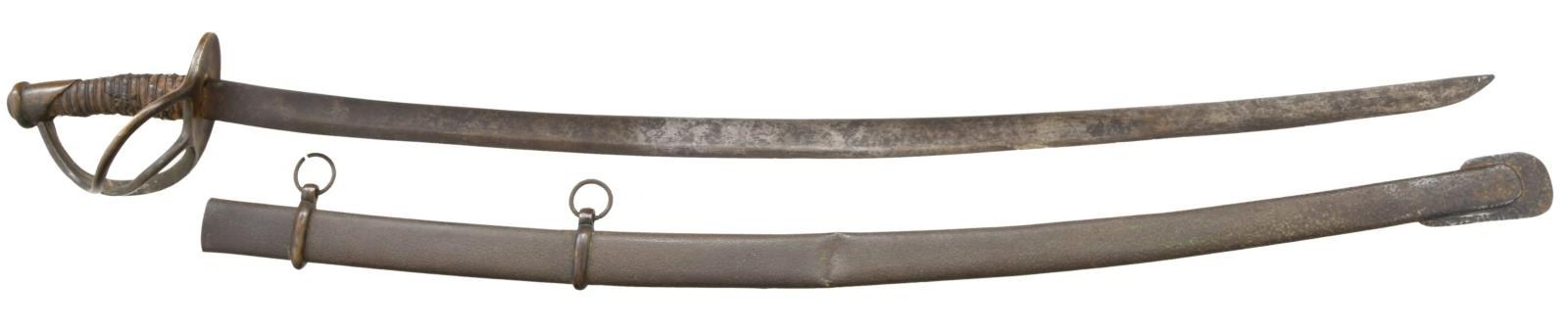 Overall length: 43". Blade length: 35 5/8". The best-known Confederate cavalry saber is the Dog River saber. For many years, this term covered all Confederate cavalry sabers not attributed to a specific arsenal or manufactory. Recent research may attribute this cavalry saber to L. Haiman & Brother, Columbus, GA. Plain blade with a single wide, unstopped fuller. Brass hilt with an oval guard. Plain knuckle bow with 2 similar plain branches. Phrygian helmet pommel. Iron wire wrapped leather grip. Iron scabbard with crude lap seam at the base, brass mounts, and iron suspension rings. This scabbard does not have a throat, but does have a large iron drag. CONDITION: blade has a dark, mottled patina but no evidence of severe pitting. Hilt has an overall dark mustard patina. The grip leather is approx. 25% and the wire is complete. Scabbard has an overall dark oxidized & pitted finish. There is a large dent at the mid-point that appears to be reinforced with a dab of epoxy. The seam of the scabbard also appears to be reinforced with a bead of epoxy. (02-20015/BF). $2,200-2,600.