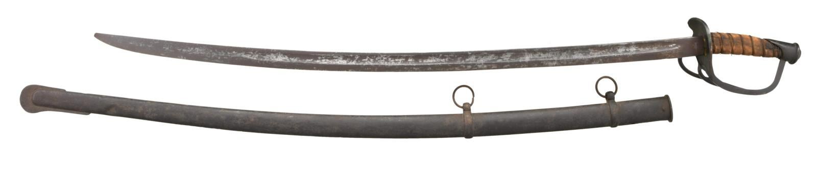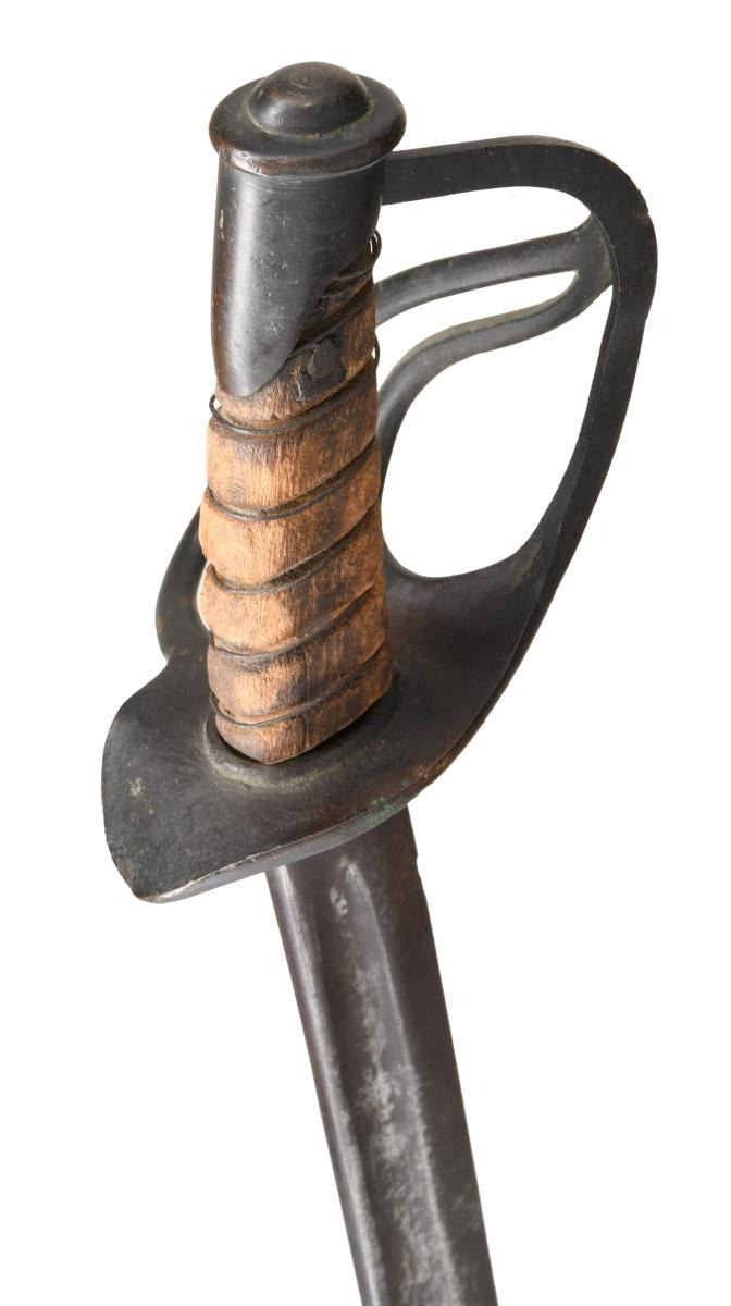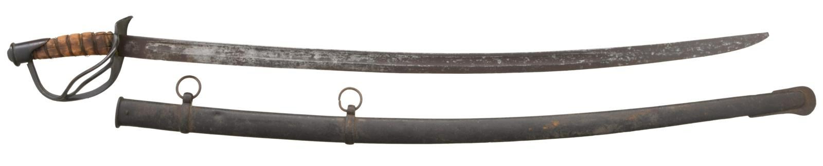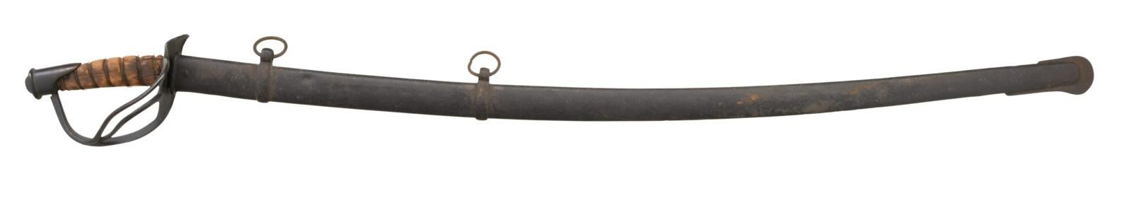 Overall length: 43 3/4". Blade length: 35". Probably the best-known Confederate cavalry saber is the Dog River saber. For many years, this term covered all Confederate cavalry sabers not attributed to a specific arsenal or manufactory. Today, the traits of the Dog River saber are more recognizable and research is ongoing as to the origin of these and similar sabers. Plain blade with a single wide, unstopped fuller. Brass hilt with an oval guard. Plain knuckle bow with 2 similar plain branches. Phrygian helmet pommel. Iron wire wrapped leather grip. Iron scabbard, likely originally from an import M1840 cavalry saber. Iron mounts with iron suspension rings and an iron throat with iron drag. CONDITION: blade has a dark mottled gray/brown patina with no evidence of notable pitting. The extreme tip of the blade is broken. Hilt has an exceptionally dark patina and is misshaped. Only a trace of grip leather remains, but the wire is complete. The wooden core remains substantially solid. Scabbard has an oxidized blackened finish with 2 minor dents and a small hole near the first mount. (02-20019/BF). $1,400-1,800.