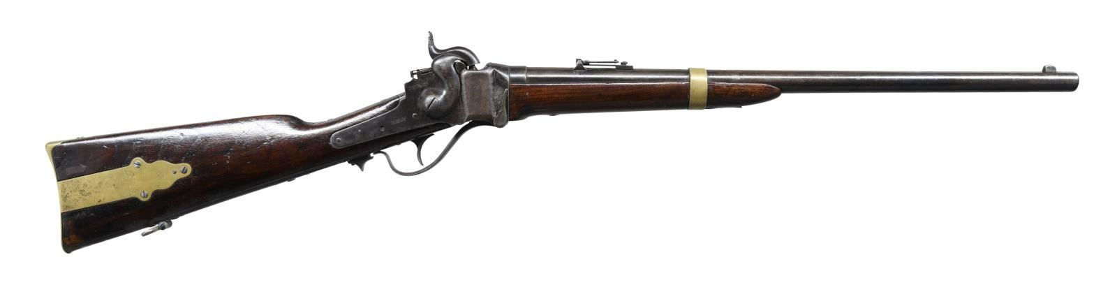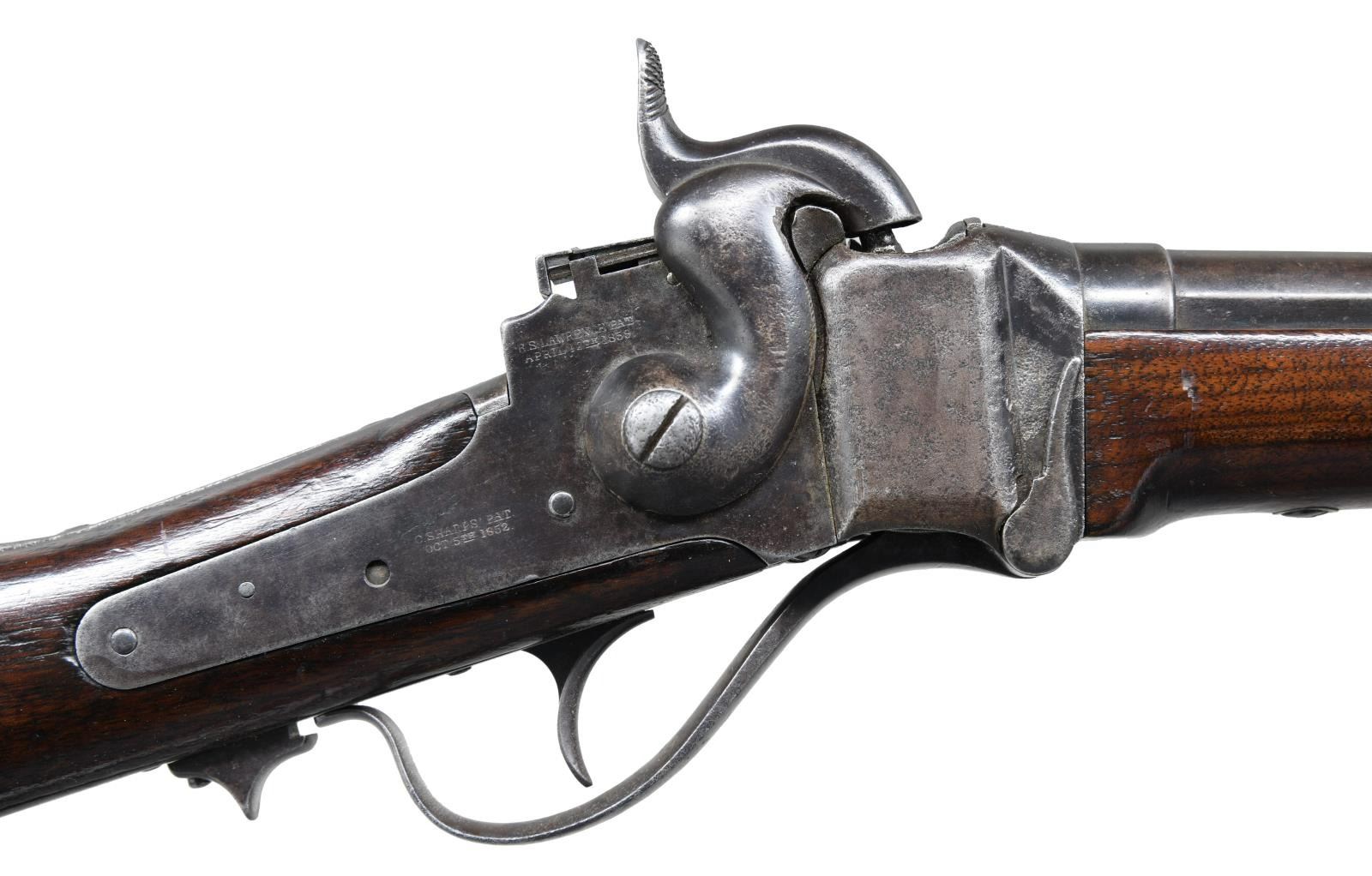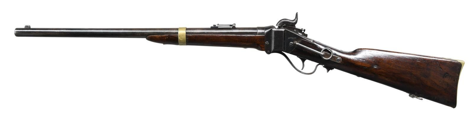CAL. 52. S# 36090. Serial numbers for the "New Model" straight breech variations began at 30,000 with much overlap between all three "New Models" The early type New Model 1859 Carbines feature all brass furniture. Approx 3000 were made. The state of GA bought a total of 1600 from Sharps in 1860 and are known to have been issued to GA cavalry and infantry units during the Civil War. Fitted with a 22" bbl and lock integrated Sharps pellet priming system. CONDITION: Metal surfaces of this early carbine have fading finish and fine pitting over much of the coverage. Stock has been refinished with added varnish and repaired at the toe and forearm with some added wood filler. Replaced fire blue bbl band retention spring. Brass components have a matching mellow patina and scattered handling marks. Dark bore with pitting. PROVENANCE: From the Lifelong Collection of Glen E. Mattox. (01-22505/ZAL) ANTIQUE $2000-3000
